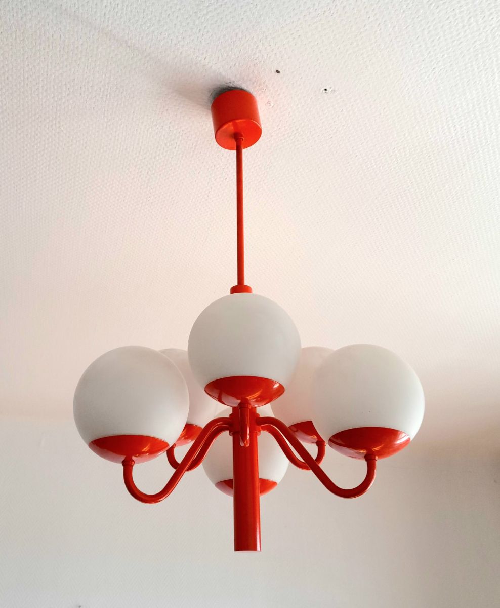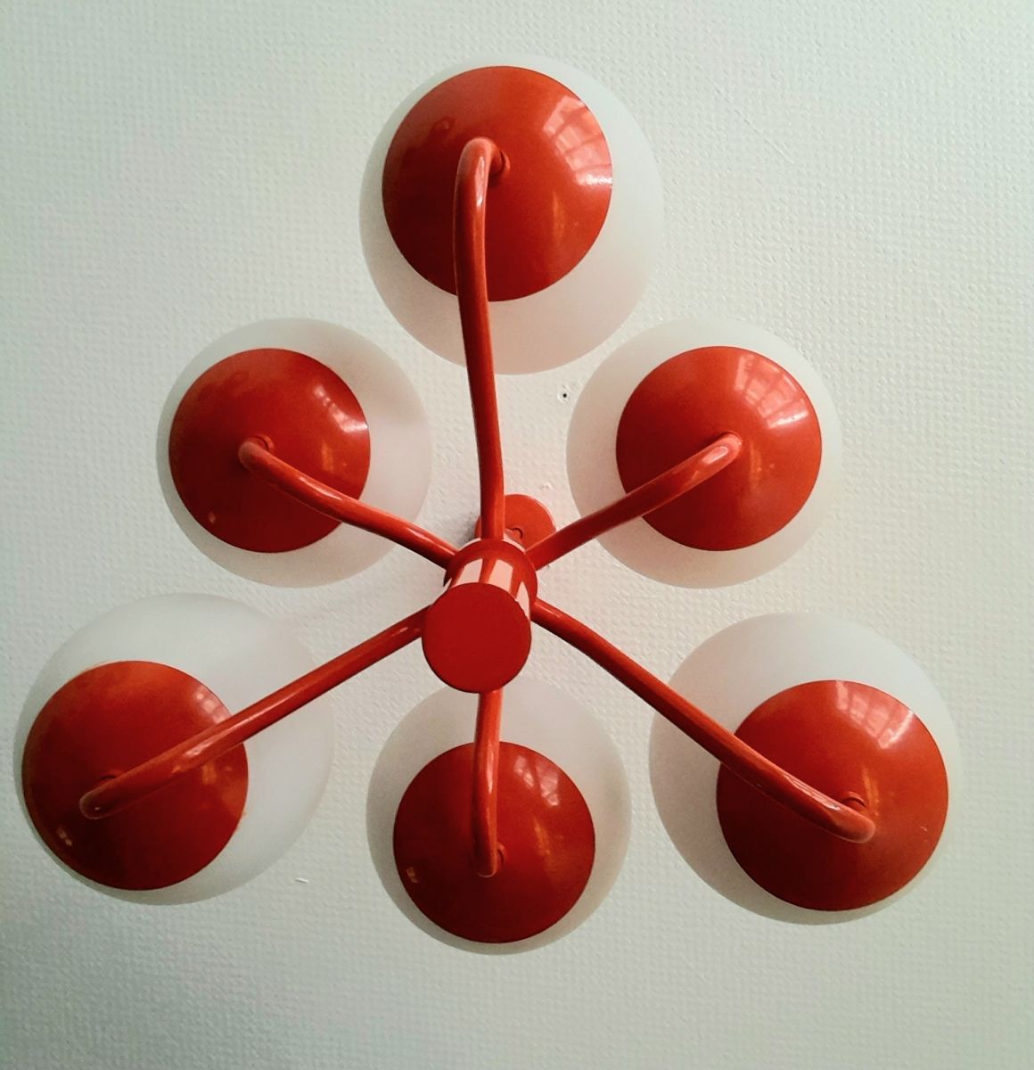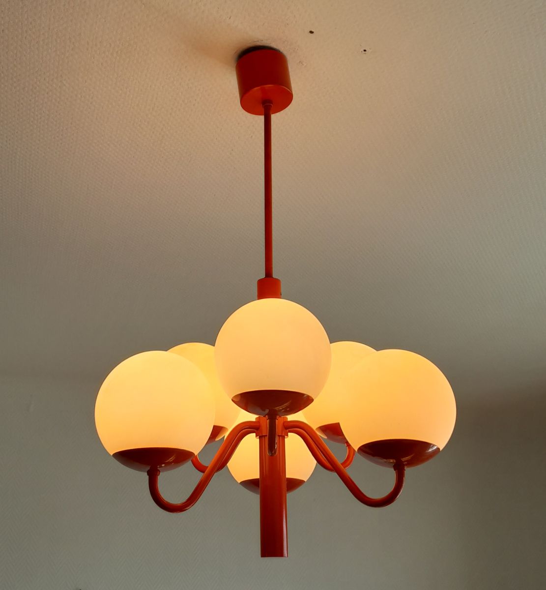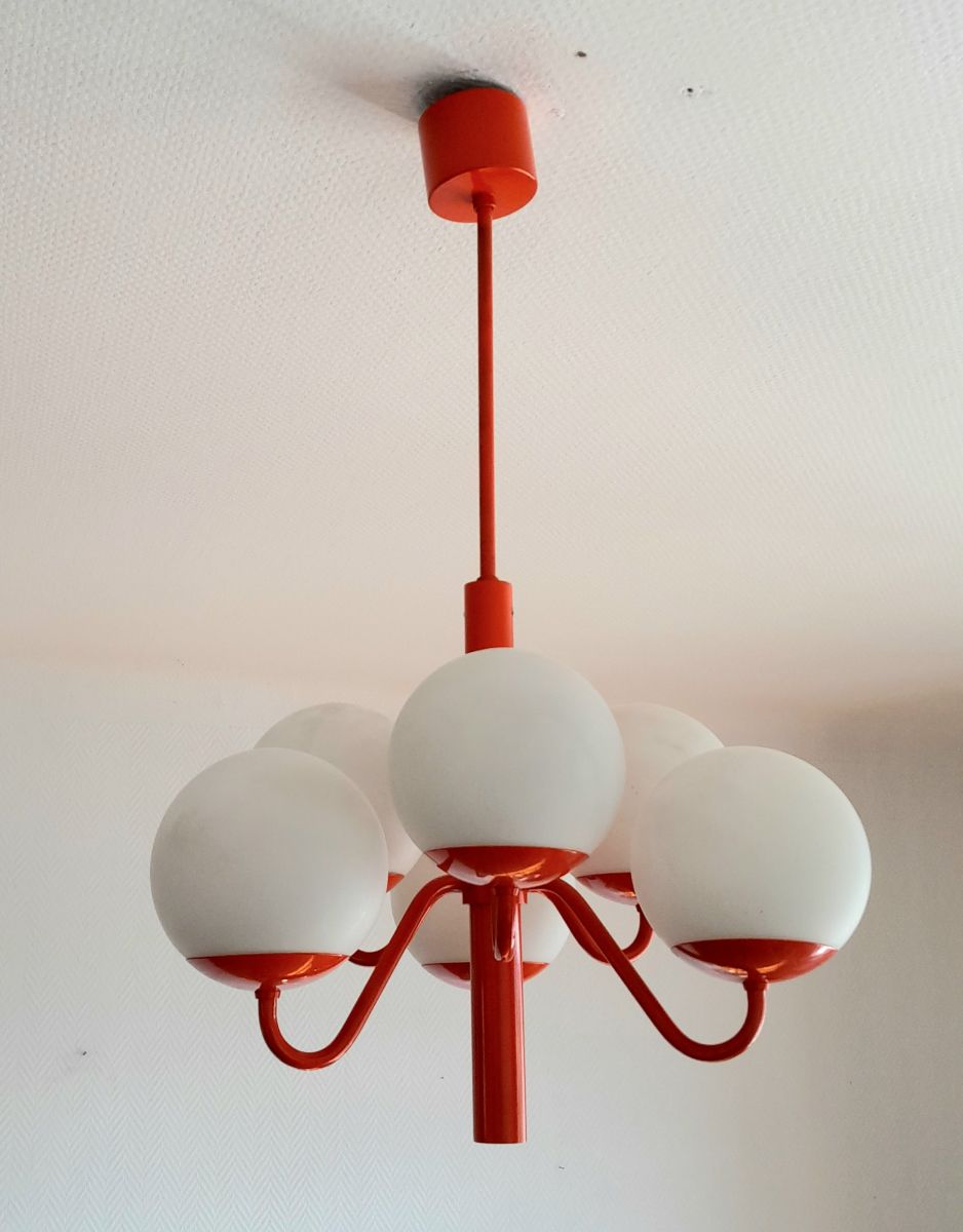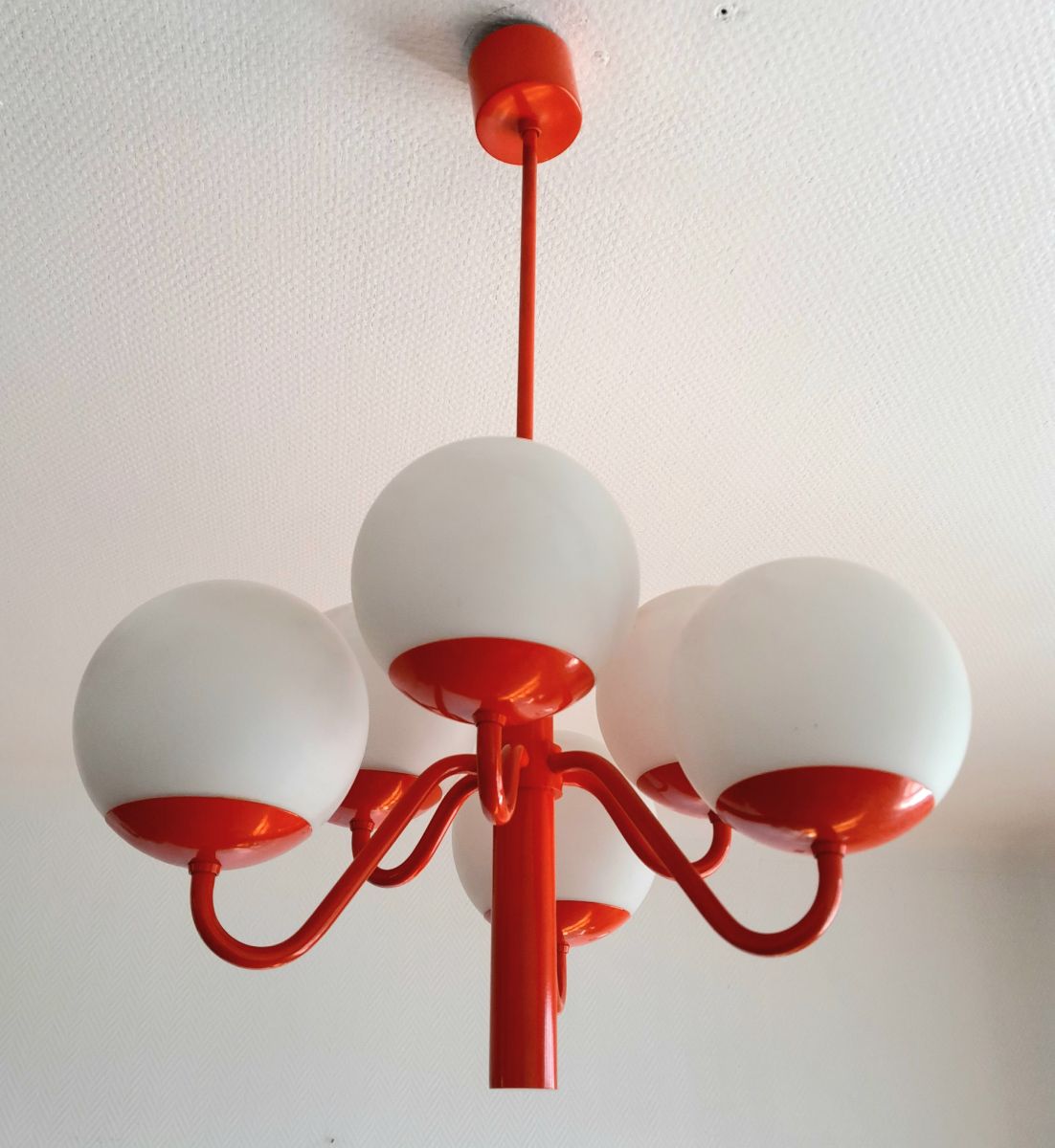 Lustre à la structure en métal orange à six bras de lumière avec six abat-jours ronds en verra opale qui diffusent une lumière très chaleureuse.