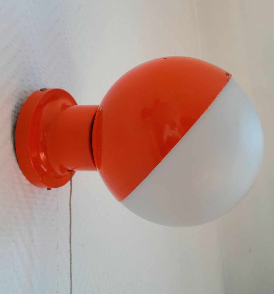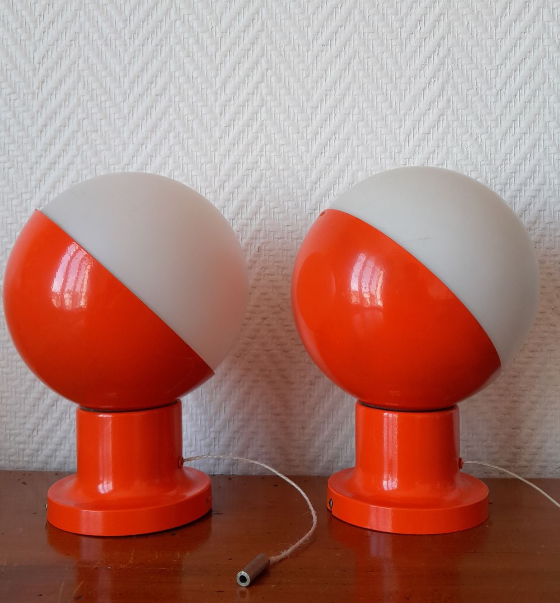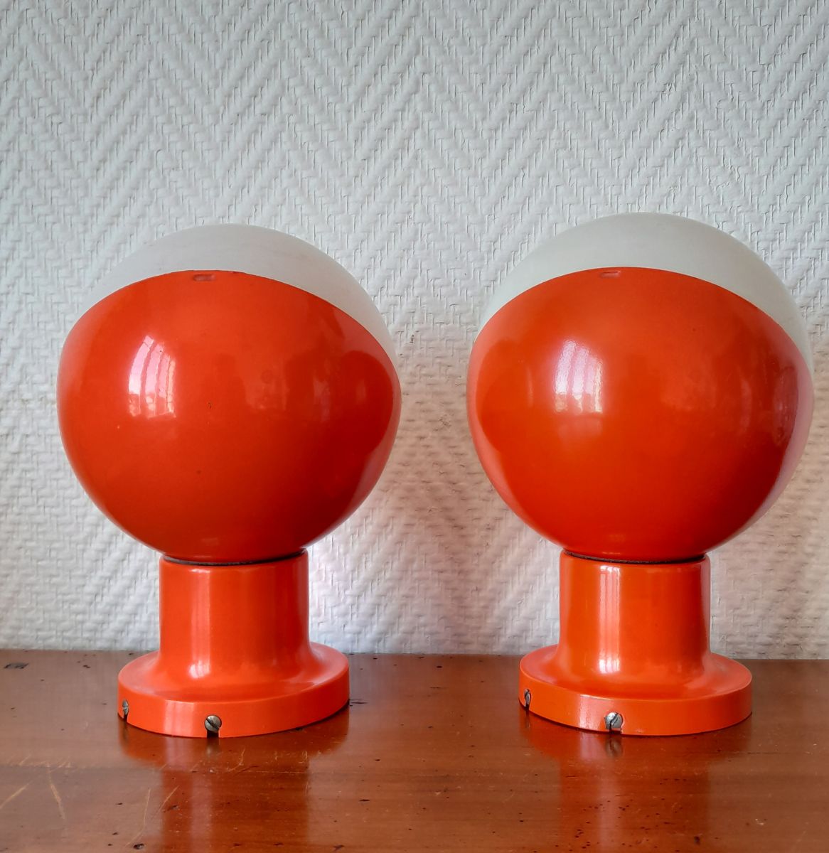 Paire d'appliques orange de forme boule avec structure métallique orange avec sphère en verre blanc. Tirette fil d'allumage.