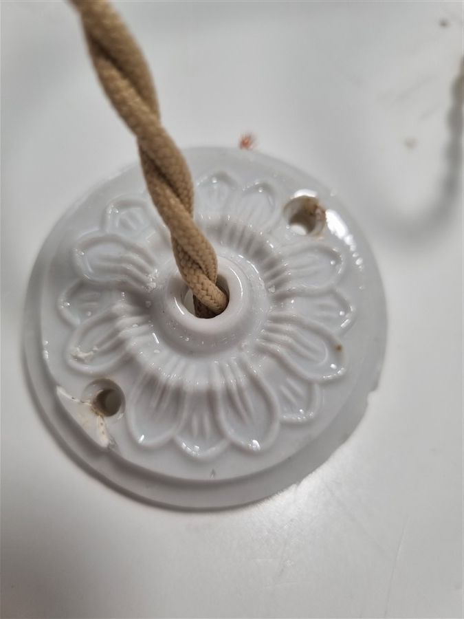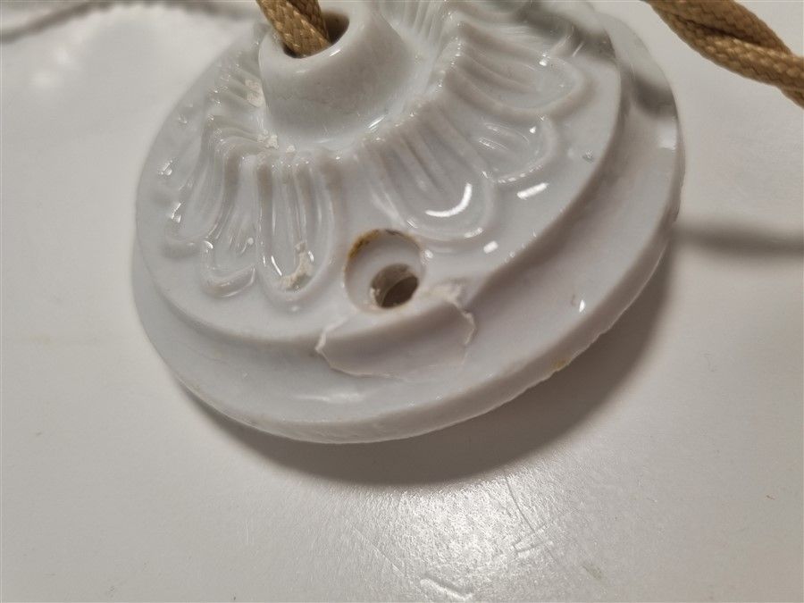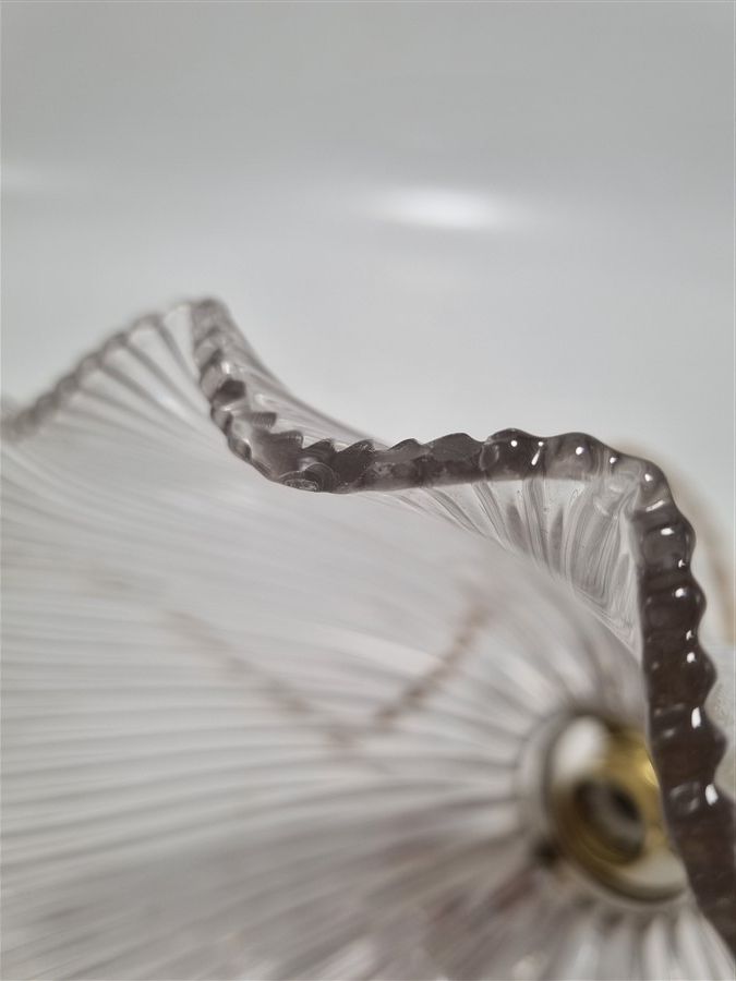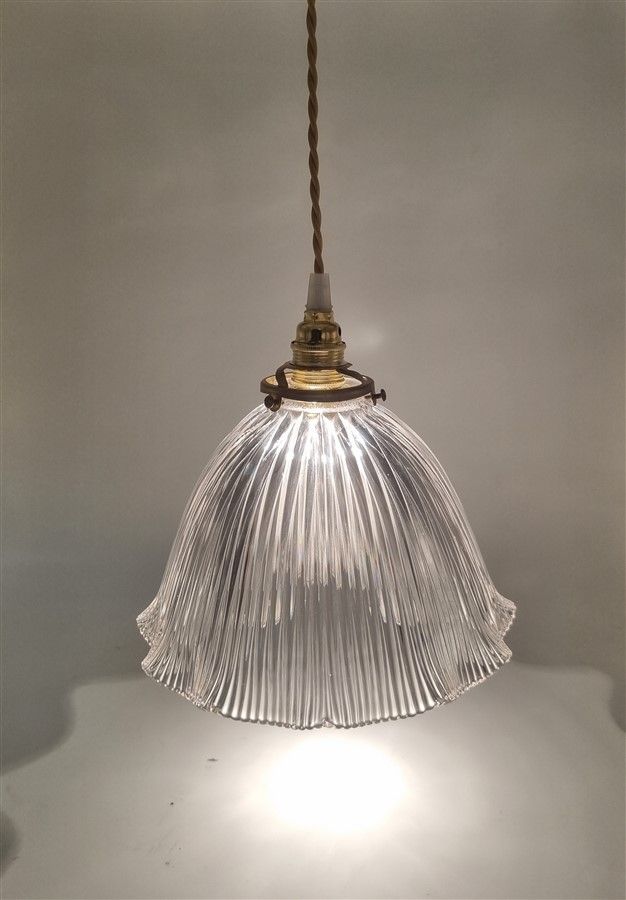 Suspension, estampillée "holophane", en verre strié. Elle présente un accident visible sur photo, très discret.