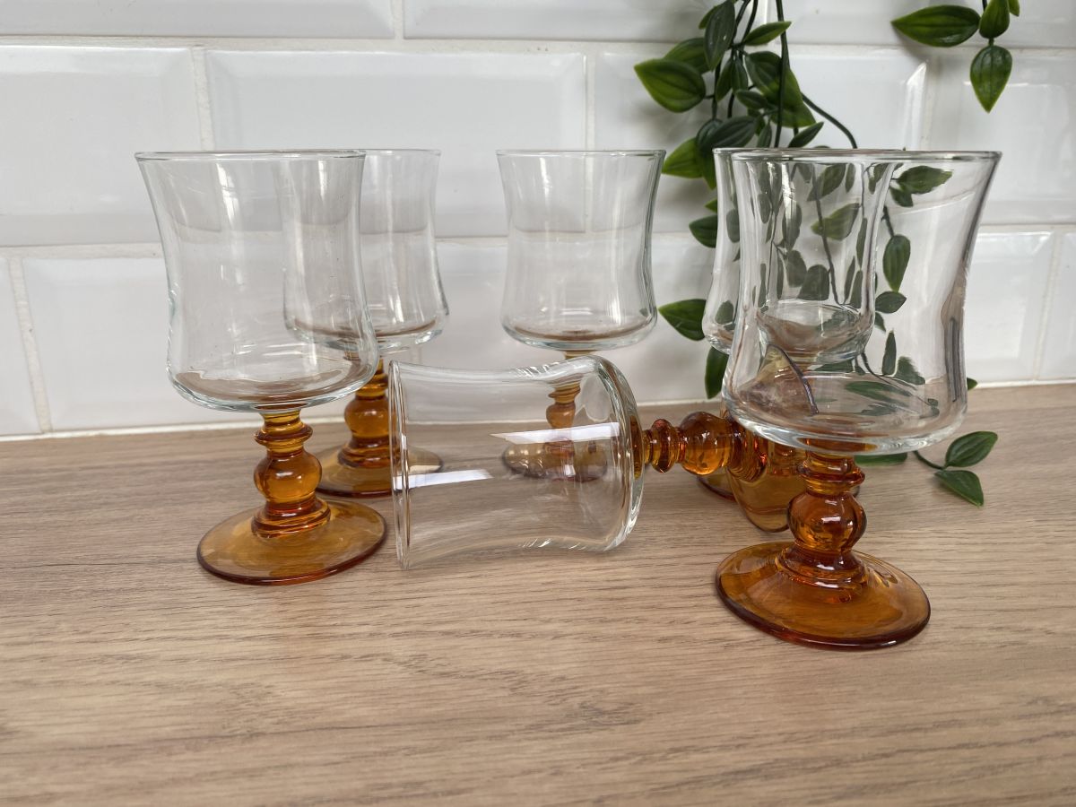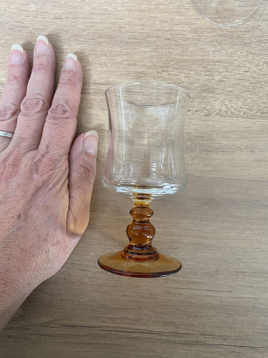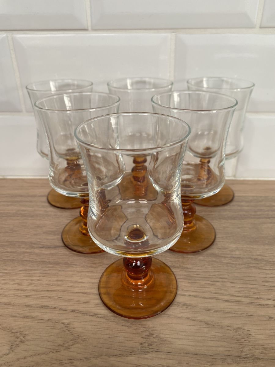 Set de 6 verres à vin Luminarc, modèle Antique aux pieds ambrés. Très eighties! Je possède d'autres verres du même modèle, n'hésitez pas à me contacter pour un envoi groupé. Contenance 9 cl, Diamètre 5,7 cm, hauteur 11 cm. V924&V1138
