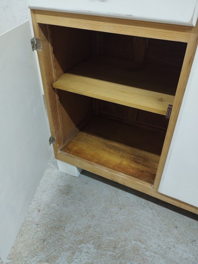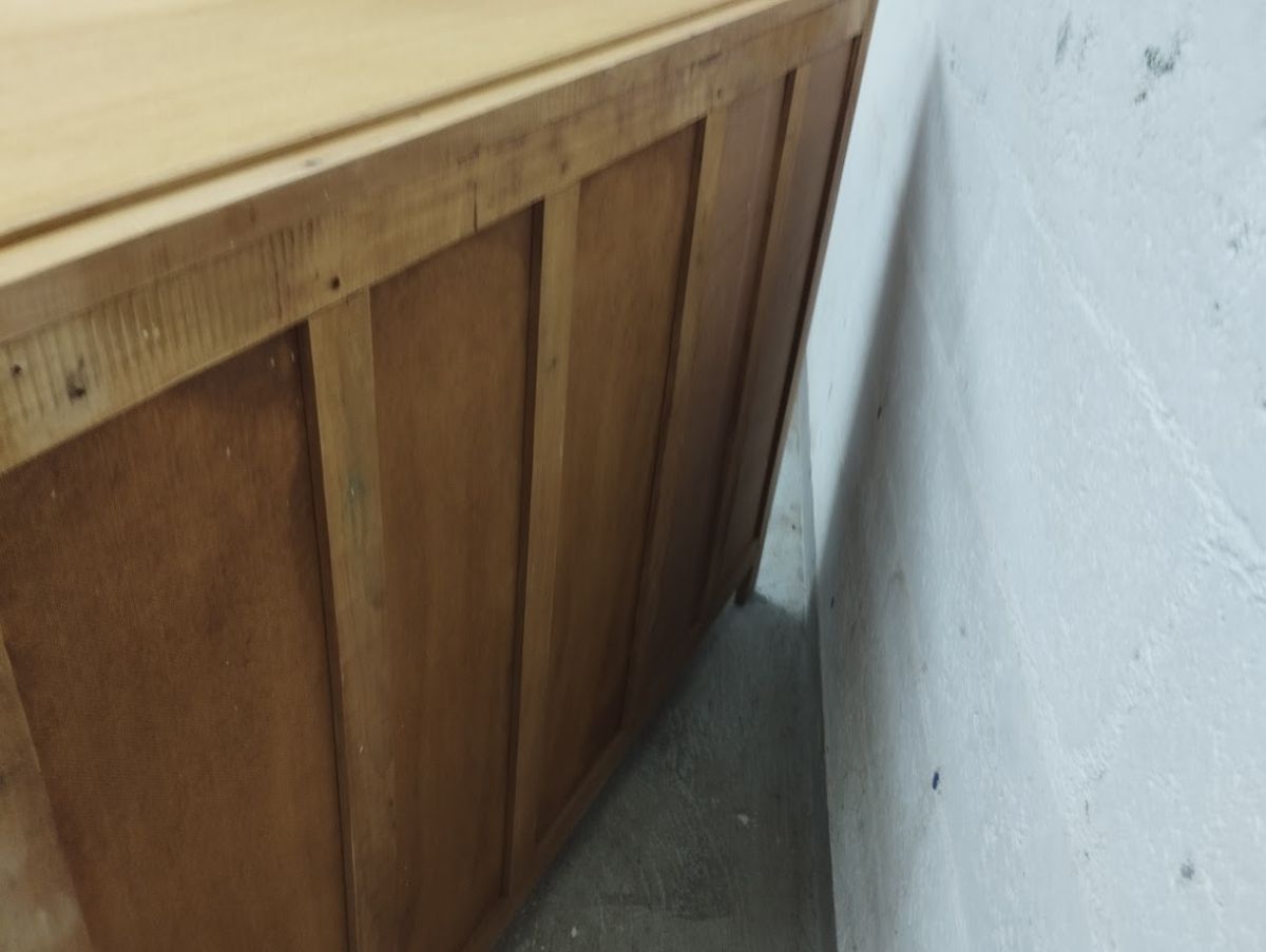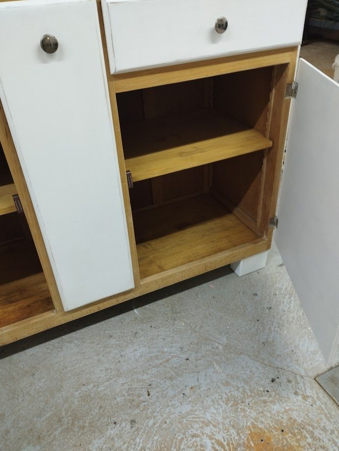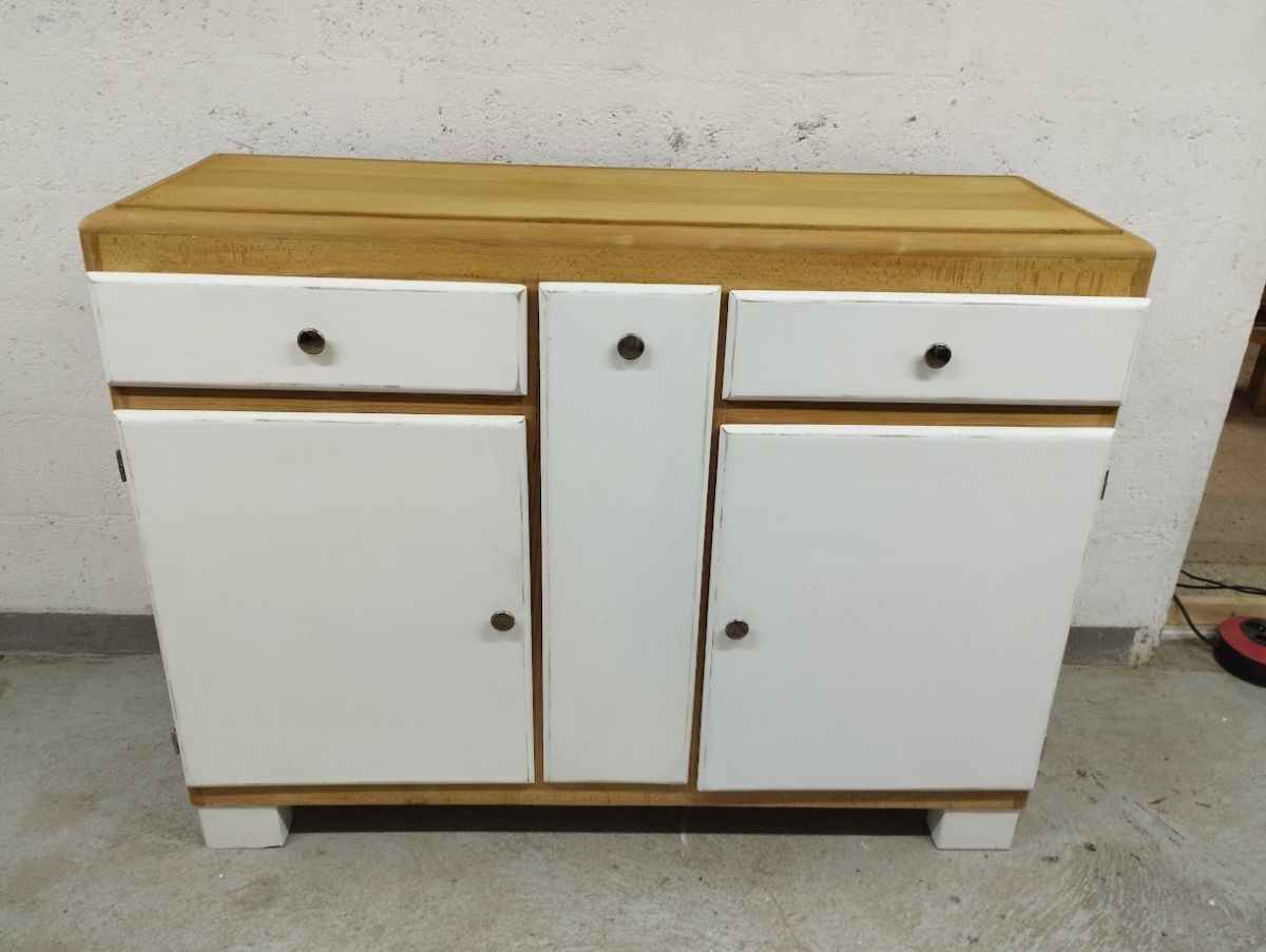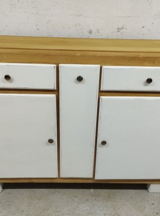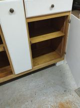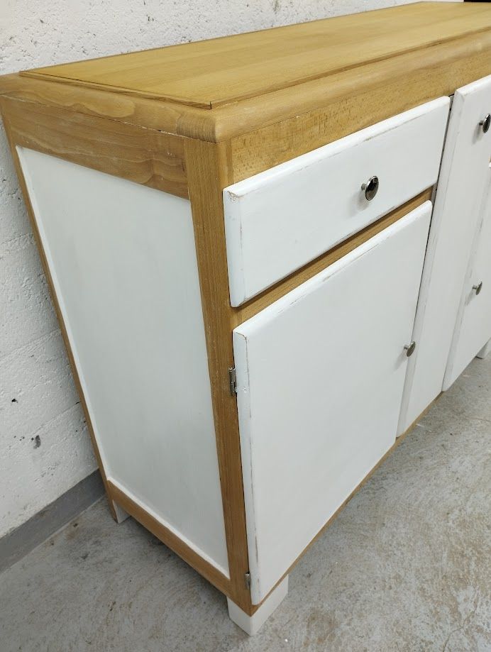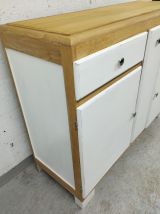 Buffet Mado des années 50,60, en hêtre, de couleur blanc, et bois, étagéres réglables et amovibles, fermeture porte aimant, huche à pain. Possibilité de livraison, dans le secteur.