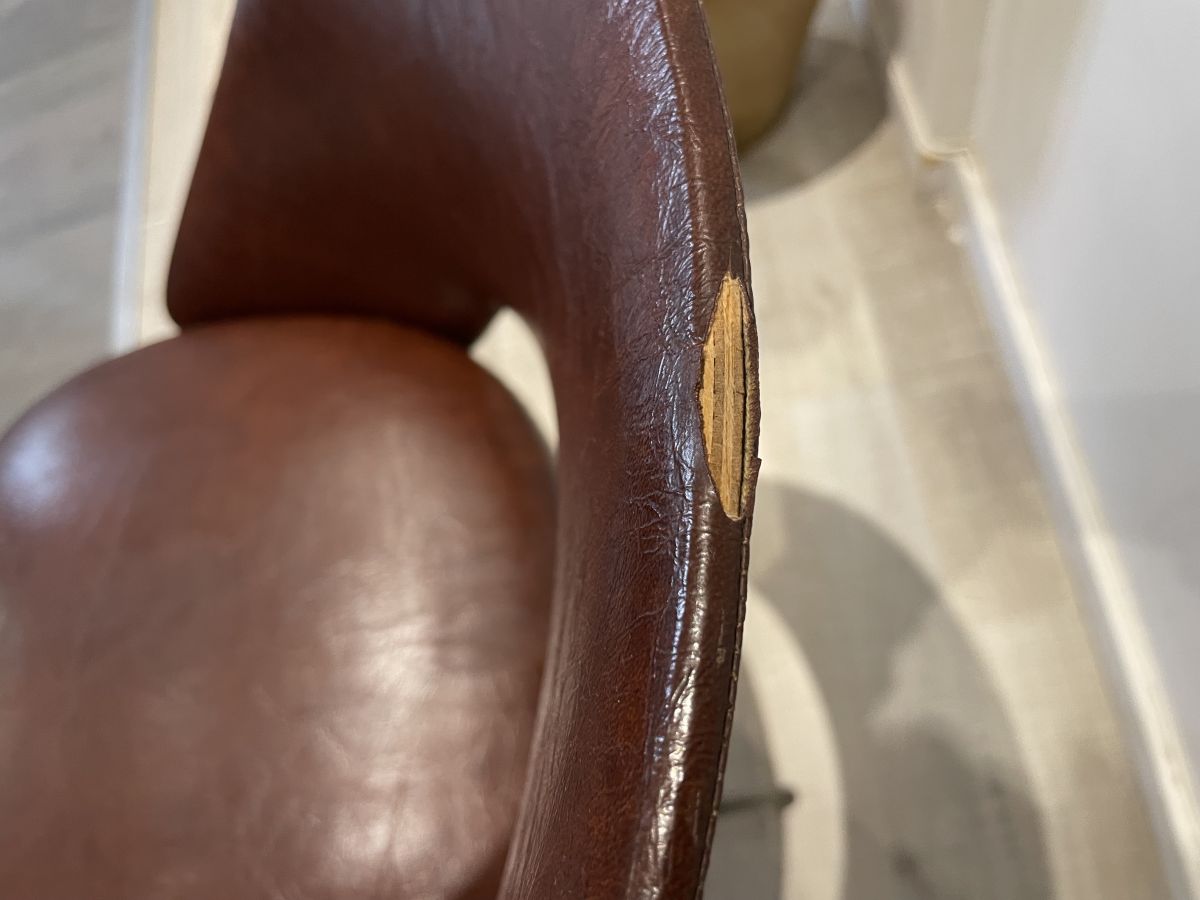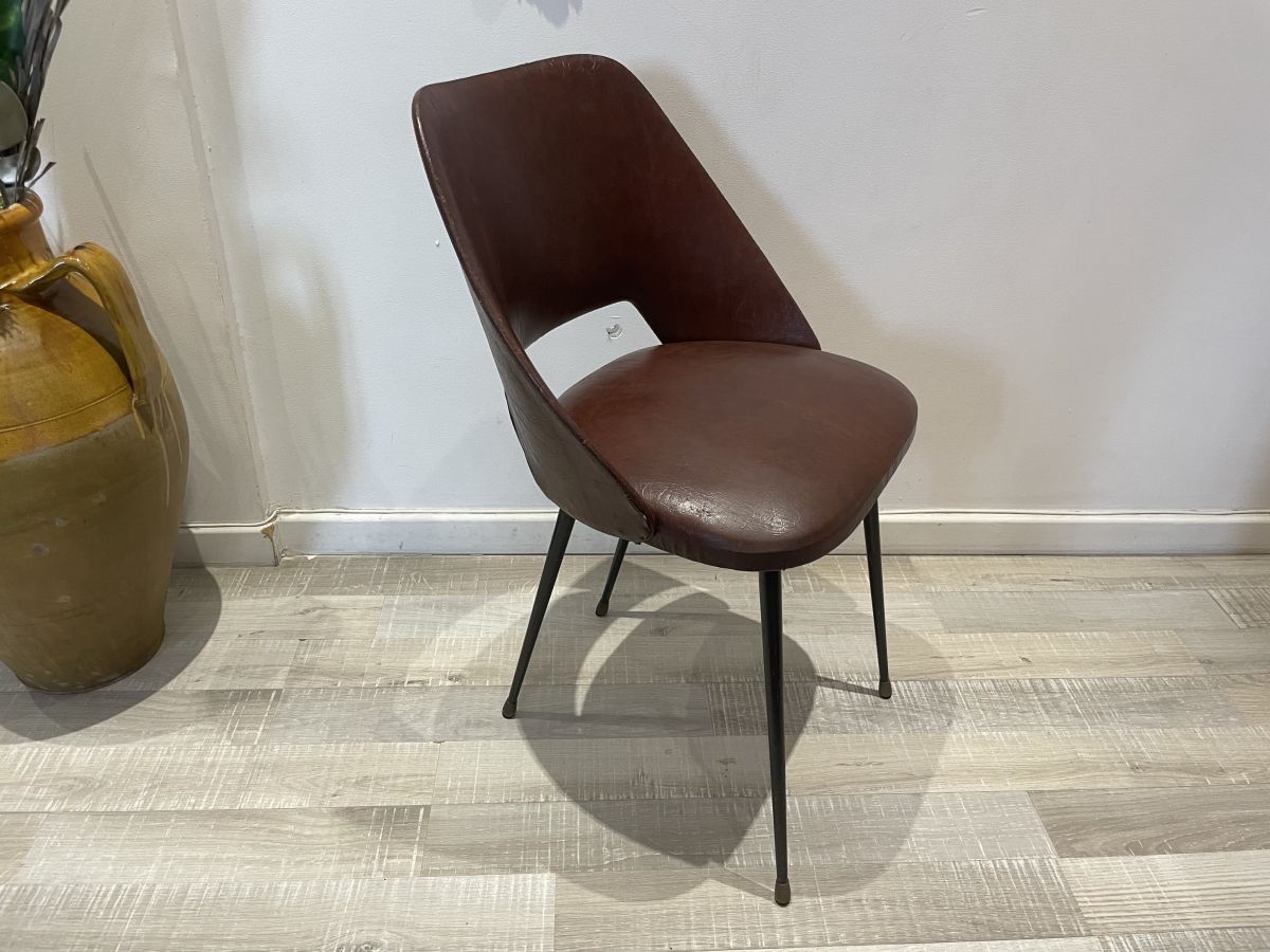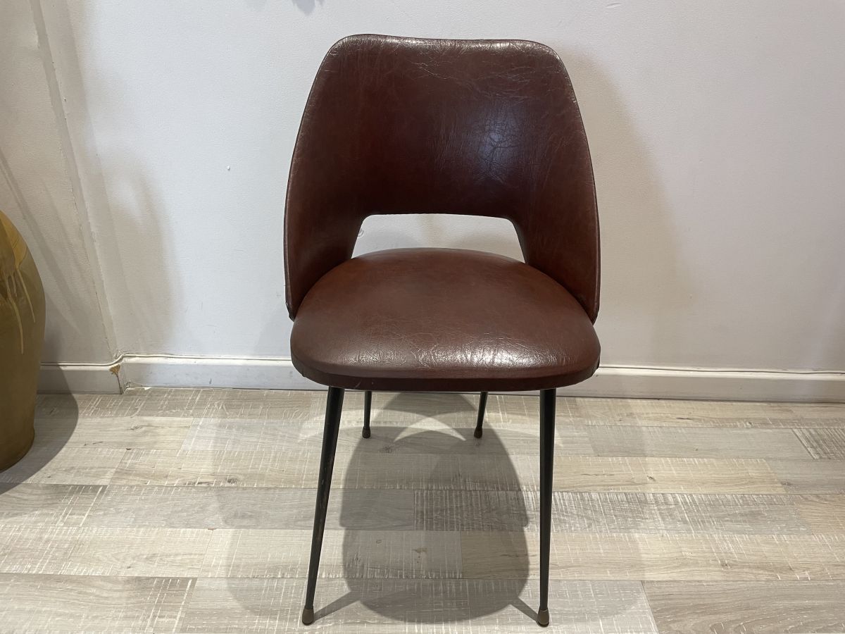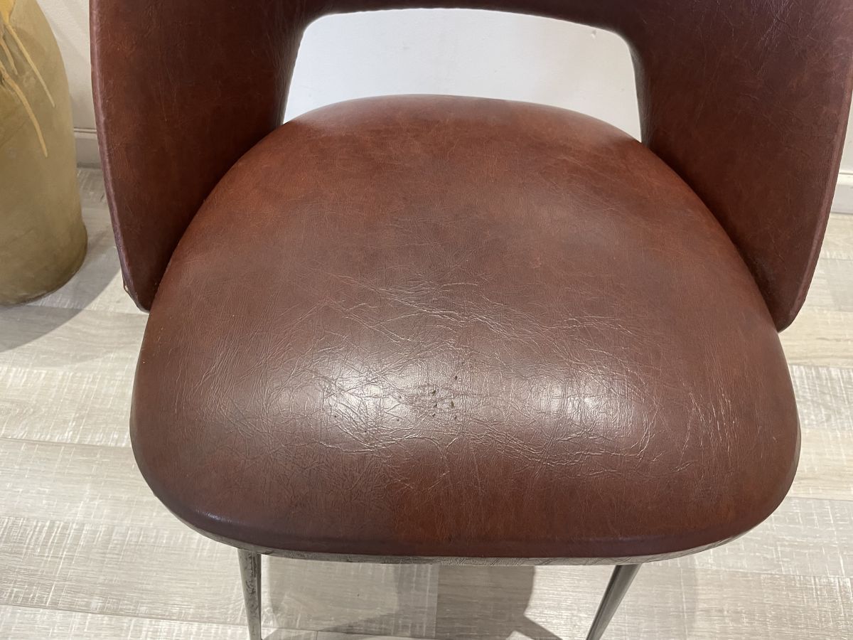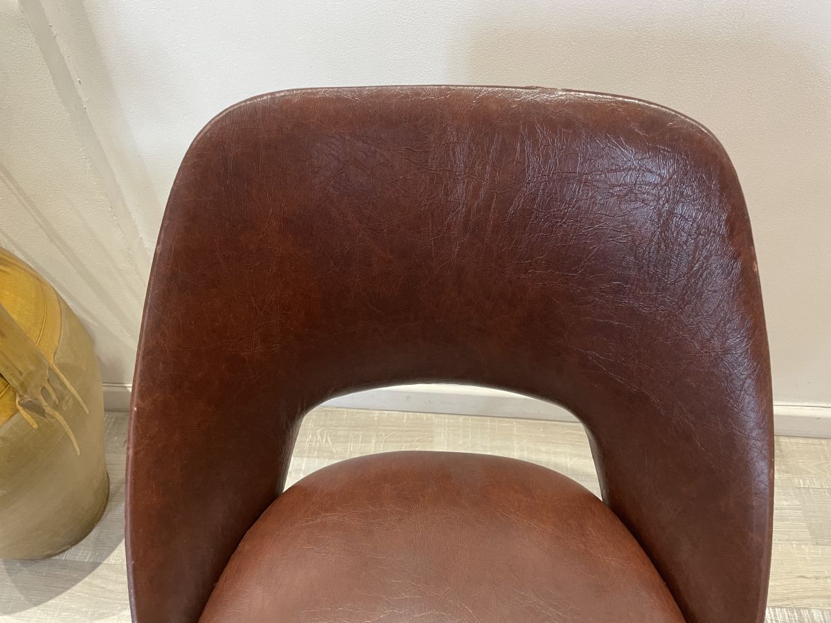 Chaise conférence des années 50 dans le goût d’Eero Saarinen, skaï marron, assise en bon état, une déchirure sur le dessus du dossier (voir photos), très solide et stable, dimensions (cm) : L.47xH.76xP.50, hauteur assise 46cm, assise 42x38cm.