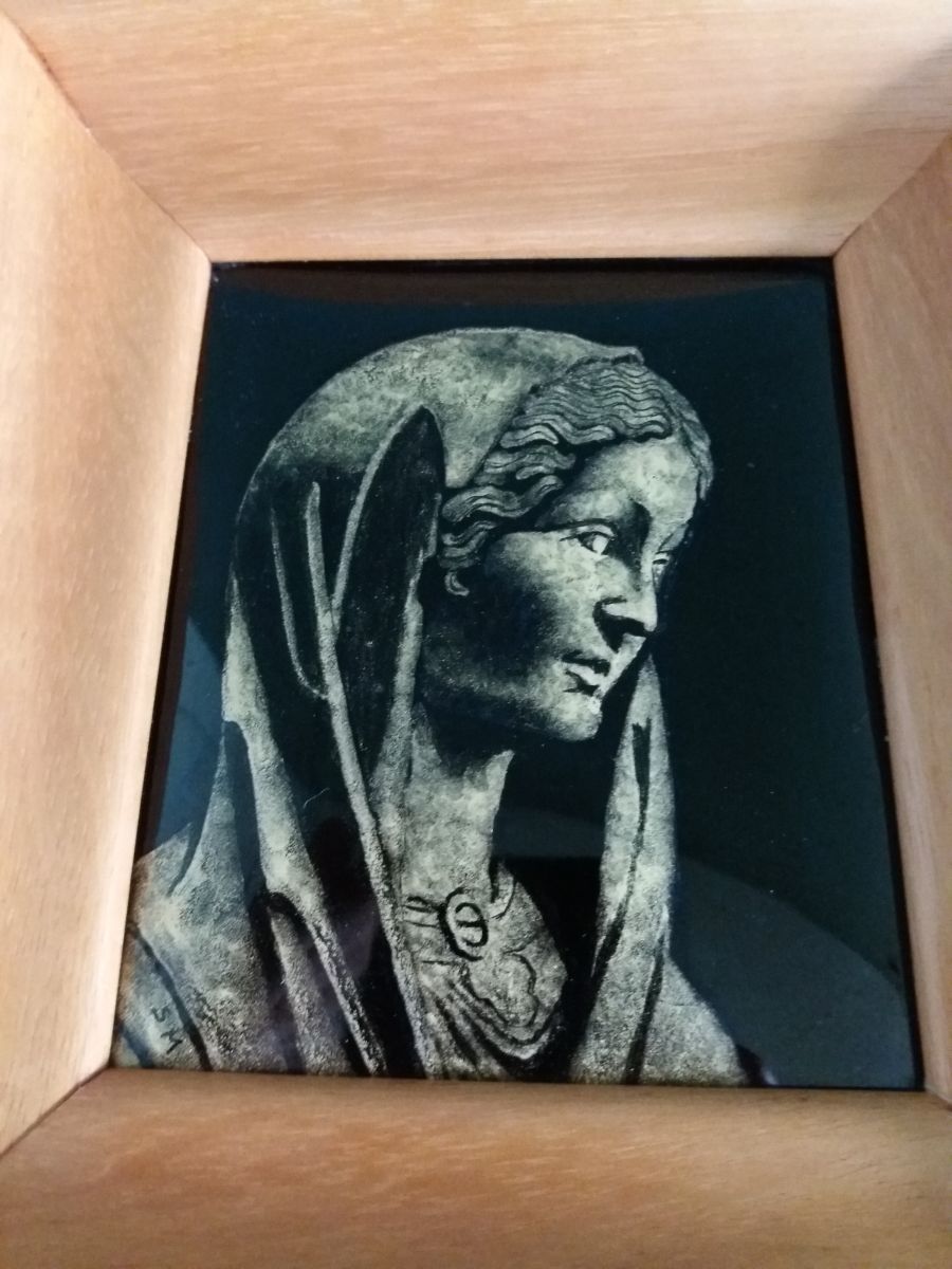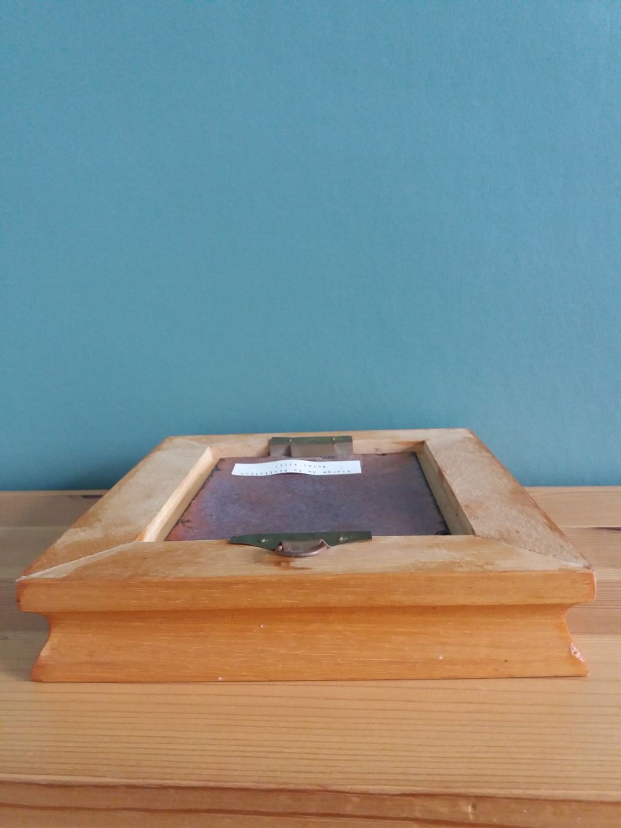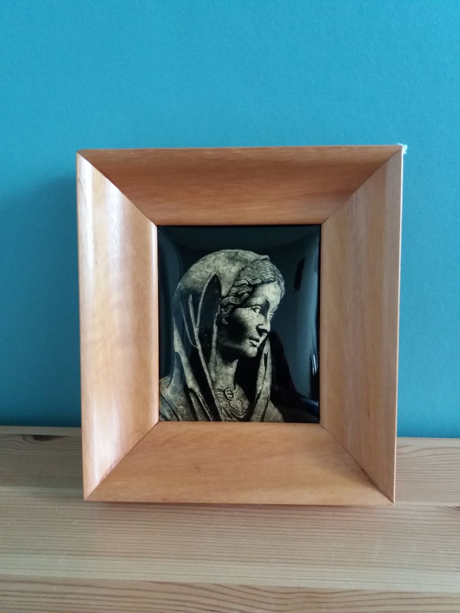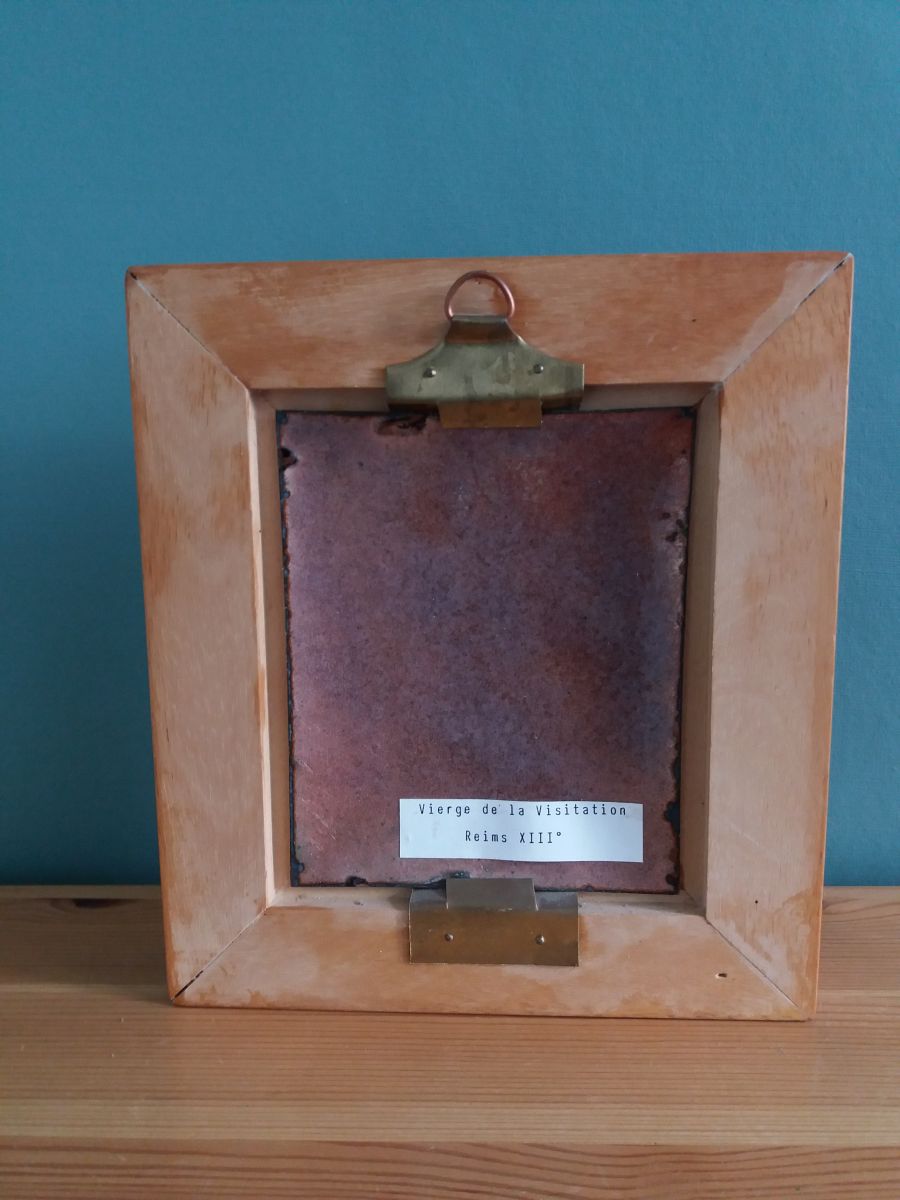 Joli cadre très décoratif en accumulation pour orner un mur ou pour être posé sur une étagère. Il se compose d’une plaque en métal émaillé avec le buste de la vierge en impression dorée sur l’émaillage noir, le tout monté dans un cadre en bois clair. Cet objet est encore plus beau en réalité qu’en photo car le bois verni et le fond noir brillant fond joliment ressortir le visage doré et lui donnent de la profondeur. A l’arrière une étiquette « Vierge de la visitation - Reims XIII » indique qu’il s’agit d’une image de la célèbre statue qu’on peut admirer sur le portail central de la cathédrale de Reims. Ce cadre est muni d’un anneau de fixation, mais la cadre est épais alors il tient aussi debout tout seul. Il s’agit probablement d’un souvenir rapporté lors d’une visite de la cathédrale de Reims, il date des années 70 ou 80. L’ensemble est en parfait état. Le cadre mesure 17 cm par 15 cm pour une épaisseur de 3 cm, l’image mesure 10 cm par 8,5 cm.