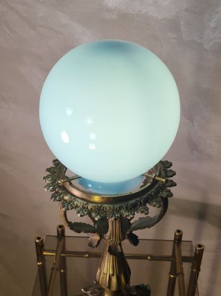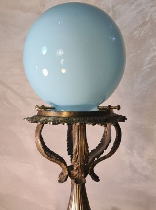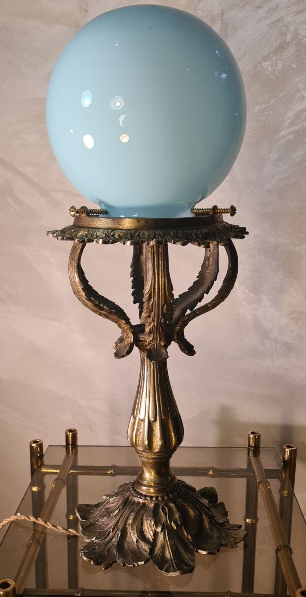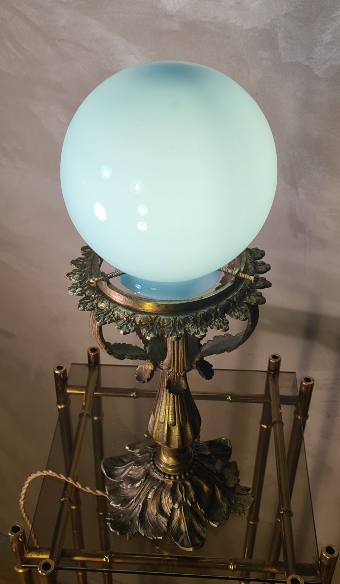 lampe de table bronze 19eme age 38x16 opaline bleu ,tres belle,