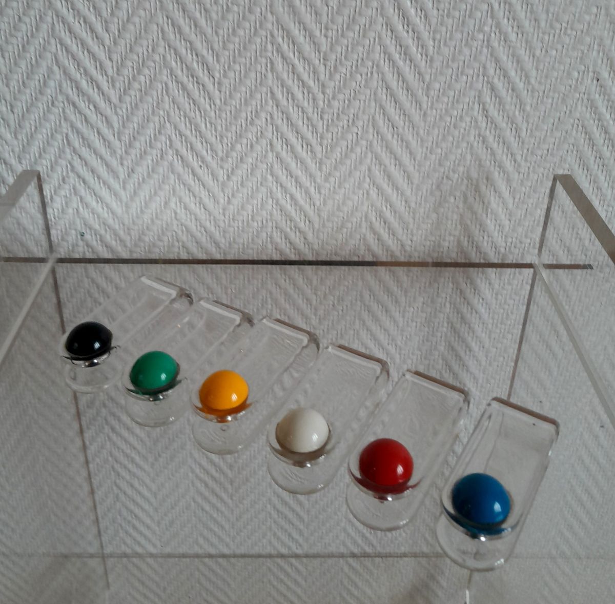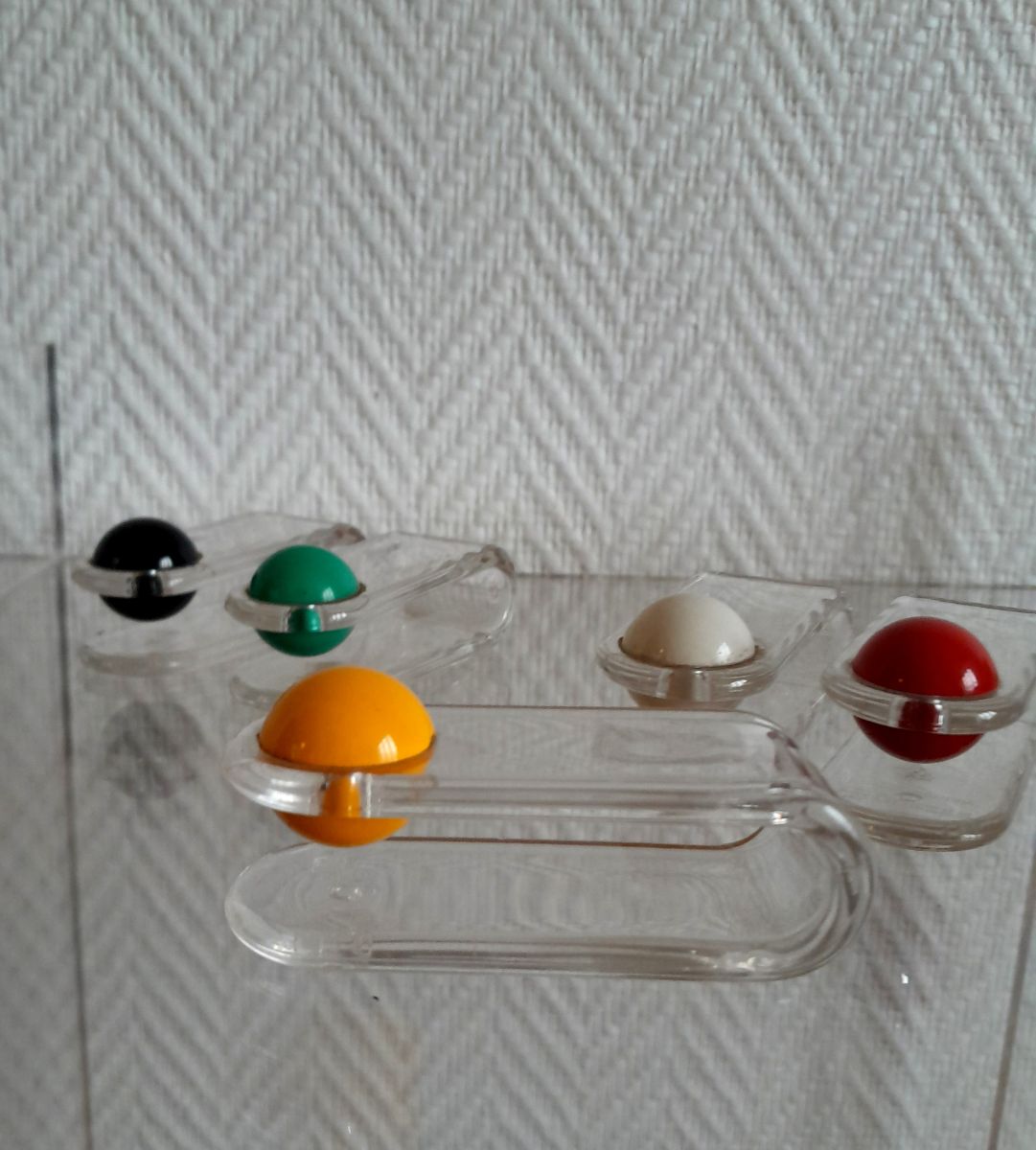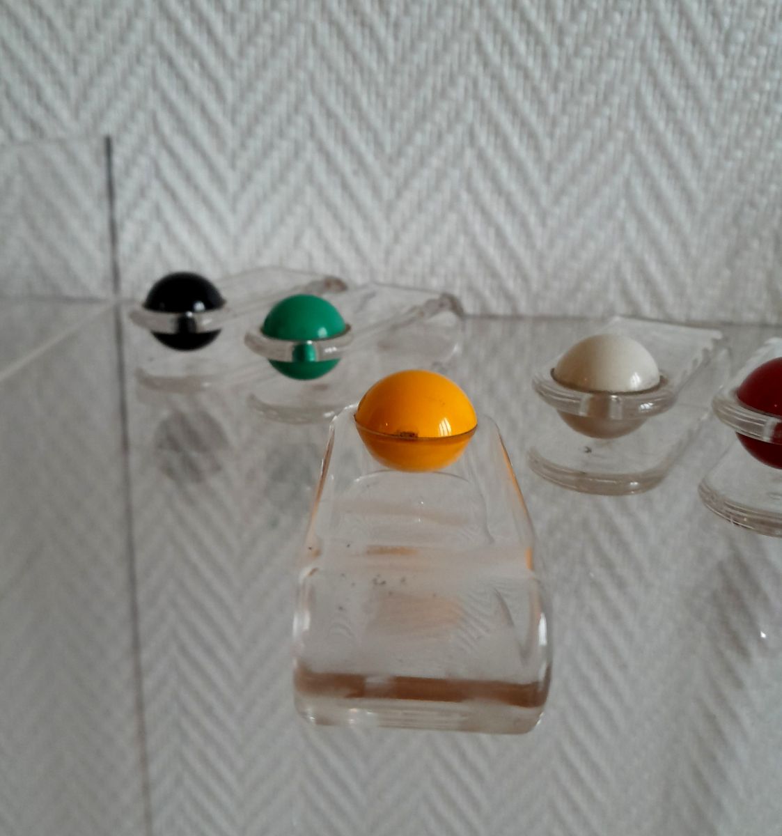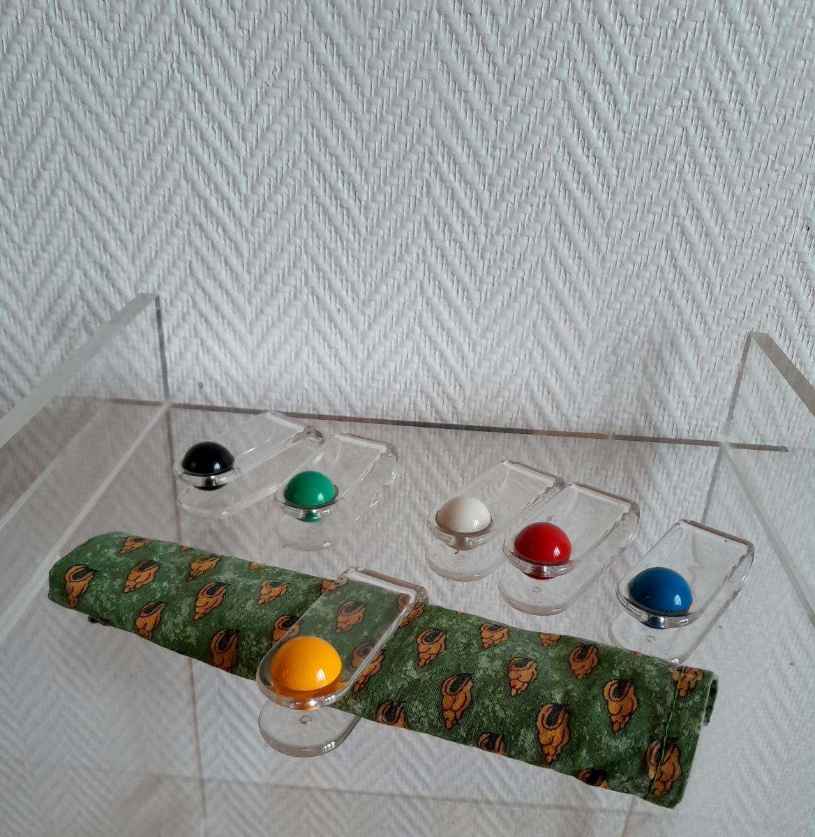 Ensemble de six clips de serviette crées par le designer Ambrogio Rossari pour la maison italienne Guzzini dans les années 80. Modèle de la série "particolari".