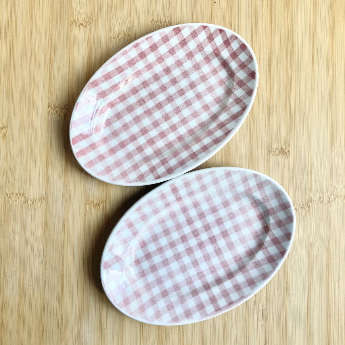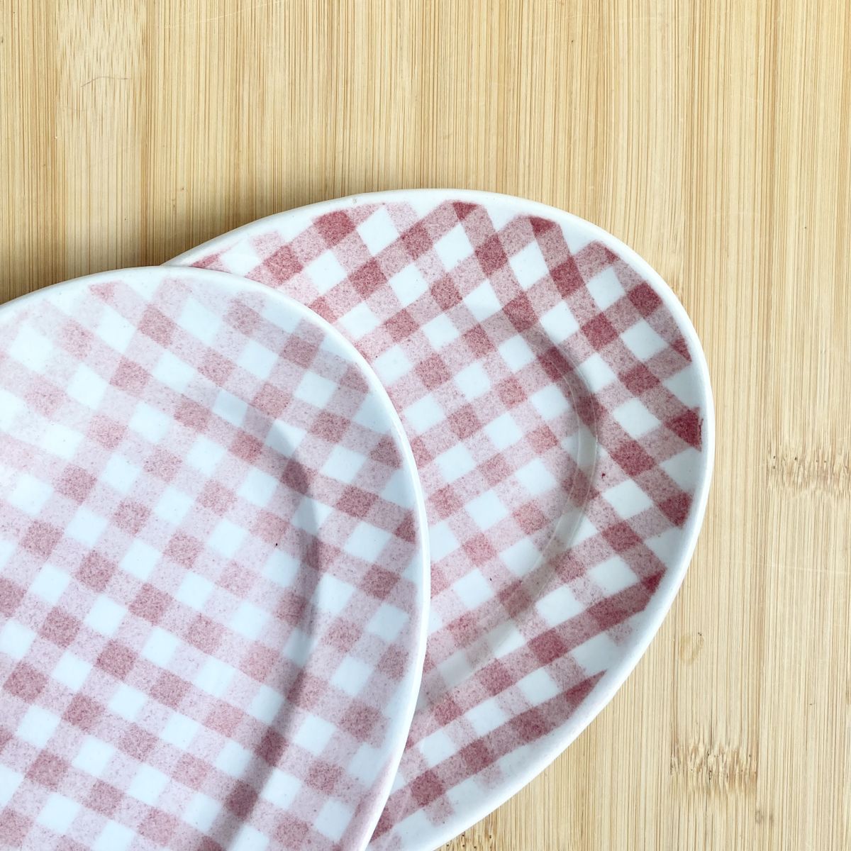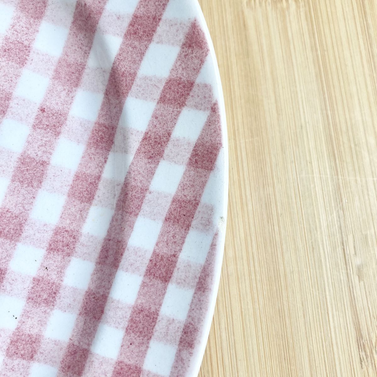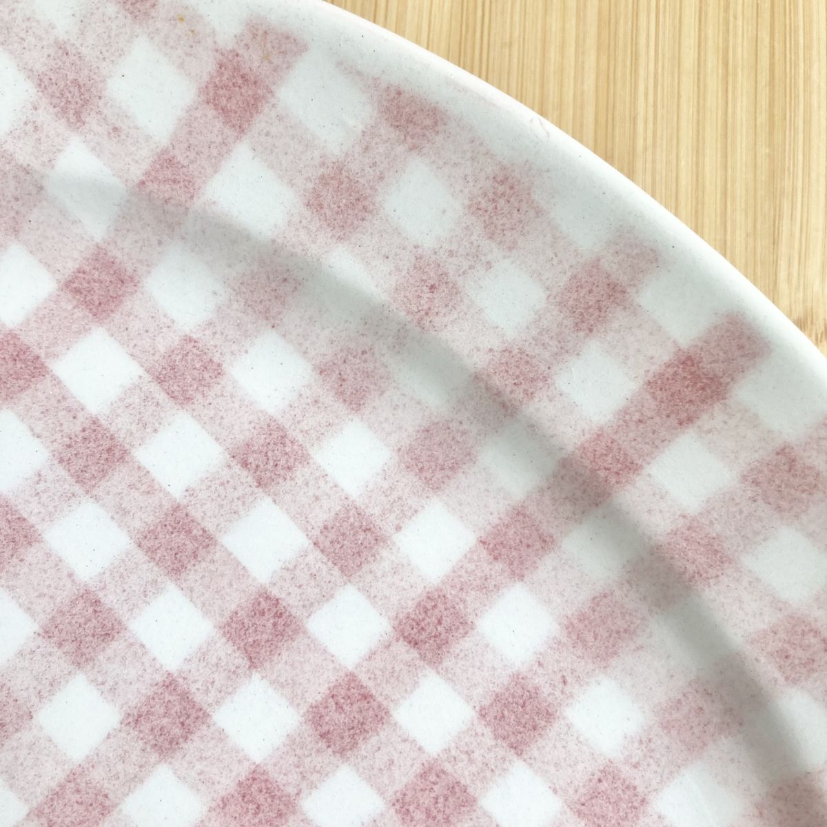 Porcelaine opaque blanche et décor vichy / écossais rose.