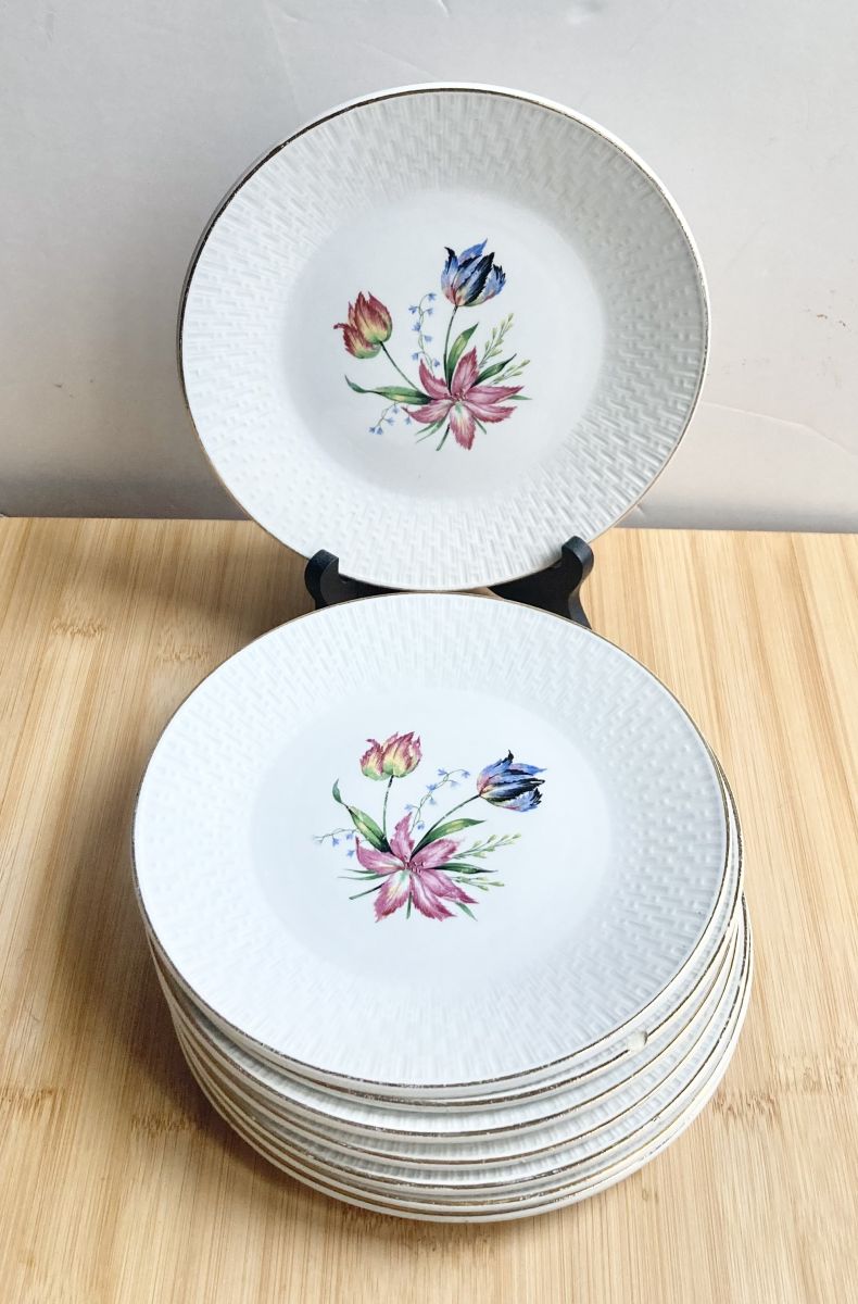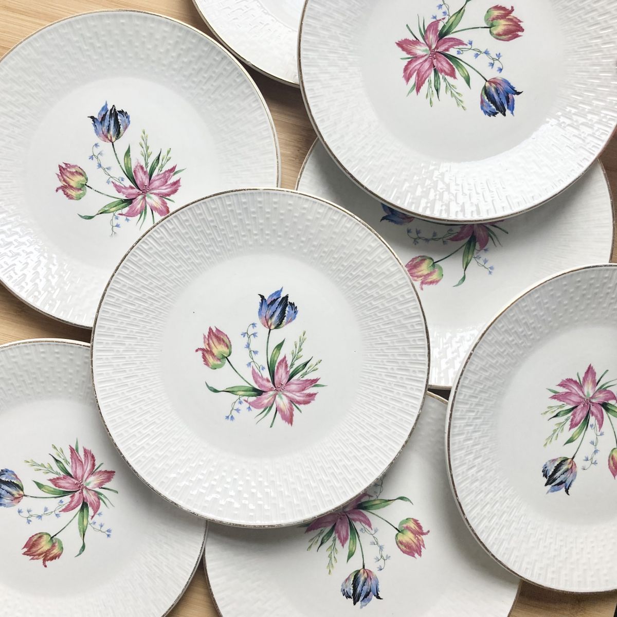 Vintage, vaisselle ancienne, assiettes anciennes, vintage, retro, vaisselle fleurie, belle table, table d'été, assiette dessert, patisserie, entrée, apéritif, fromage, gâteau, goûter, anniversaire, cadeau, fête, mariage, wedding, naissance, baptême, communion, porcelaine opaque, demi-porcelaine, saint-Amand, Céranord, Orchies, Moulin des Loups, Lunéville, Badonviller, Sarreguemines, Digoin, Gien, Salins,