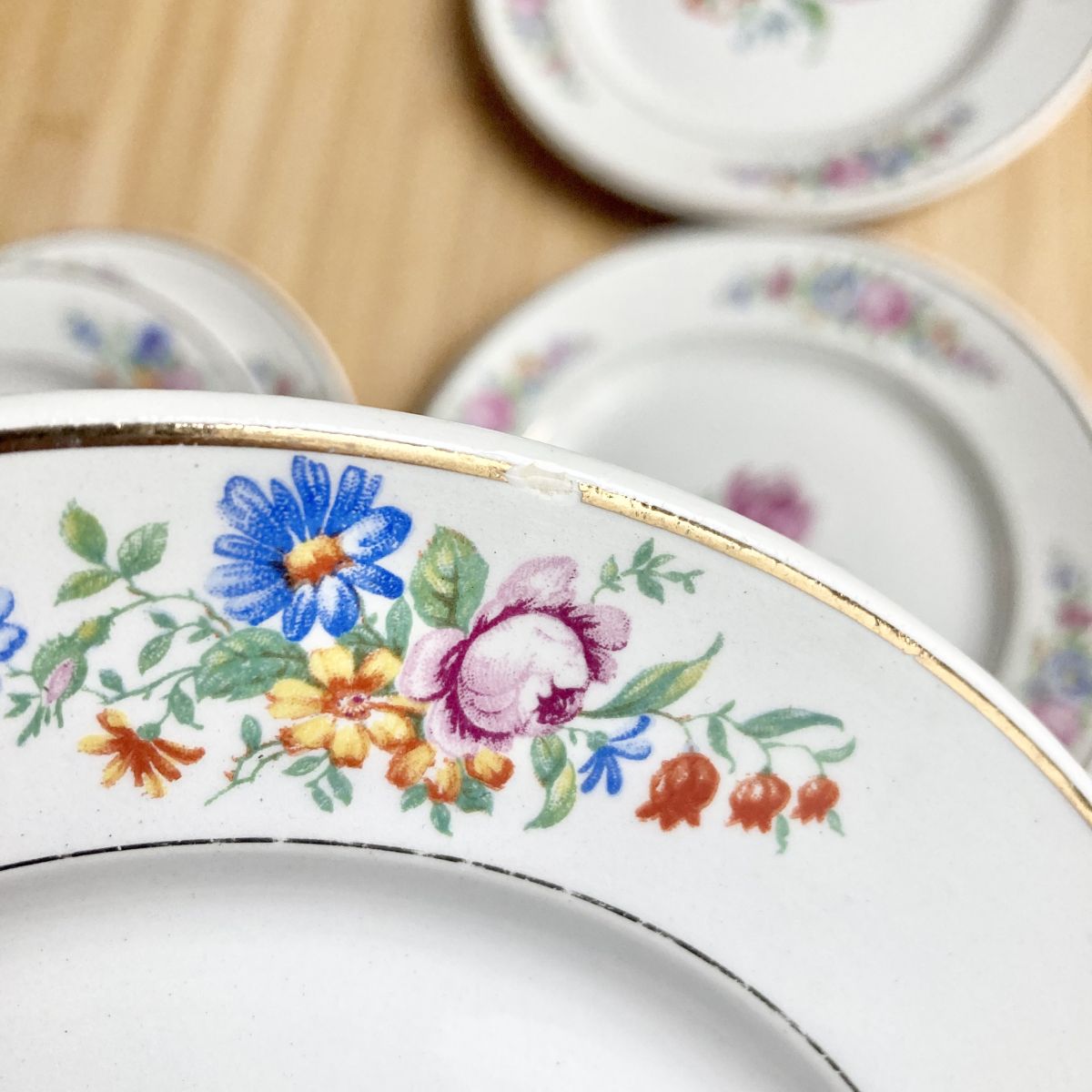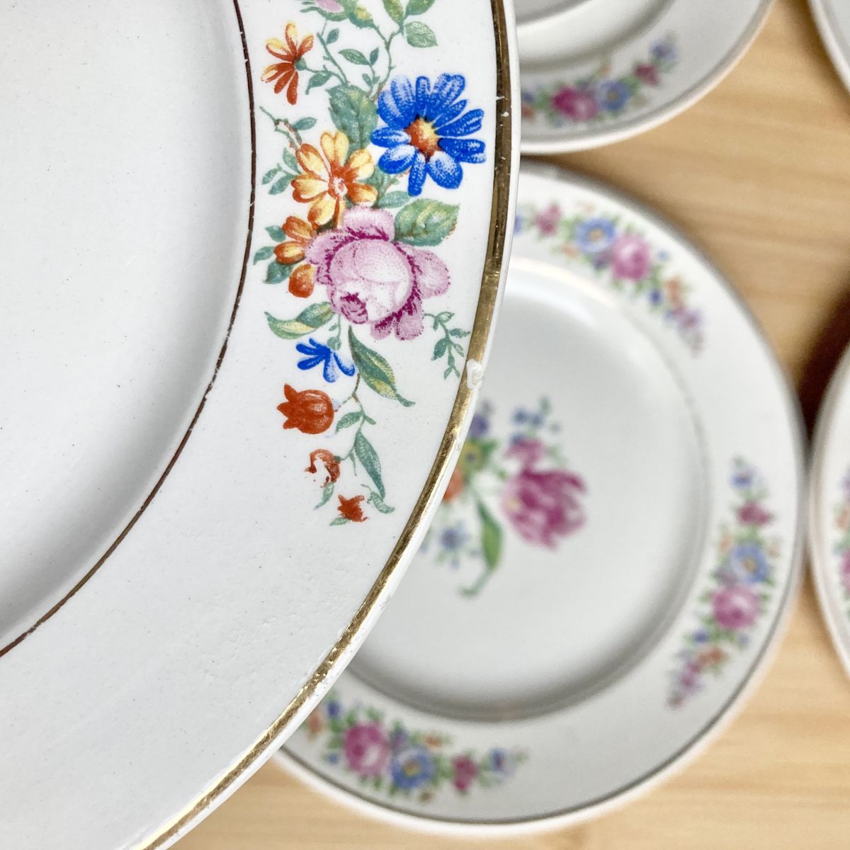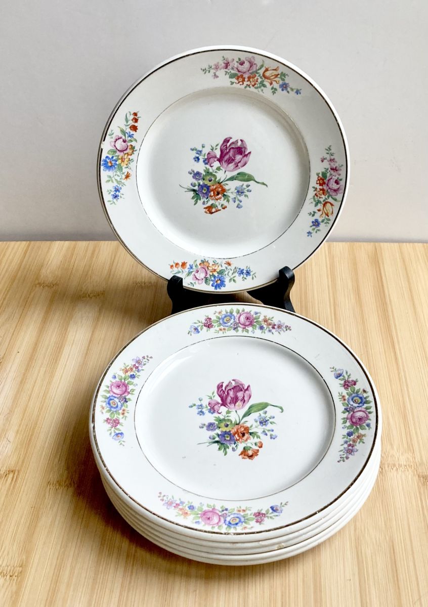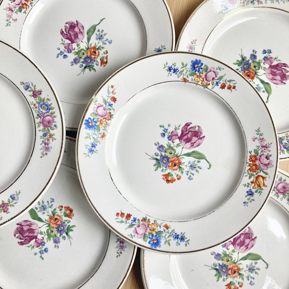Vintage, vaisselle ancienne, assiettes anciennes, vintage, retro, vaisselle fleurie, belle table, table d'été, assiette dessert, patisserie, entrée, apéritif, fromage, gâteau, goûter, anniversaire, cadeau, fête, mariage, wedding, naissance, baptême, communion, porcelaine opaque, demi-porcelaine, saint-Amand, Céranord, Orchies, Moulin des Loups, Lunéville, Badonviller, Sarreguemines, Digoin, Gien, Salins,