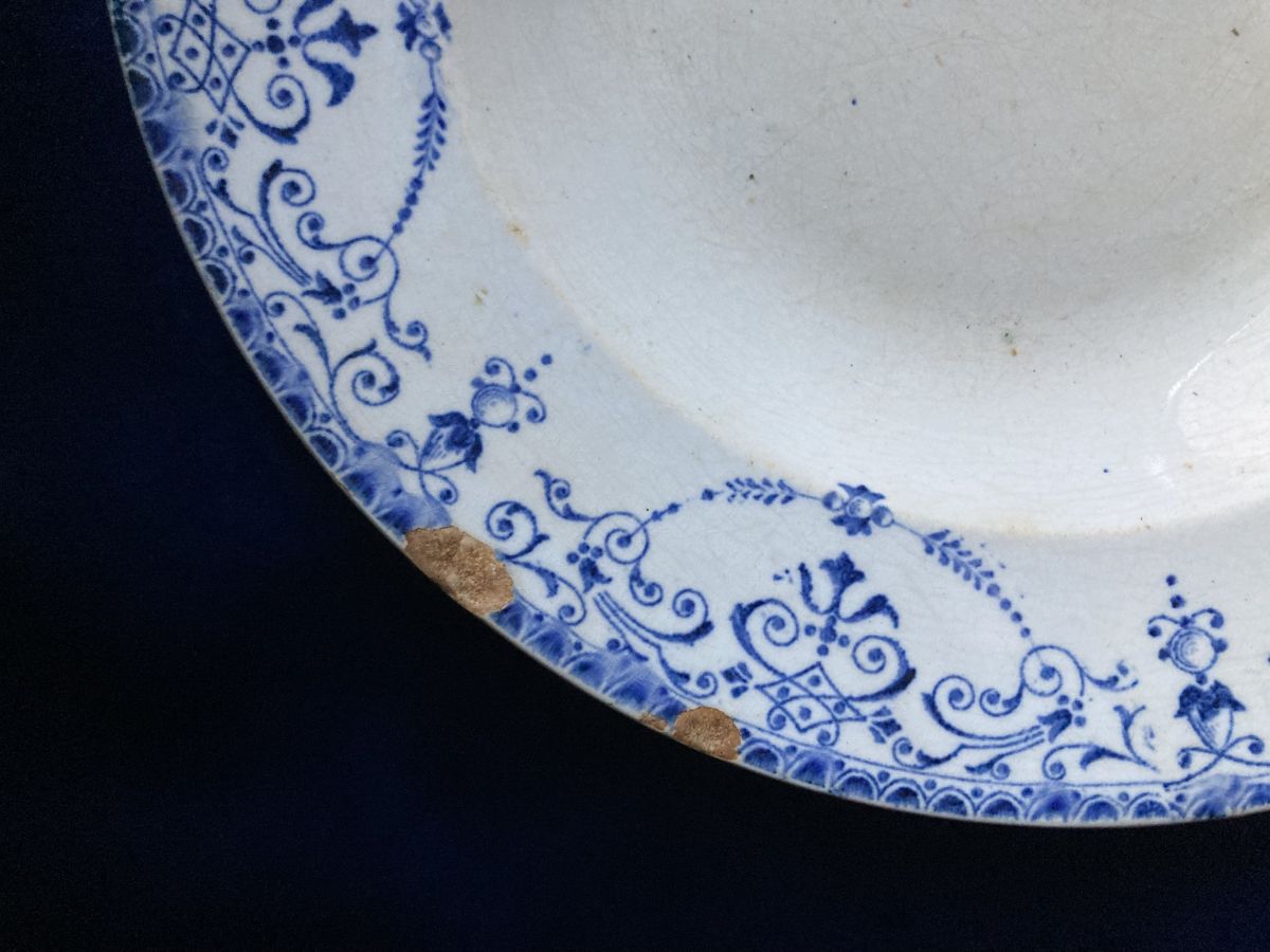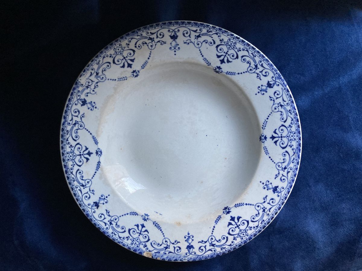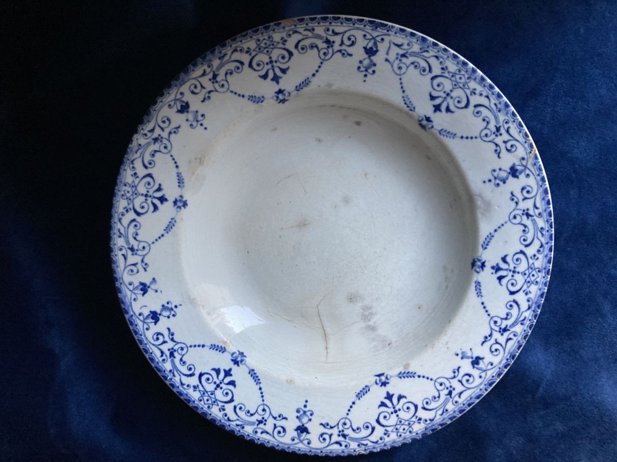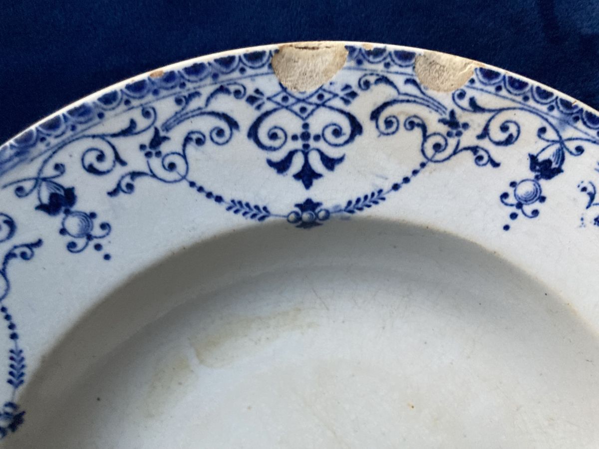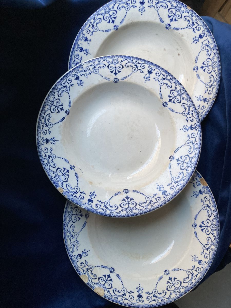Lot de trois assiettes terre de fer modèle Balzac DANS L'ÉTAT issues de la faïencerie Hippolyte Boulenger dite de Choisy-le-Roi, grande entreprise du début du siècle dernier avec 1 400 employés jusqu’à sa fermeture en 1936; mais dont l' origine remonte à 1804, fondée par les frères Paillart, ensuite en association avec Hautin, pour finir à l’arrivée de la famille Boulenger. Le modèle iconique Balzac présente sur les bords un feston bleu foncé de petites motifs arabesques, feuilles, fleurs, sur fond blanc crème non sans rappel les ornements du style Louis XVI. Les assiettes montrent des petites ébréchures et traces sur le devant ainsi que des craquelures sur le derrière.