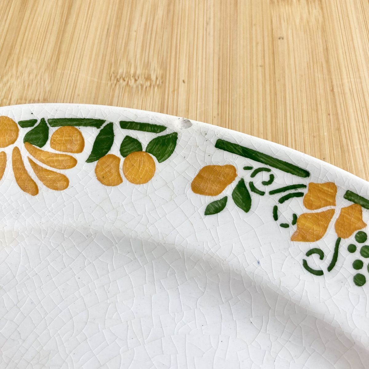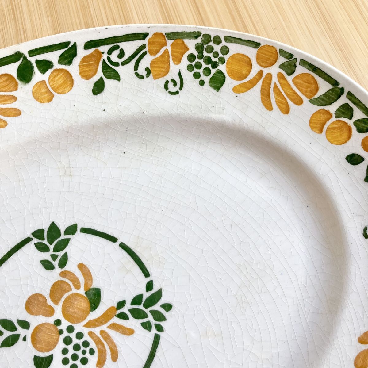 Faïence blanche et motifs floraux stylisés et vitaminés Art Deco vert et orange.