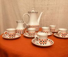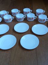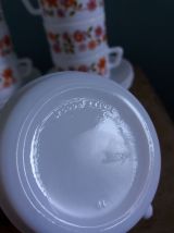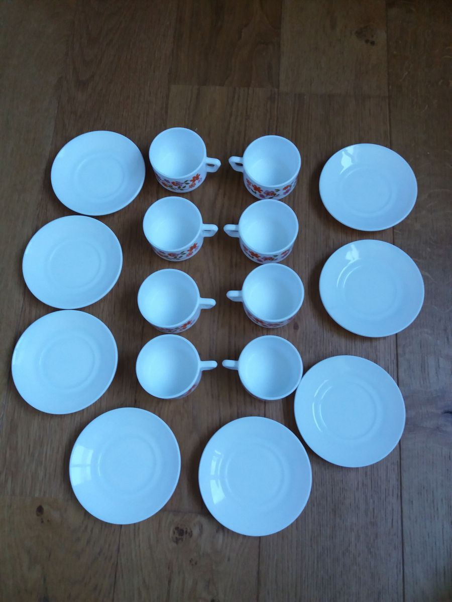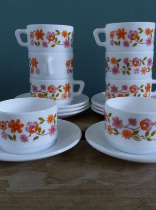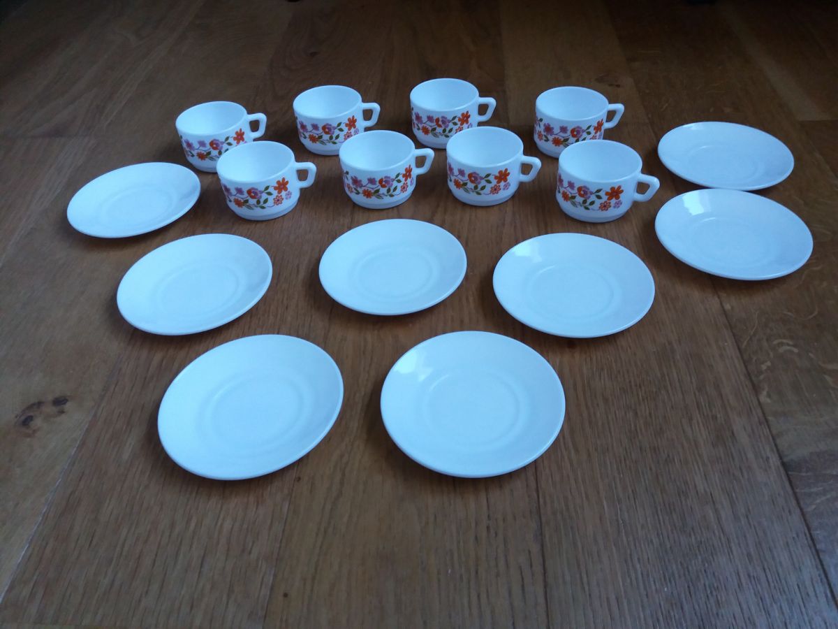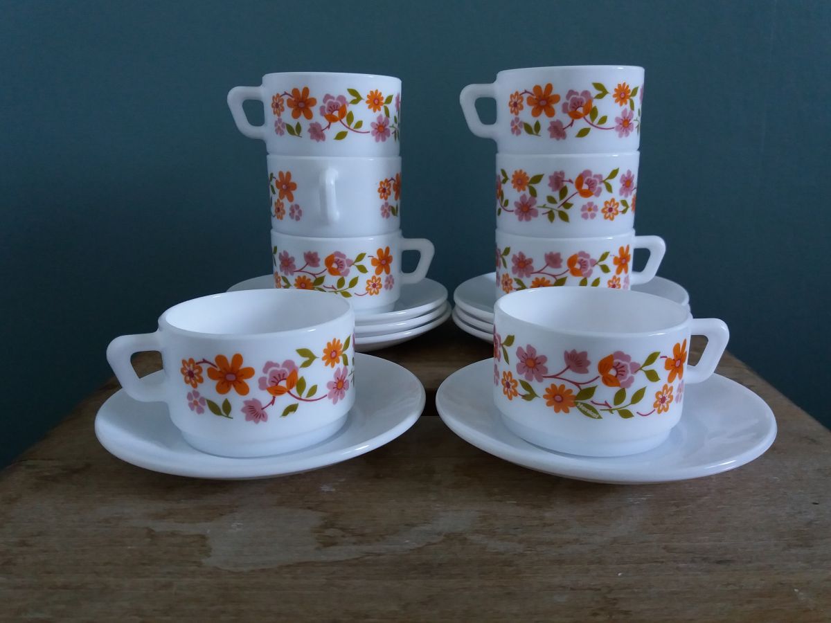Ensemble de 8 tasses et 8 soucoupes de la célèbre marque Arcopal. Il s’agit du décor Scania , petites fleurs de couleurs rose et orange, proposé à partir de 1976. Elles sont estampillées dessous. Elles sont en très bel état, ni fêle, ni égrenure, décor intact, peu ou pas de rayures, elles n’ont pas du être utilisées souvent. A noter, un défaut d’origine : une légère petite tache plus sombre sur l’une des soucoupes (voir photo). Les tasses mesurent 6,5 cm de diamètre, 8,5 cm de largeur avec l’anse, 4,5 cm de hauteur, les soucoupes mesurent 11 cm de diamètre.