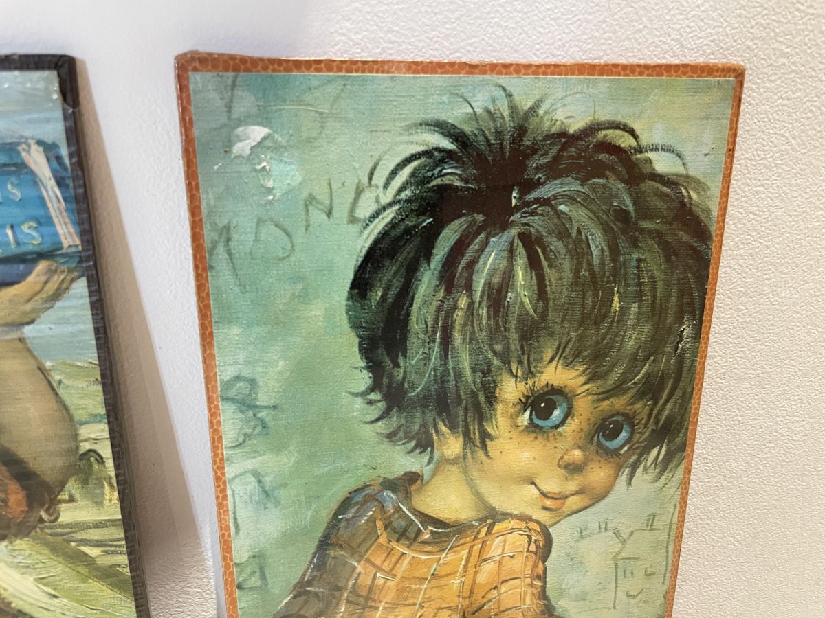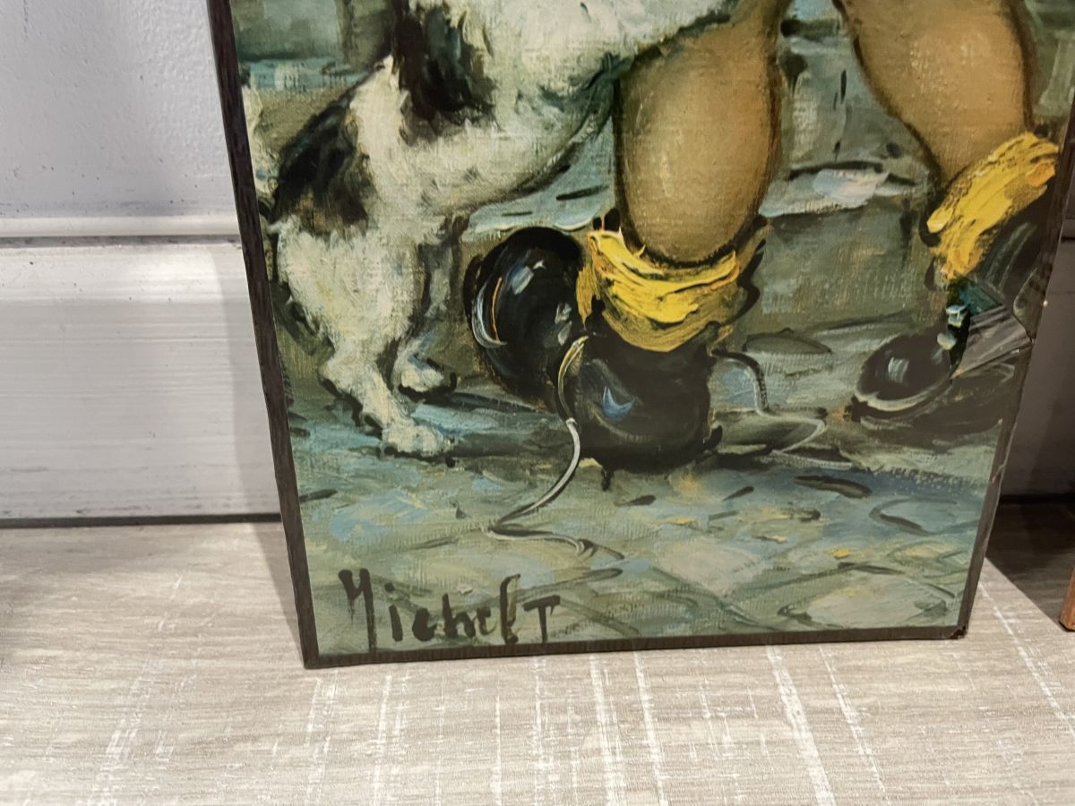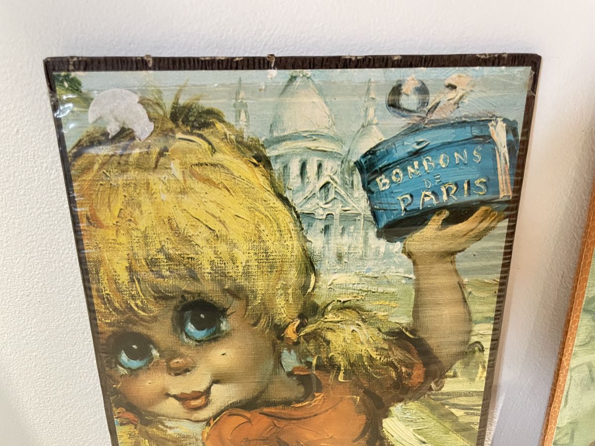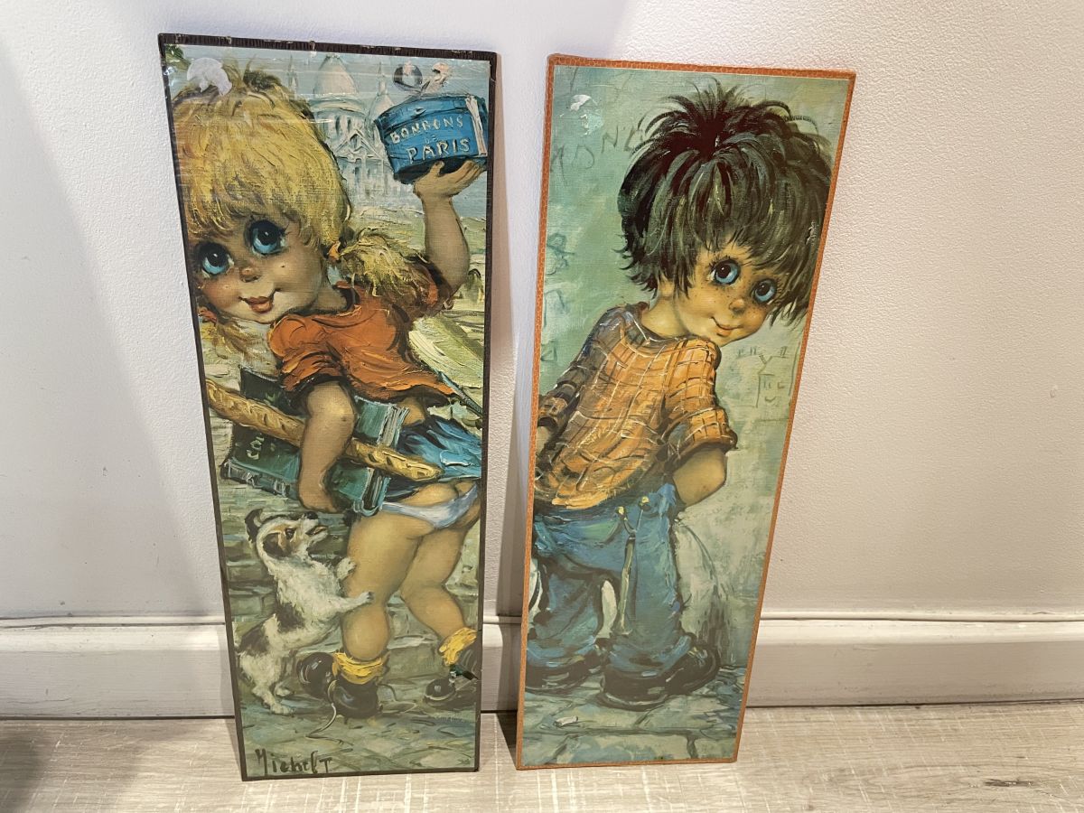 Lot de 2 tableaux de poulbots des années 70, signés Michel Thomas, 44x15cm, collage sur carton, état neuf, encore sous blister (voir photos), idéal pour créer une accumulation dans une chambre d’enfant par exemple.