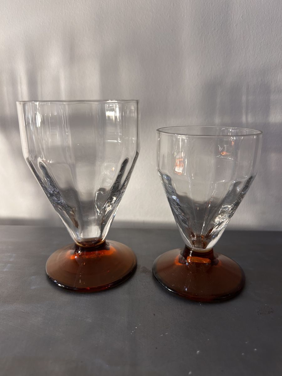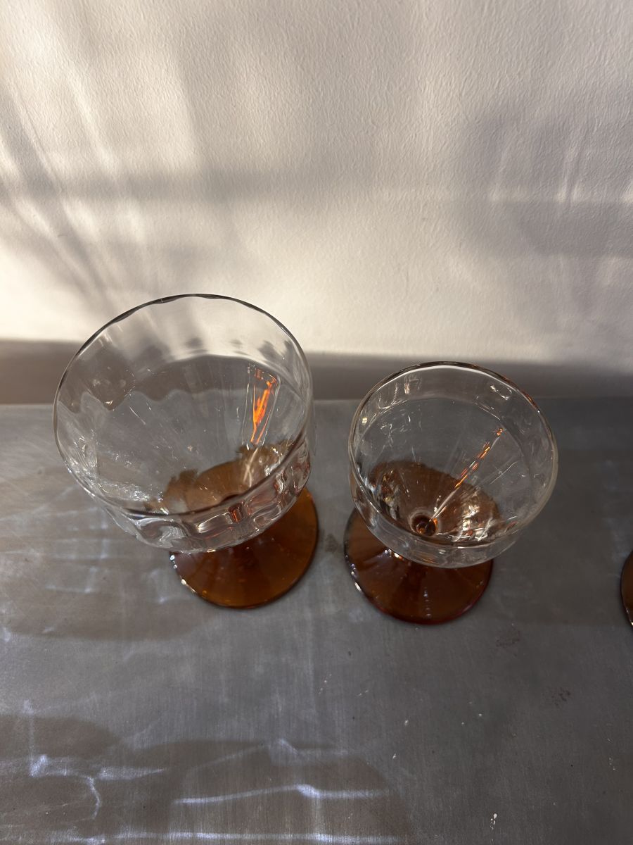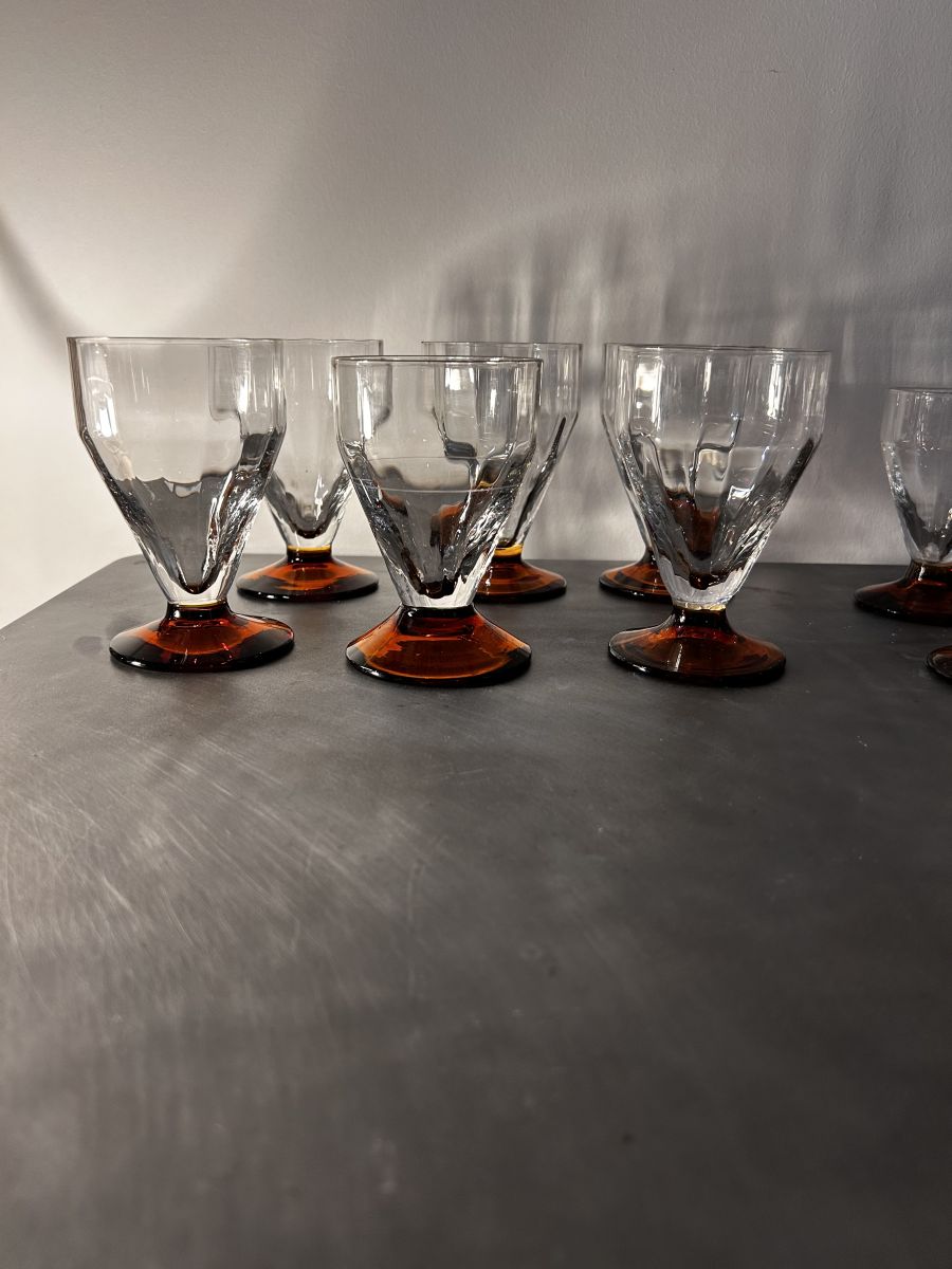 Service de 6 grands verre à eau et 9 petits verres à vin avec pied ambré.