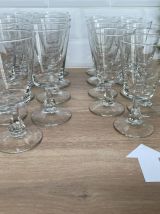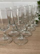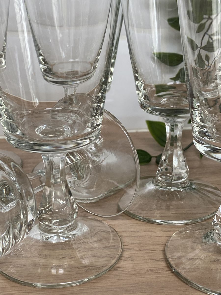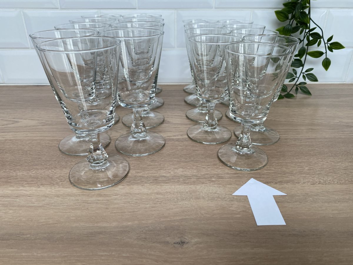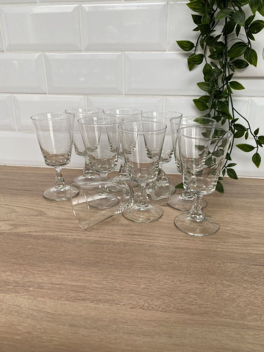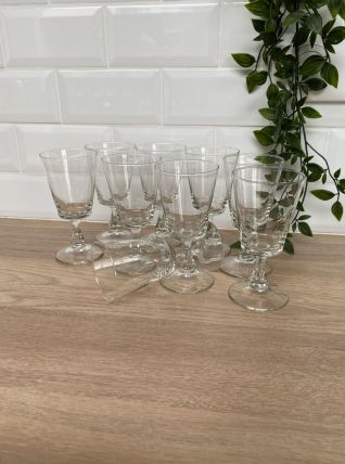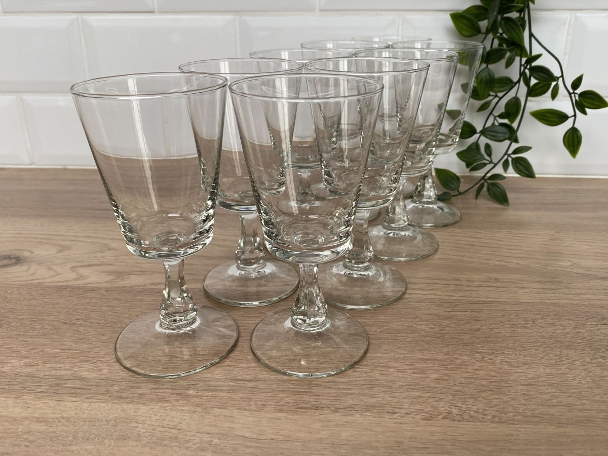 Set de 9 verres à vin blanc, forme tulipe, sur pieds courts de 5,5 cm, contenance de 12 cl, diamètre du buvant 6,7 cm, diamètre du pied 6,3 cm, hauteur 13,5 cm. MAM7