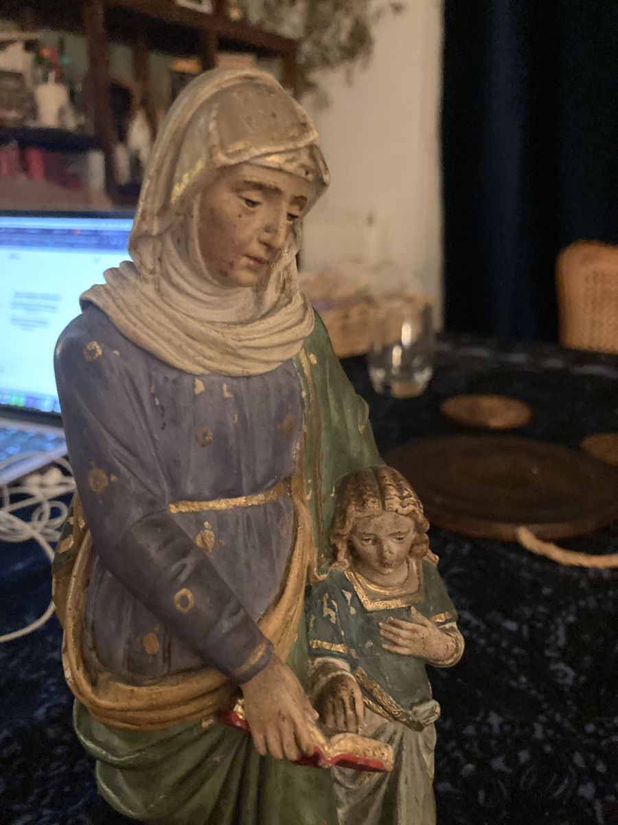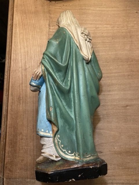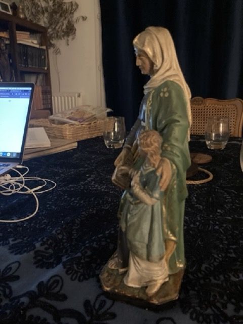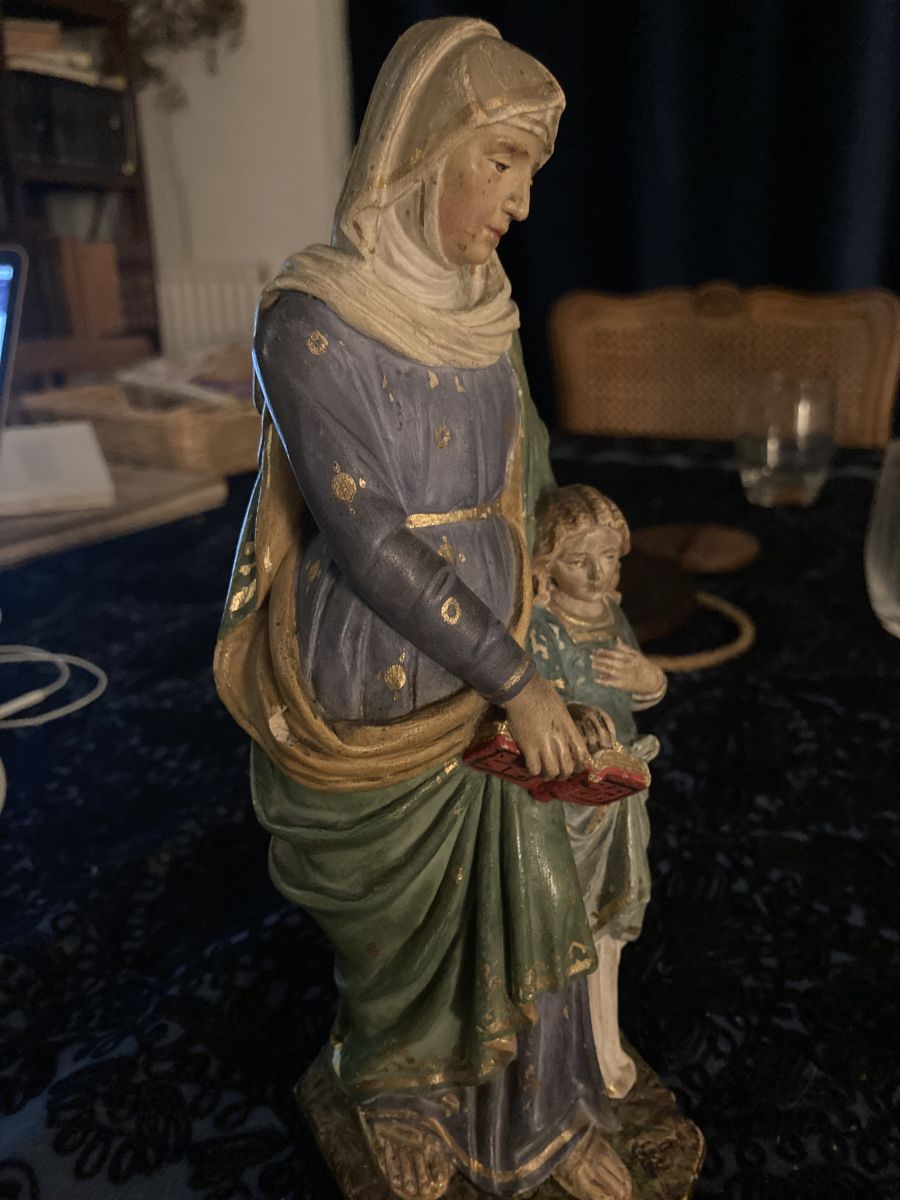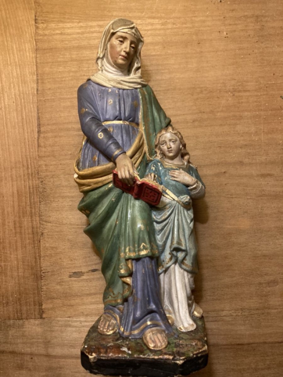 Ancienne statue Vierge à l'enfant RARE Sainte Anne et la Vierge Marie, polychrome années '50 , sur socle noir en céramique, beau drapé et détails dorés sur la robe. Une réalisation minutieuse sur les visages, les pieds et mains.