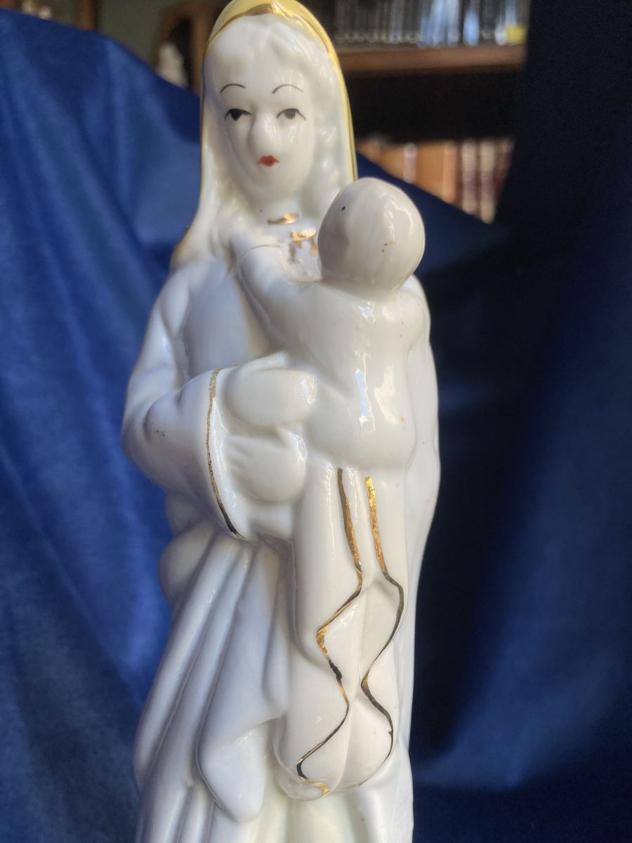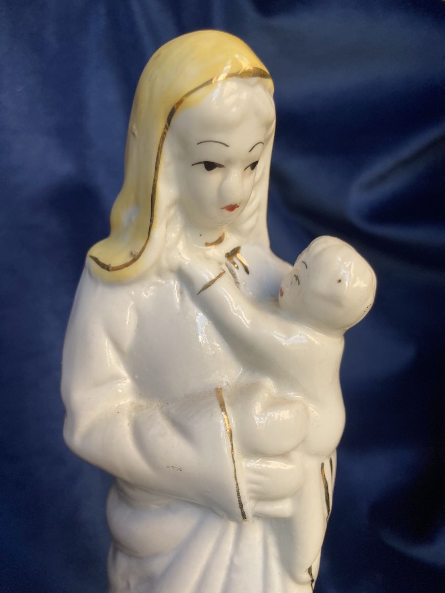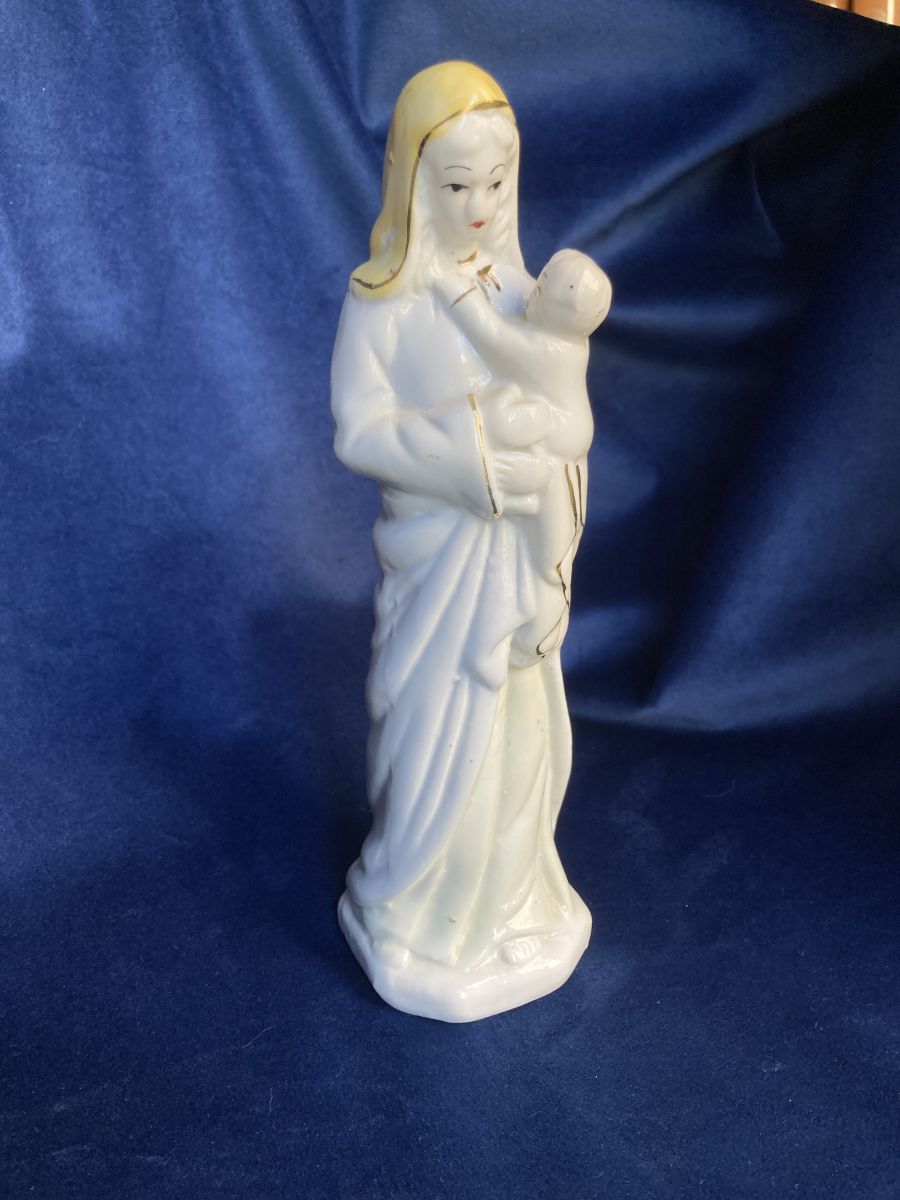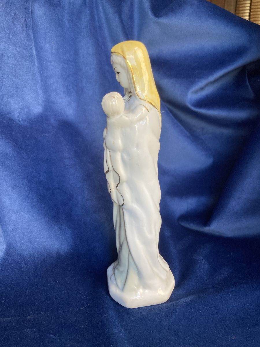 RARE Vierge à l'enfant porcelaine peinte à la main XIX- début XX , possible style Napoléon III sur piédestal large 6cm. La VM porte une robe blanche et bleue pastel et jaune.Liseré doré. L'enfant est tourné vers la mère, une représentation pas fréquente. Impeccable état de conservation, sans fêlures. La statue ne porte pas de signature ni de marque.