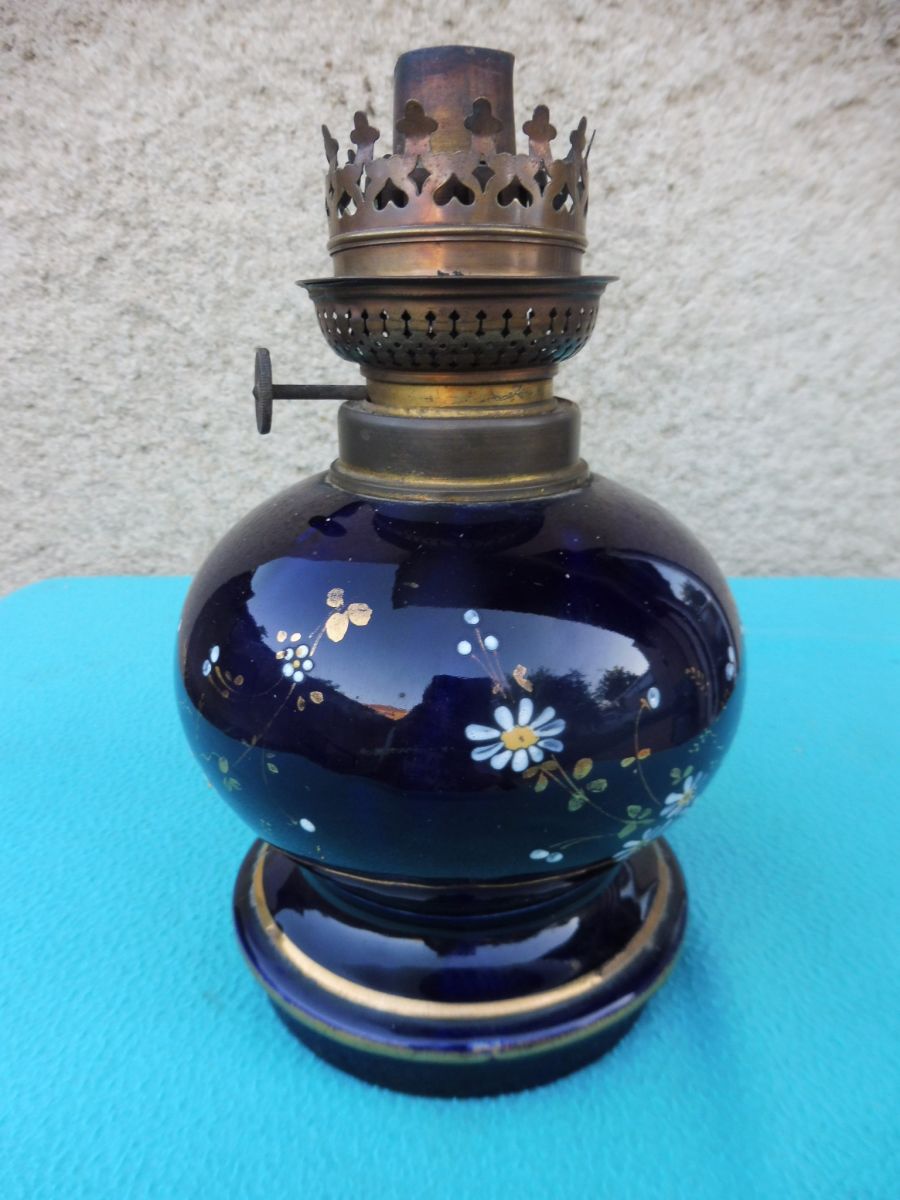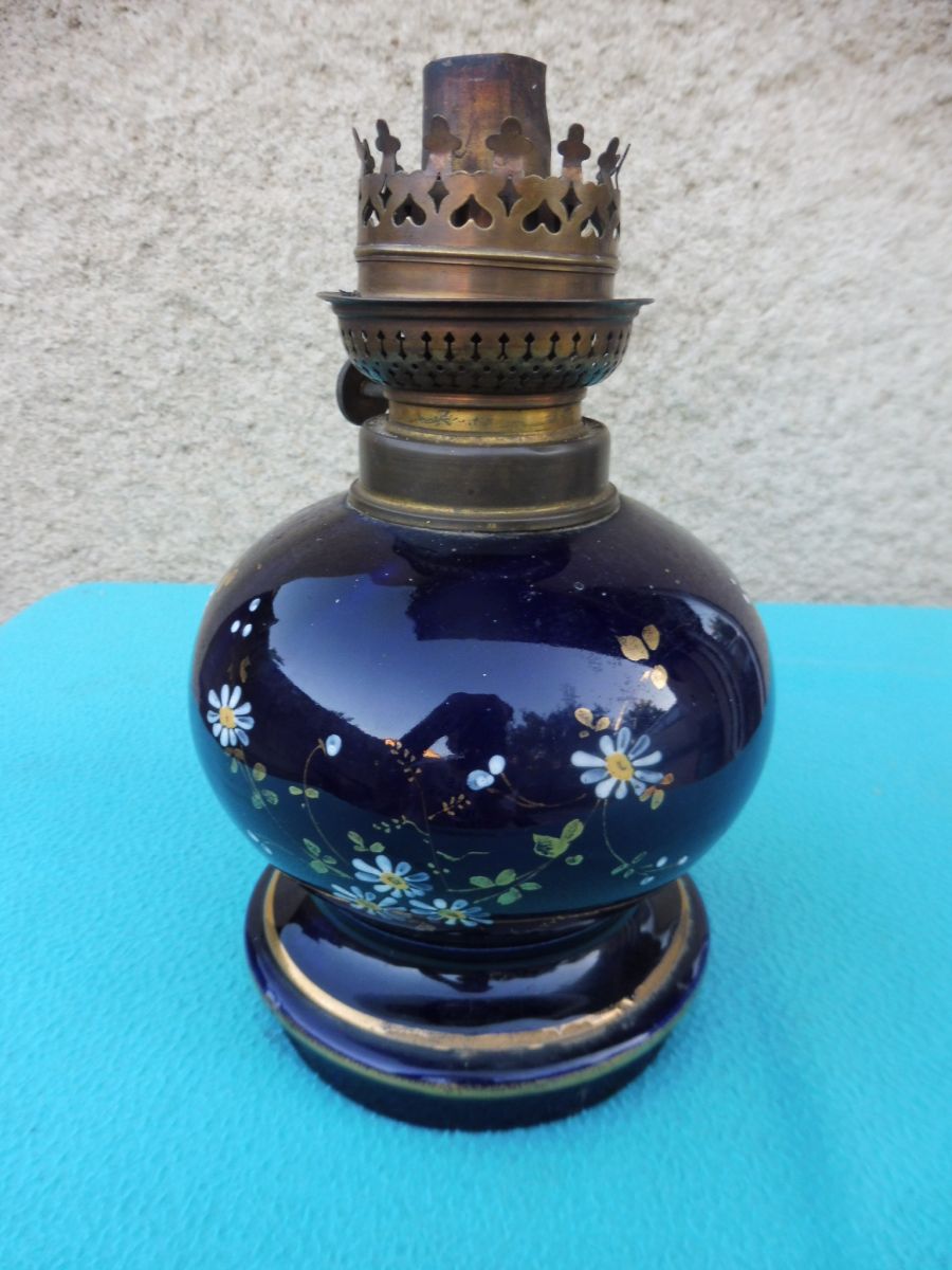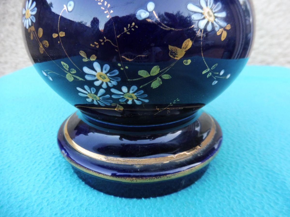 Pied de lampe ancienne céramique bleu nuit décor fleuri peint à la main. Très bon état.