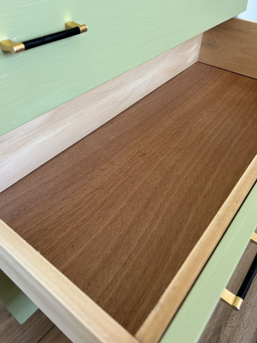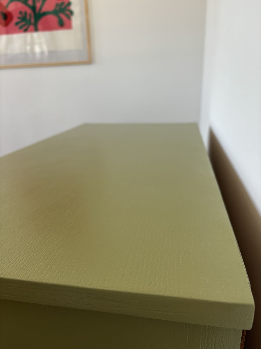 Étant de seconde main, la commode est légèrement gonflée sur le coté droit dans l’angle du bas (cf photo) et l’est sur le fond du plateau ce n’est pas visible à l’œil on le sent un peu au touché. Les parties ont été réparées avec un produit durcisseur.