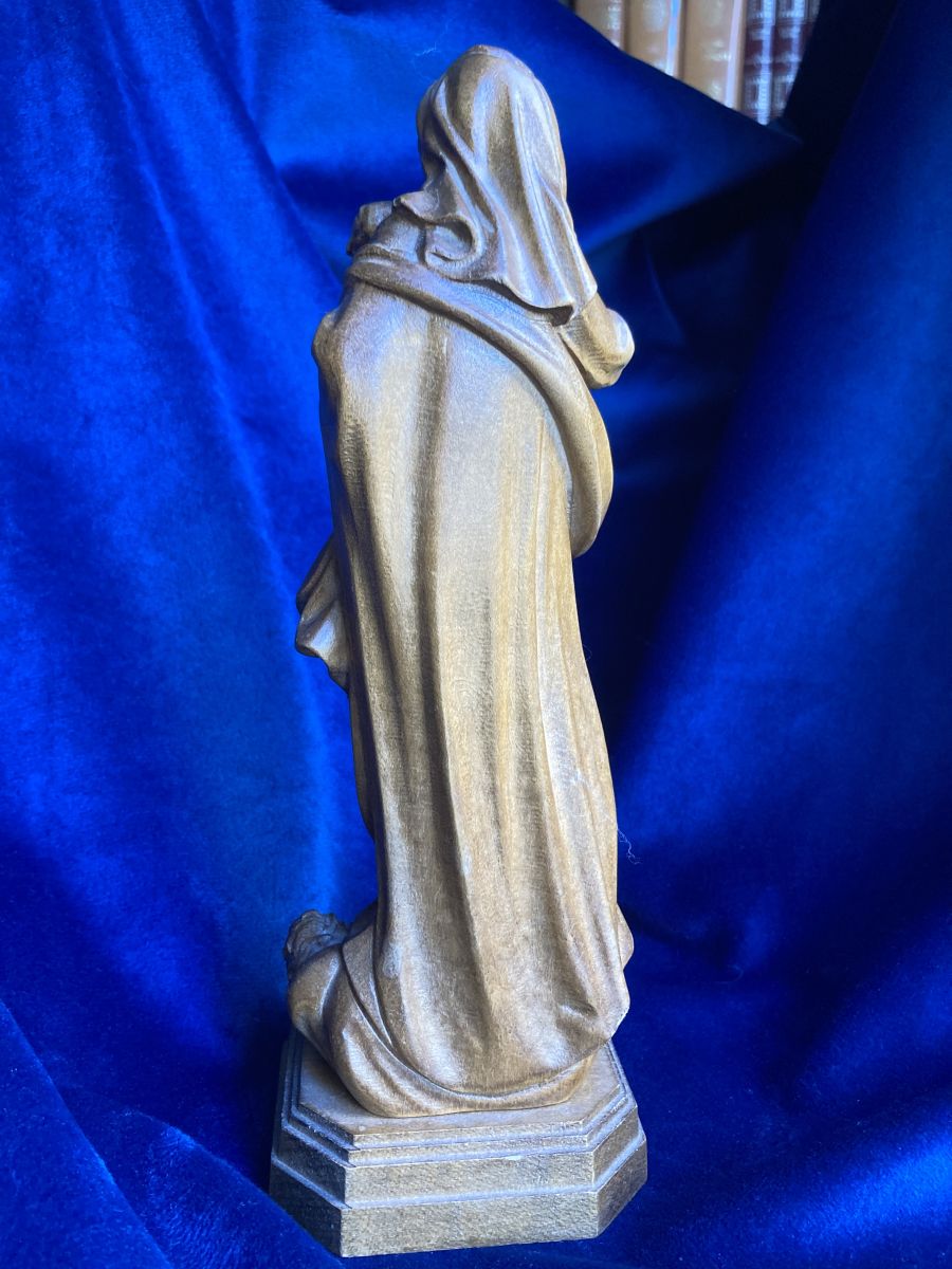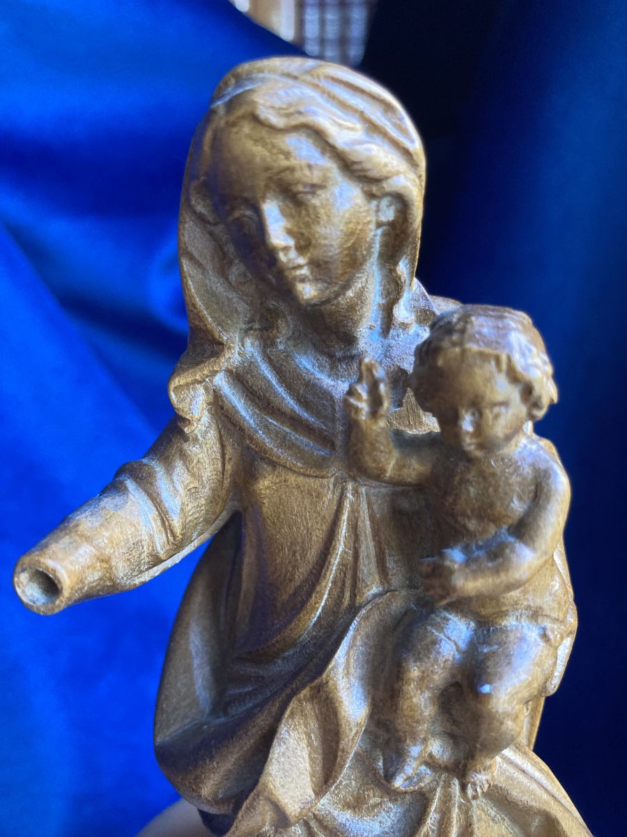 Vierge à l'enfant style néo-baroque du fin de XIX siècle, agremmentée de trois têtes d'anges décorant le promontoire de la VM. Le moulage est faite en résine de bois d'une seule pièce. La statuette souligne la bénédiction latine et la bénédiction grecque :