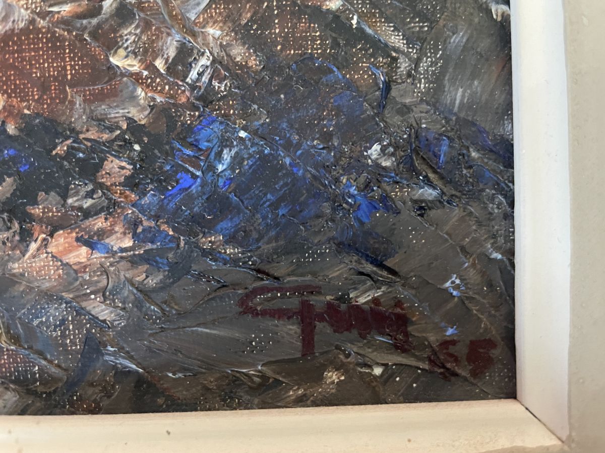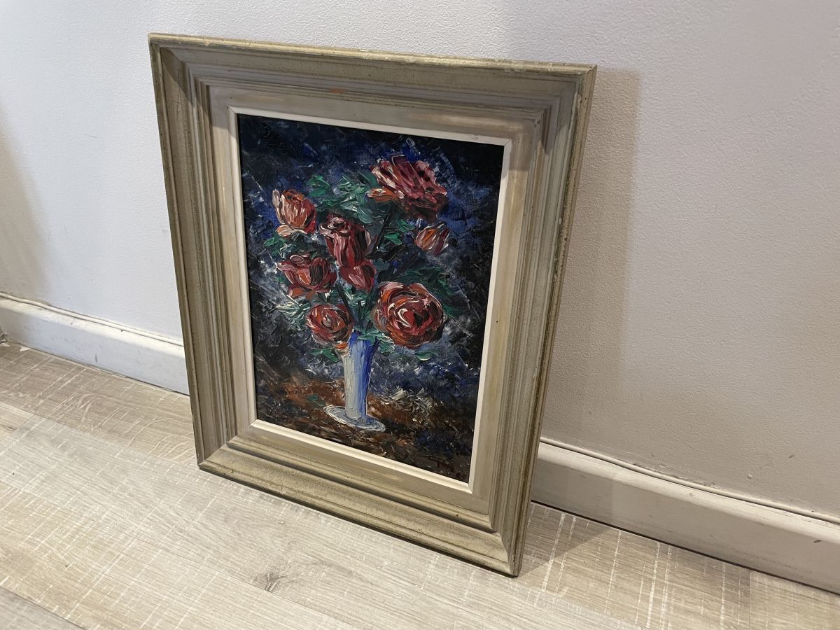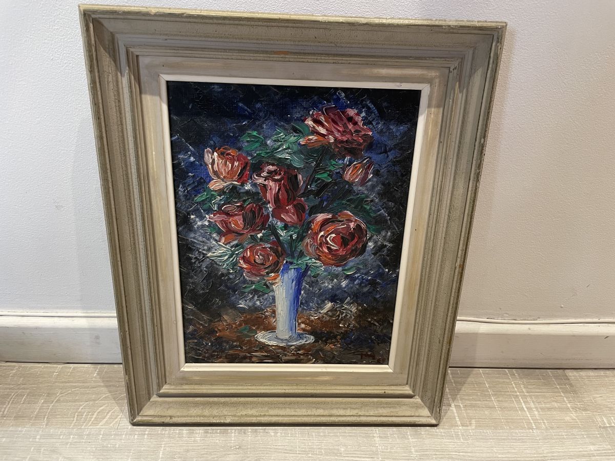 Huile sur toile représentant un bouquet de roses, signé en bas à droite et dédicacé à gauche (« à ma petite Claude »), probablement un travail français du milieu du 20è siècle, dimensions (cm) : L.38xH.46xP.6, peinture 33x25cm, bon état.