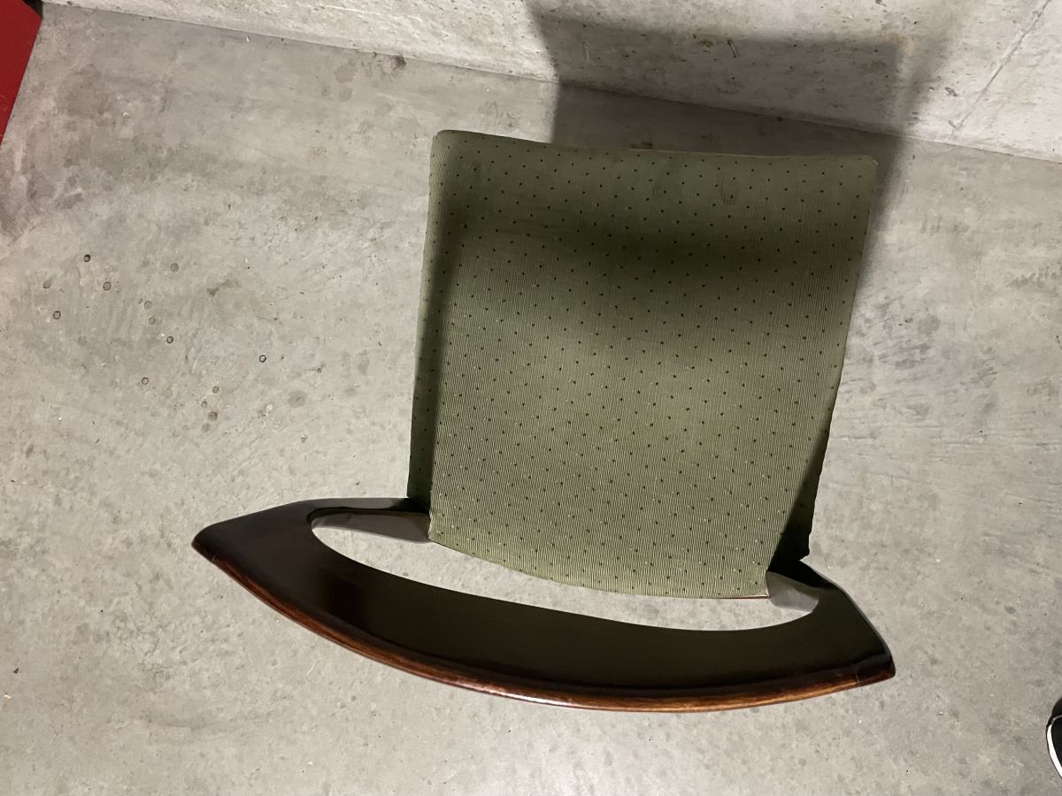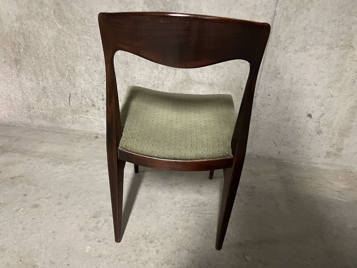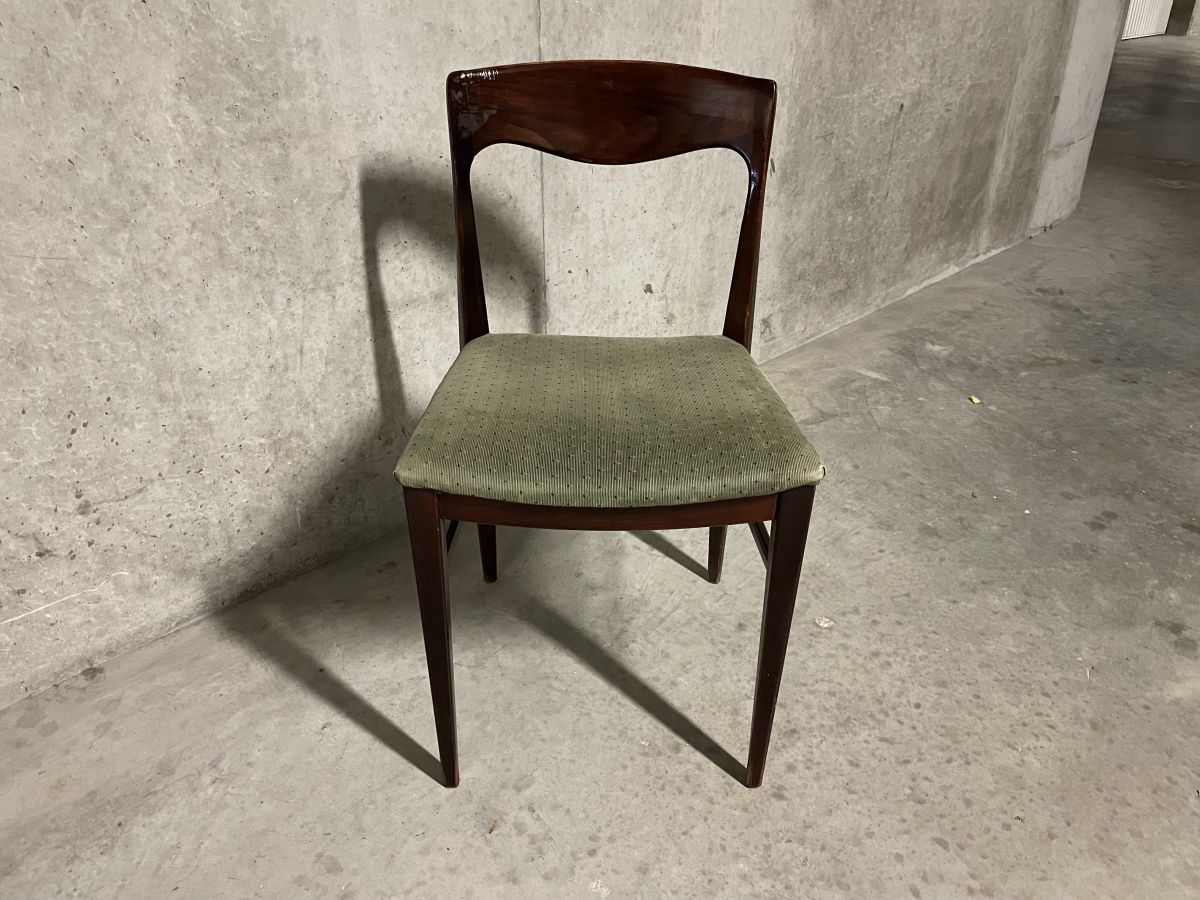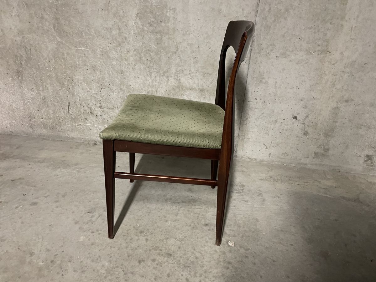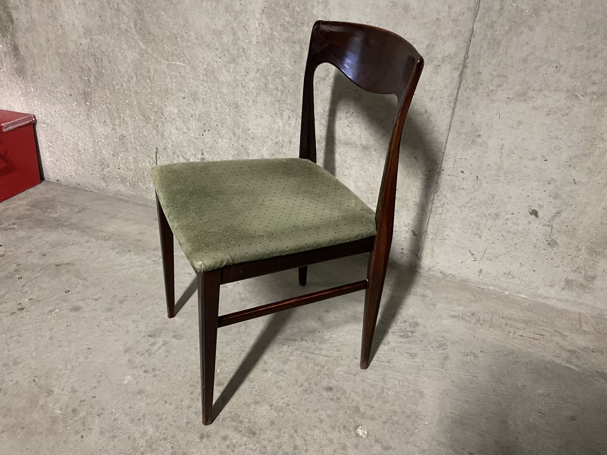 Chaise en bois massif des années 60 dans le goût de Baumann, assise en velours vert clair, légères traces d’usage (voir photos), hauteur 84cm, hauteur assise 46cm, assise 45x45cm, bon état.