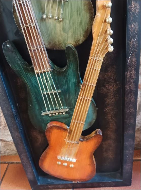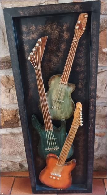 Un panneau mural, en métal, à décor de 3 guitares, avec élément de fixation au dos.