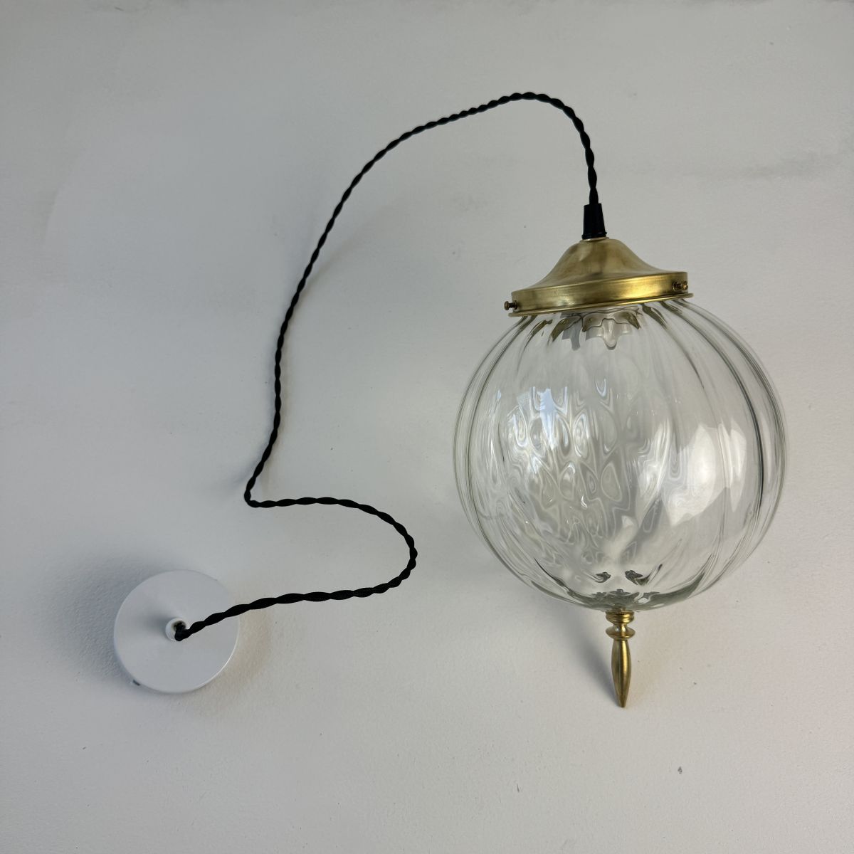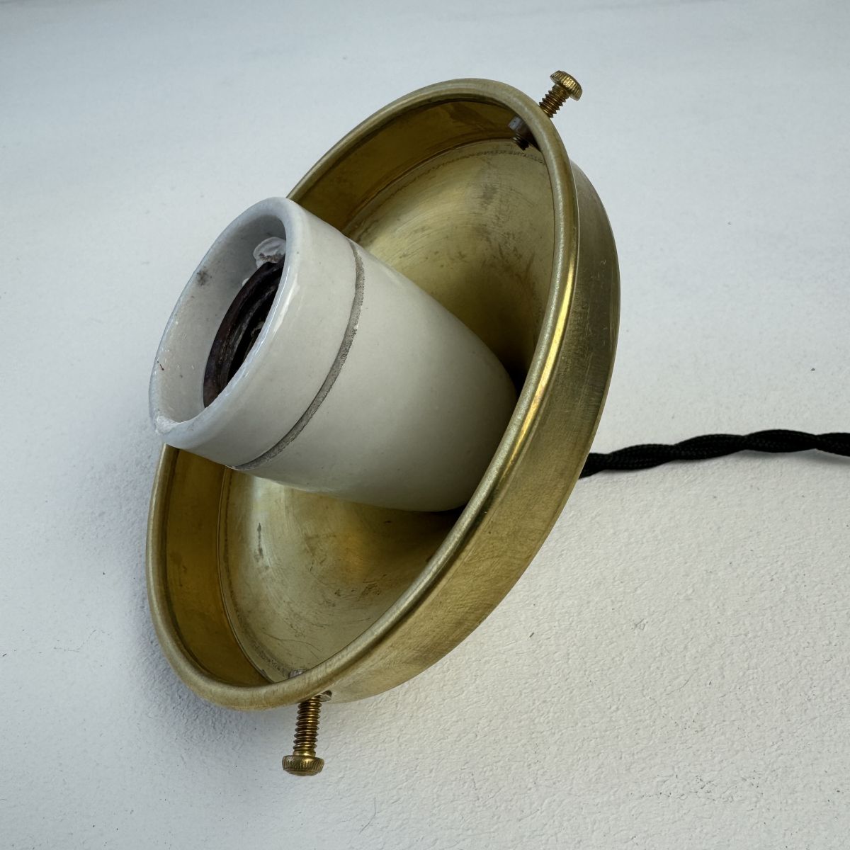 Electricité refaite à neuf avec fil noir en tissu tressé. Prête à brancher par domino. Douille à vis gros culot (Ampoules E27). Rosace en métal blanc pour accroche au plafond.