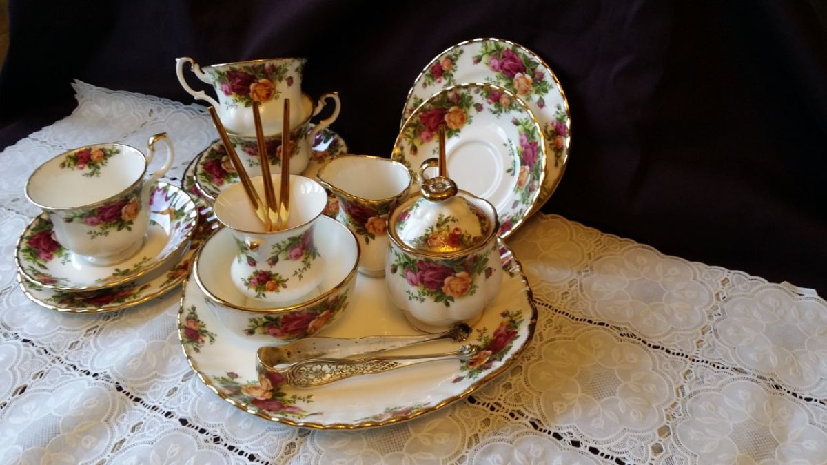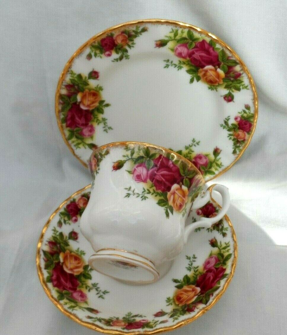 Très rare et Sublime service à thé/ pâtisserie/gâteau/ petit déjeuner Royal Albert(13 pièces) estampillé 1962. Le motif Old Country Roses a été conçu par Harold Holdcroft en 1962, inspiré d'un jardin de campagne typiquement anglais avec des roses en pleine floraison. Des grappes de roses rouges, roses et jaunes ont été conçues dans un style flamboyant avec leurs bords frappants - complétées par de subtils volants et dorures à l'or 22 carats et incarne tous les éléments essentiels de la porcelaine fine anglaise. Ce service se compose des éléments suivants: