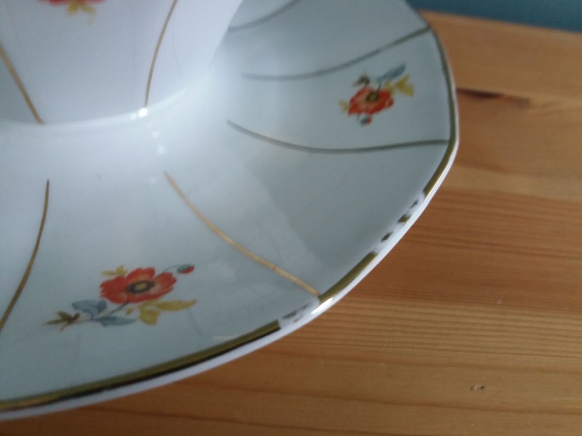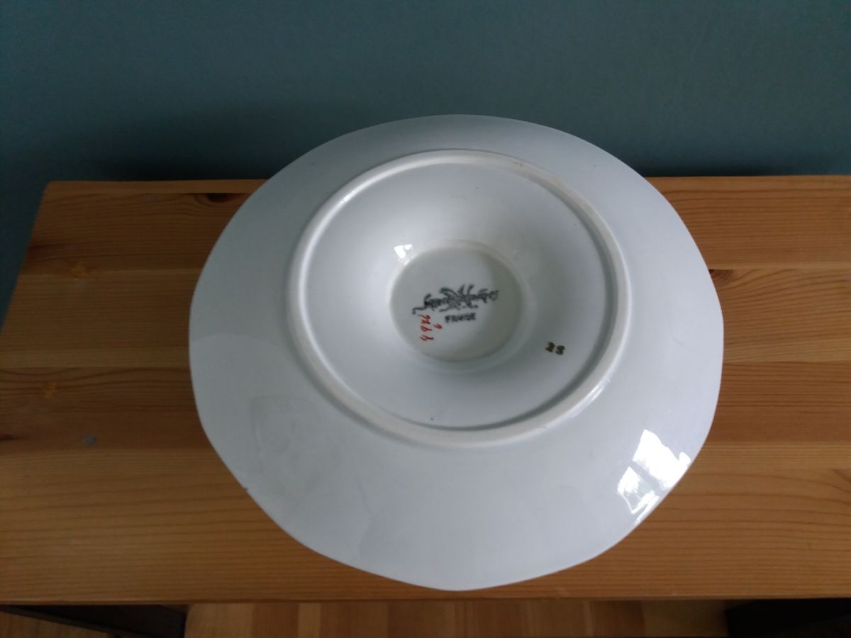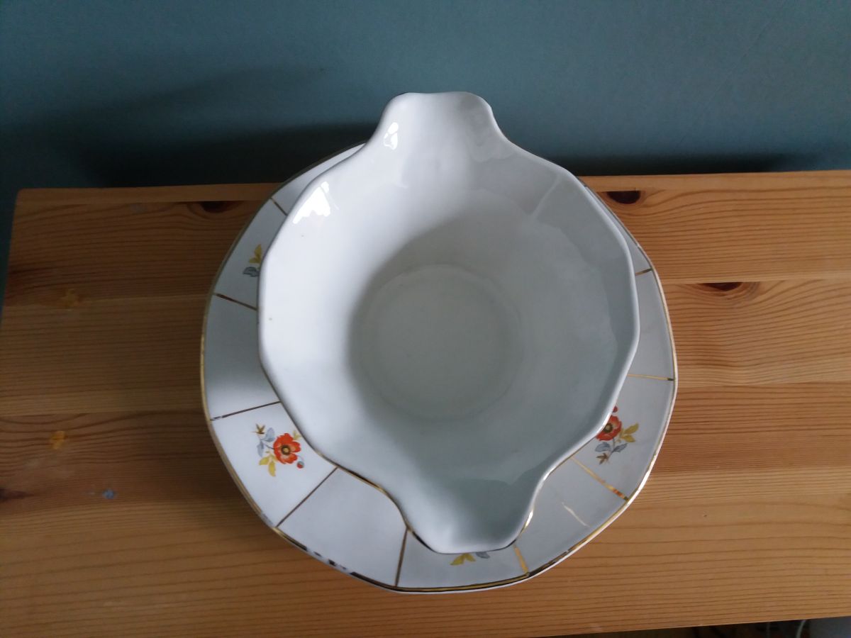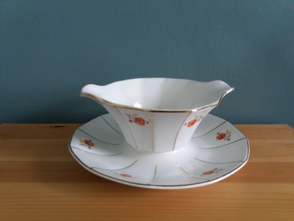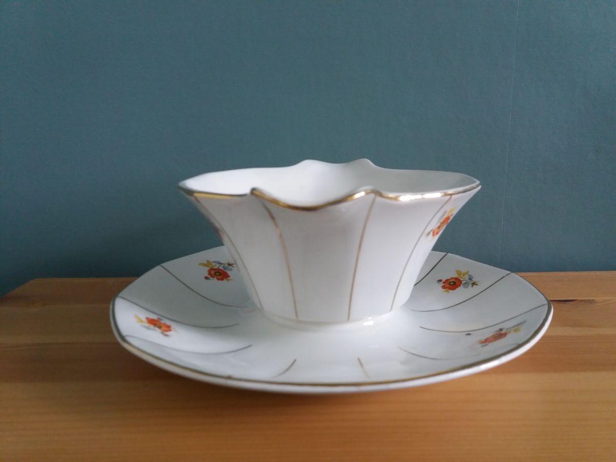 Charmante saucière en céramique blanche décorée de motifs floraux dont les lignes qui évoque le style art déco sont soulignées par des liserés dorés. Elle est estampillée Sarreguemines dessous, et selon mes recherches sur cette estampille elle daterait d’entre 1920 et 1950. Elle est bel état, ni fêle, ni égrenure, mais comporte un signe qui témoigne de son âge : le liseré doré sur le bord de l’assiette est estompé en deux endroits. Cette saucière mesure 21 cm de diamètre au niveau de la coupelle, 17 cm par 14 cm pour la partie contenant, et 8,5 cm de hauteur.