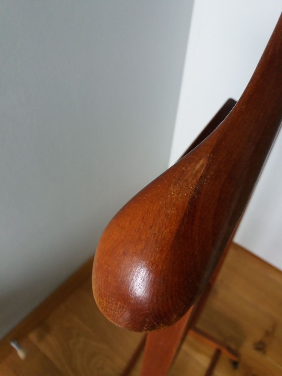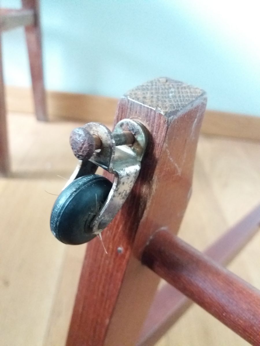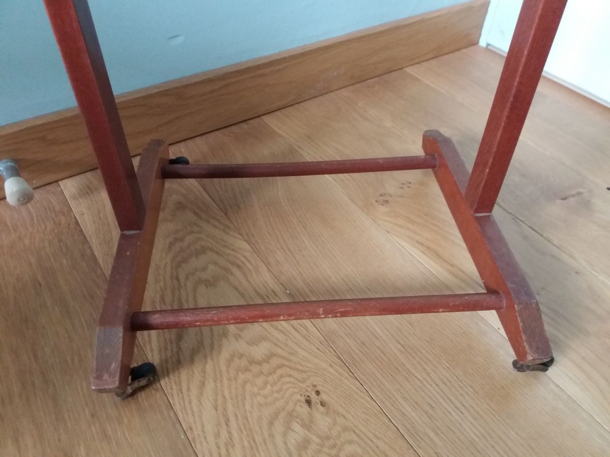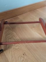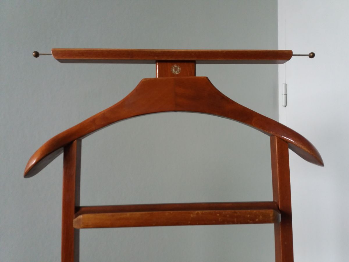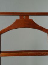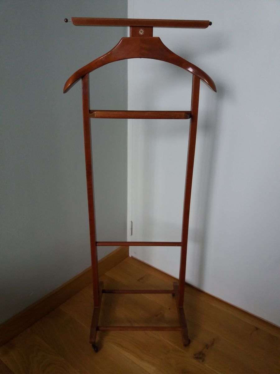 Charmant valet de chambre de la célèbre marque italienne Fratelli Reguitti datant probablement des années 60. Le logo de la marque est apposé dessus avec le marquage « brevettato - made in Italy » Il est en bois massif verni. Le piétement comporte 4 petites roulettes en métal et plastique dur noir pour les roues. Il comporte deux petites tiges rétractables en métal avec une boule à l’extrémité pour accrocher cravates, foulards ou colliers et une petite tablette bien pratique pour poser montre, lunettes et bijoux. Il est bon état structurel, encore bien solide, les roulettes sont bien mobiles sur leur axe vertical mais il comporte évidemment des marques qui témoignent de son âge et de l’usage: les roues (parties en plastique noir) tournent mais pas de manière très libre (j’ai déjà passé une heure à les nettoyer, ôter les fibres qui empêchent une parfaite mobilité, mais on peut encore faire mieux), les parties en bois comportent des marques diverses, petites marques de coups, zones où le vernis apparaît craquelé (mais ne s’effrite pas), marques d’abrasion dont une plus visible sur le l’épaule (une petite touche de vernis brillant serait idéale). On notre aussi de la corrosion sur les parties en métal des roulettes mais qui ne remet pas en cause la solidité des roulettes. Il mesure 105 cm de hauteur, 44 cm au plus large (au niveau du cintre) et 32 cm de profondeur au niveau du piétement. Pour sa sécurité, il sera démonté en deux parties pour l’expédition : la base et le reste, il suffira de revisser l'ensemble (2 vis) à l'aide d'un tournevis ou même d'une simple lame de couteau.