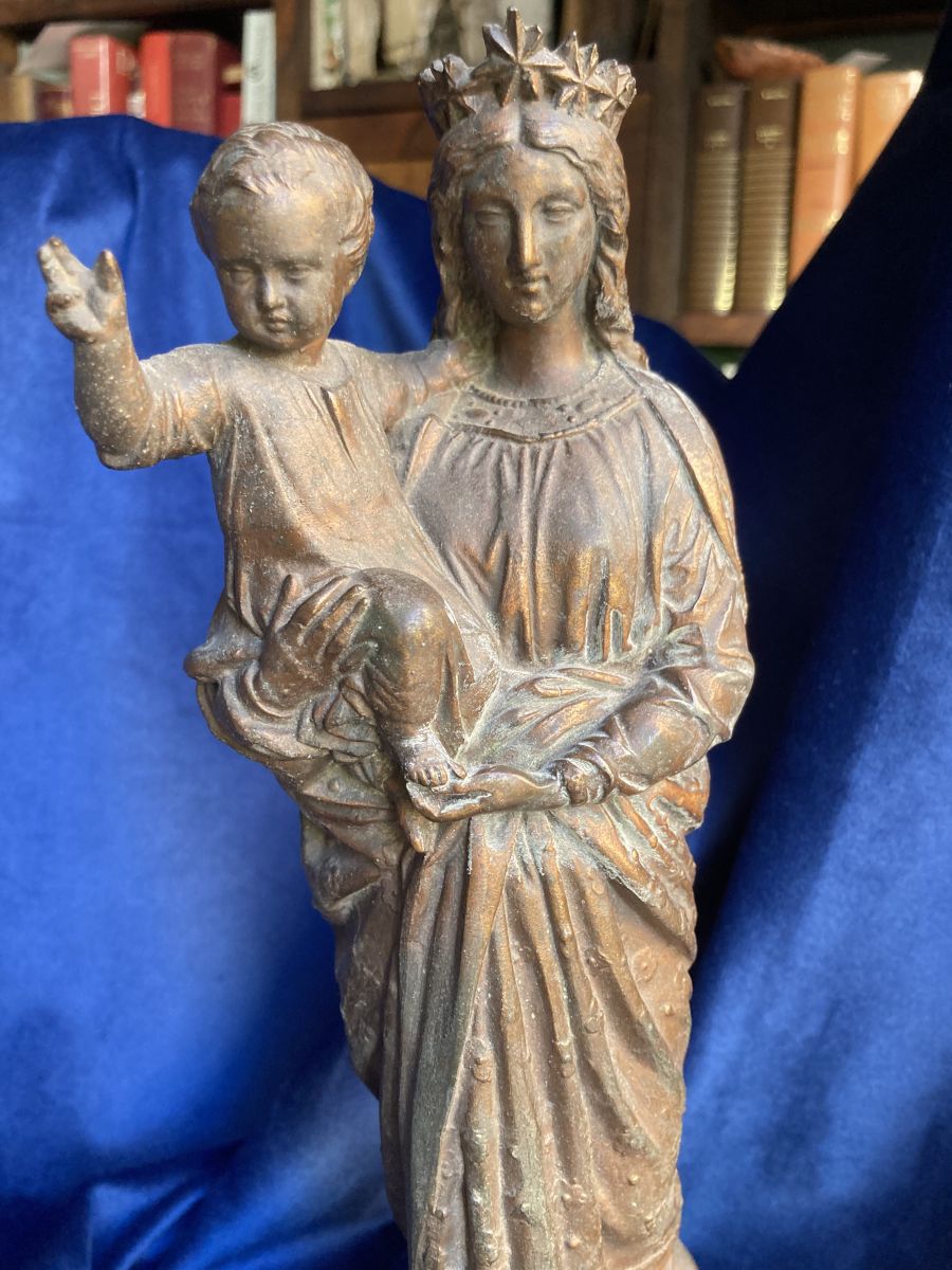 Vierge à l'enfant ND de France Regina Cœli Laetare reproduction sur socle, SANS DÉFAUTS, alliage cuivre, taille 30,5 cm. LAVM est couronnée, ses mains tiennent l'enfant Jésus ainsi que le drappé de son manteau au centre, montrant un grand travail de pliage effectué sur le moulage. De même, la coiffure de Regina Cœli se remarque d'autres modèles: cheveux ondulés extrêmement longs. Le Christ se présente avec les trois doigts, pouce, index et majeur, levés symbolisant la Sainte Trinité.