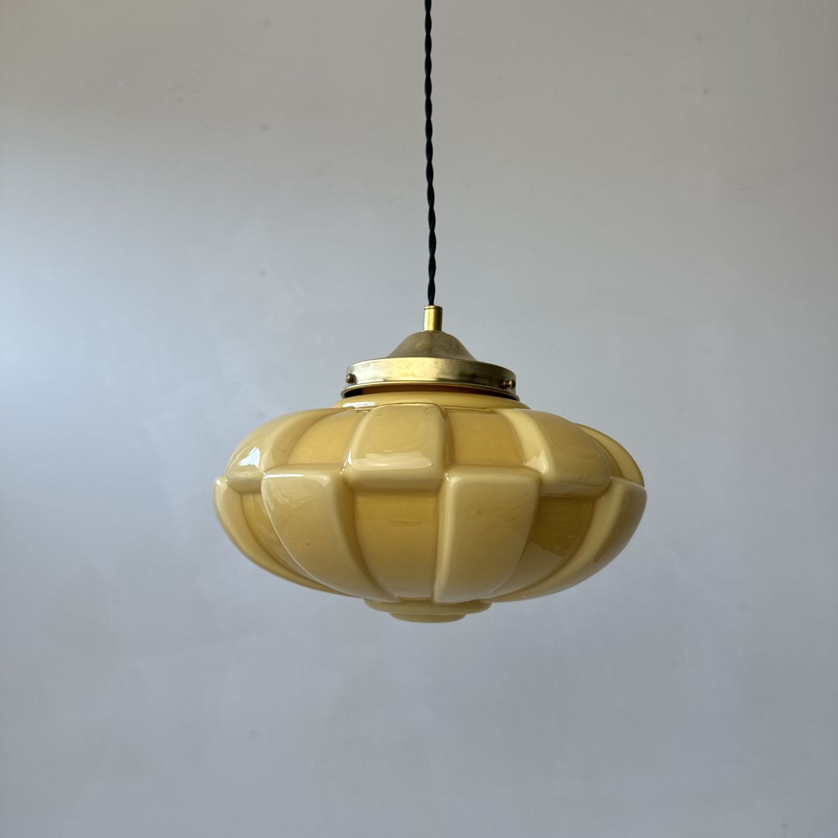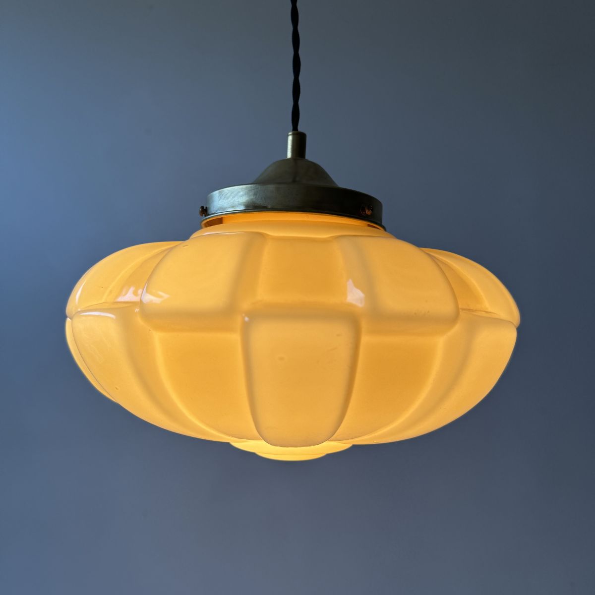 Magnifique suspension en opaline couleur ambre des années 1930. Superbe lumière et très bel état.
