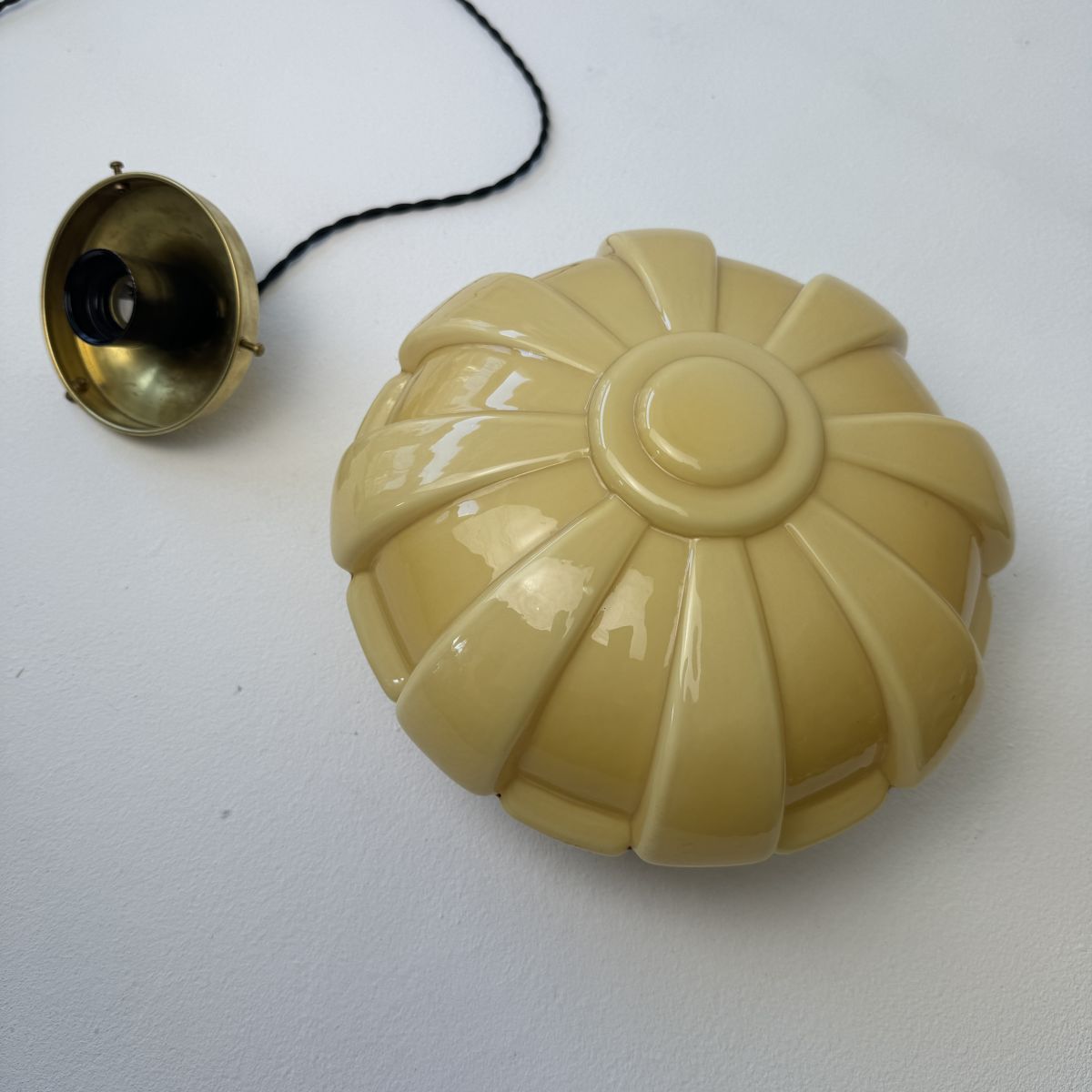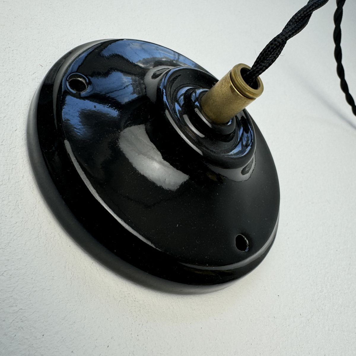 Electricité refaite à neuf avec fil noir en tissu tressé. Prête à brancher par domino. Douille à vis gros culot (Ampoules E27). Rosace en porcelaine pour accroche au plafond.