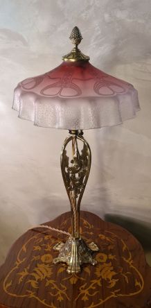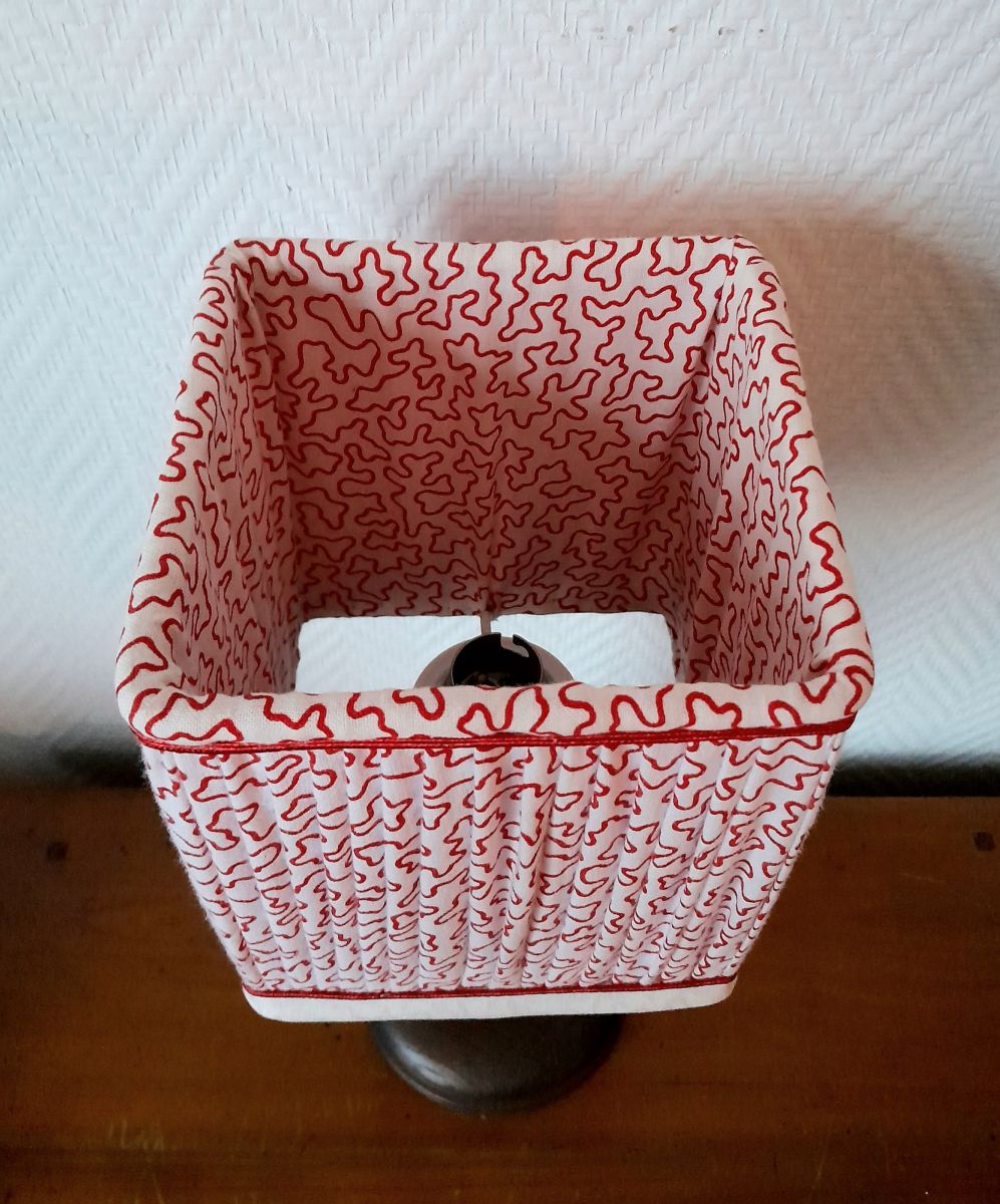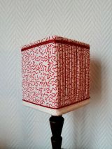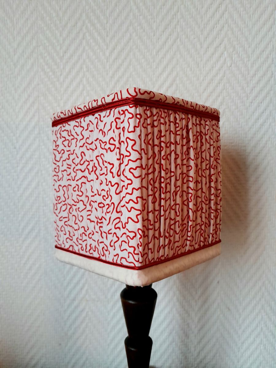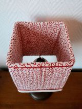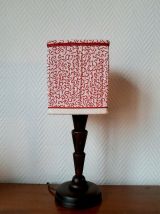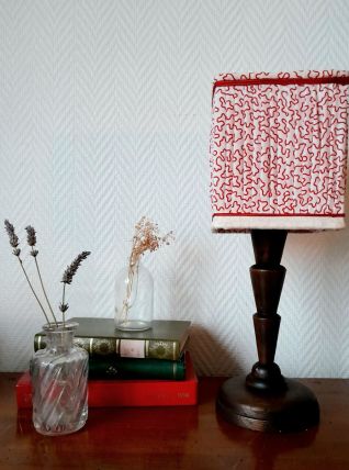Pied de lampe en bois sculpté art déco reposant sur une base ronde, agrémentée d'un abat-jour couture réalisé main. Abat-jour de forme carrée en tissu plissé plat, tissu blanc à motifs organiques rouge avec bordure blanche et sous-taches rouge.