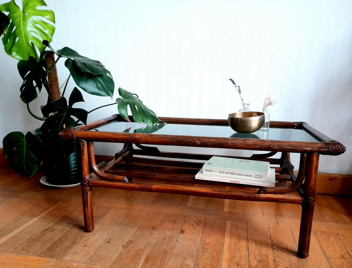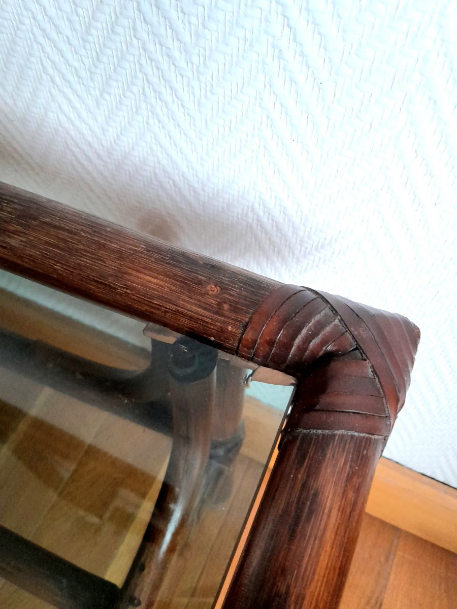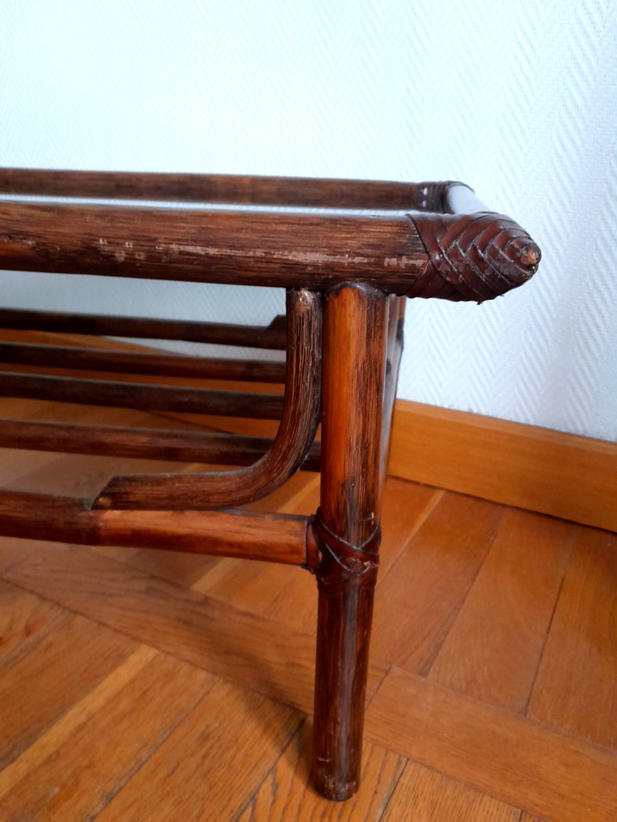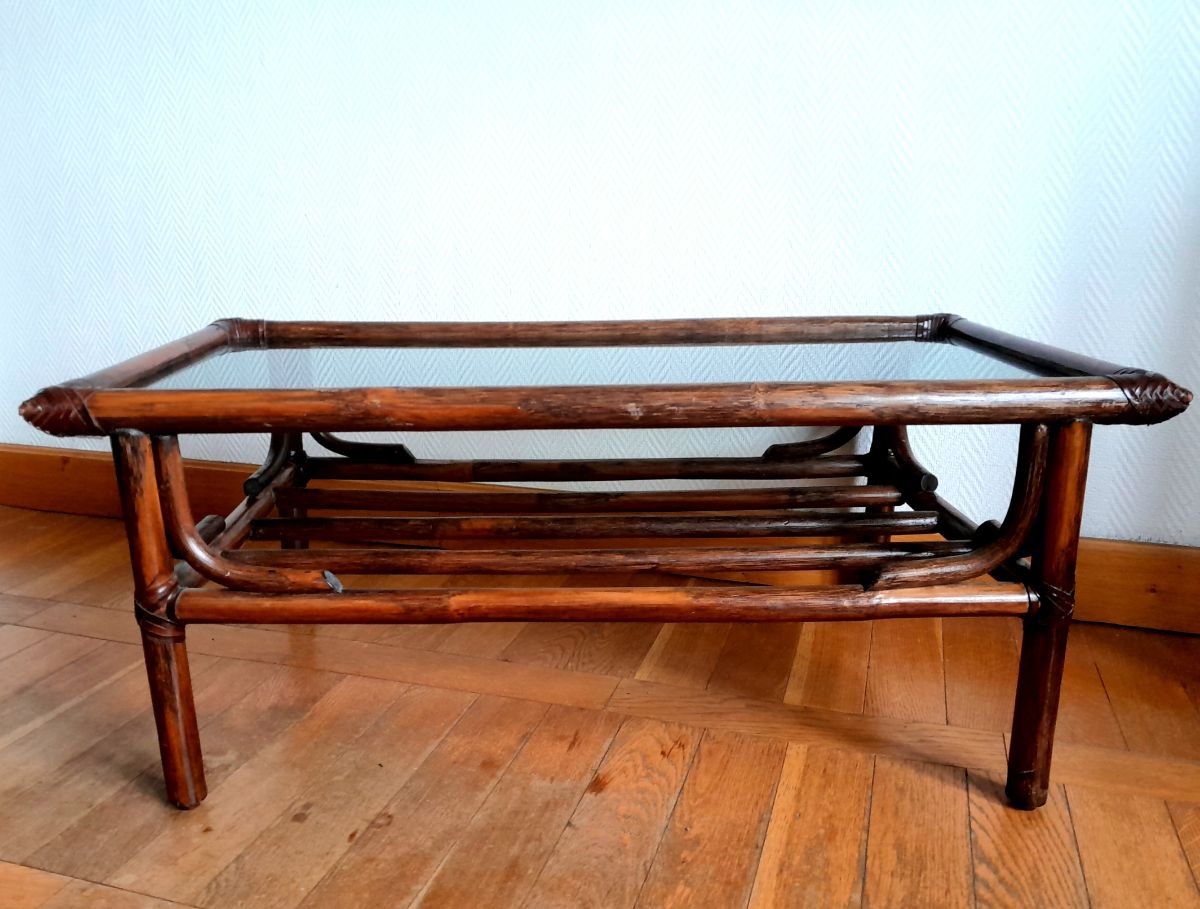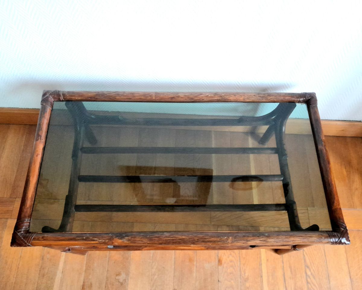 Structure en rotin avec lanières de cuirs aux raccords, emplacement inférieur composé de trois pièces de bambou faisant porte-revues. Le plateau est un verre fumé rectangulaire (avec un accident à un coin voir dernière photo).