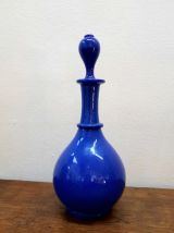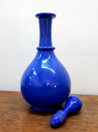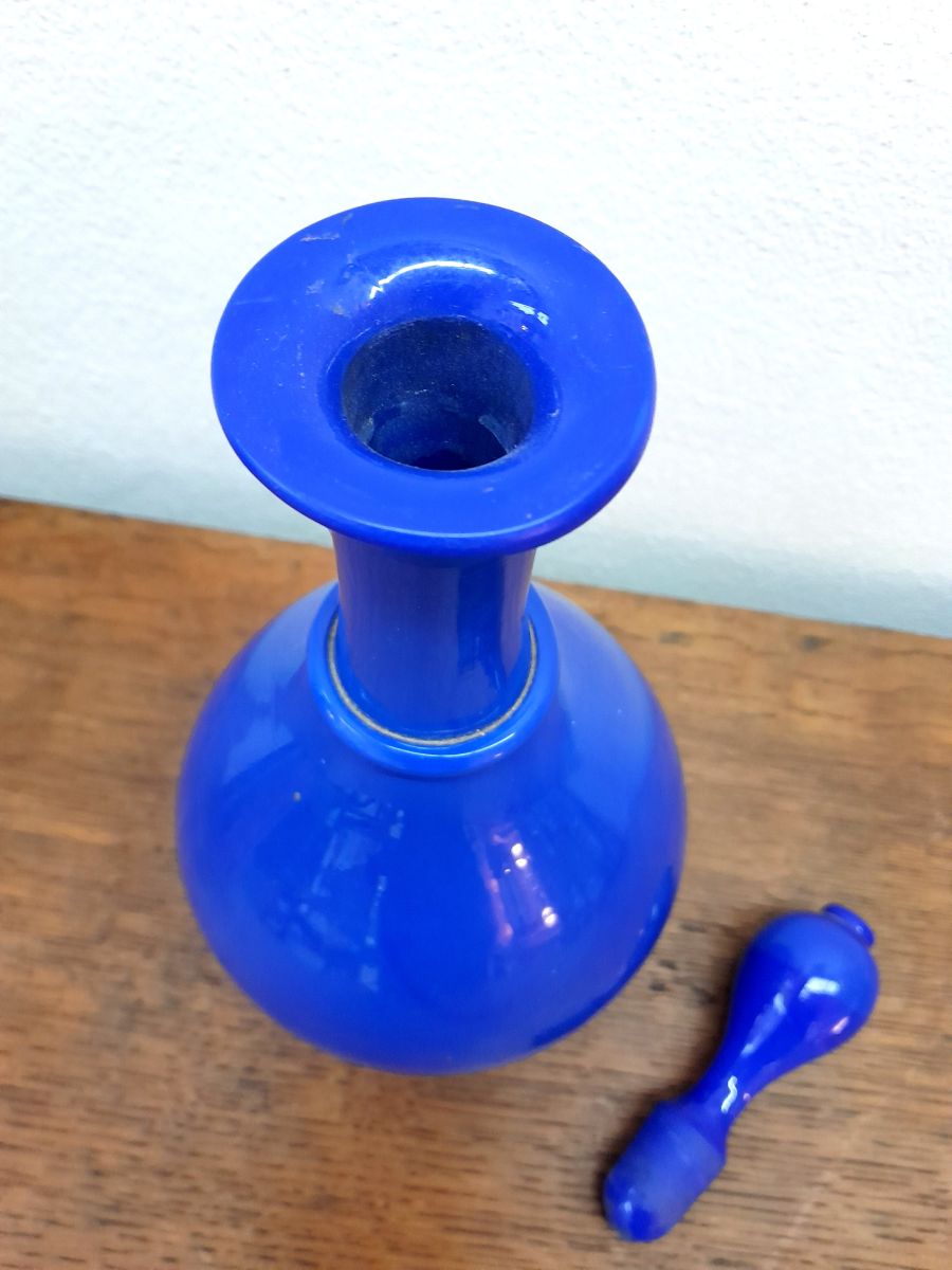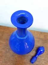 Carafe en opaline bleu cobalt avec son bouchon d'origine . Travail vintage vers 1950 reprenant les modèles du XIXème siècle.