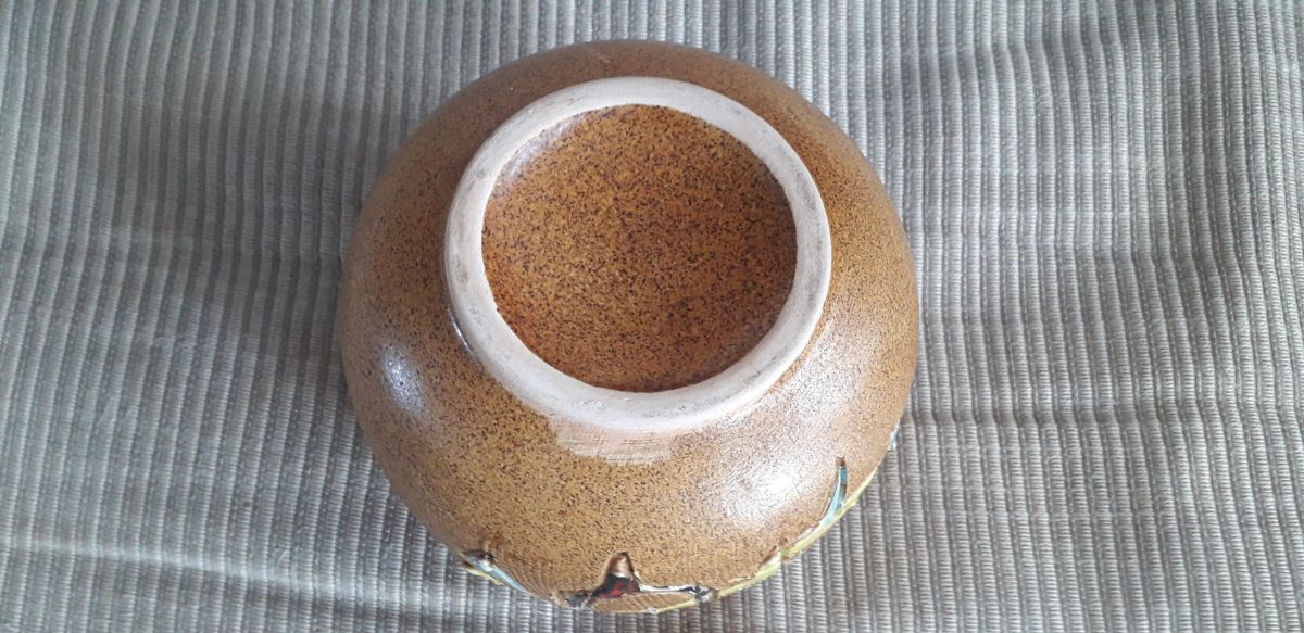 Vase vintage circulaire en céramique très original. Le décor comprend des figures géométriques colorées et un effet de matière strié et moucheté avec un bel effet des couleurs.