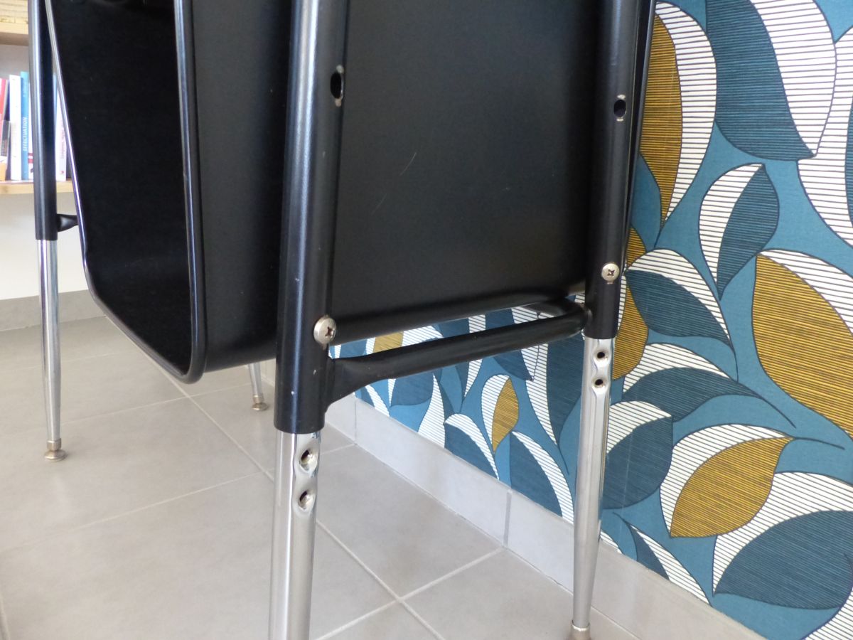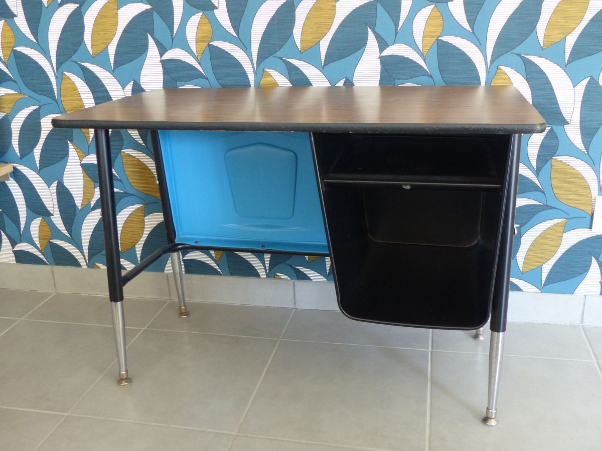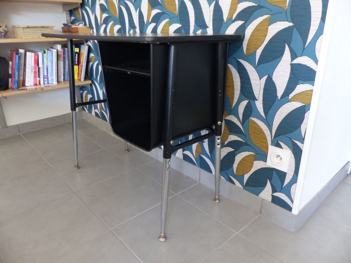 Petit bureau pour enfant. La structure est en métal et le plateau en bois.