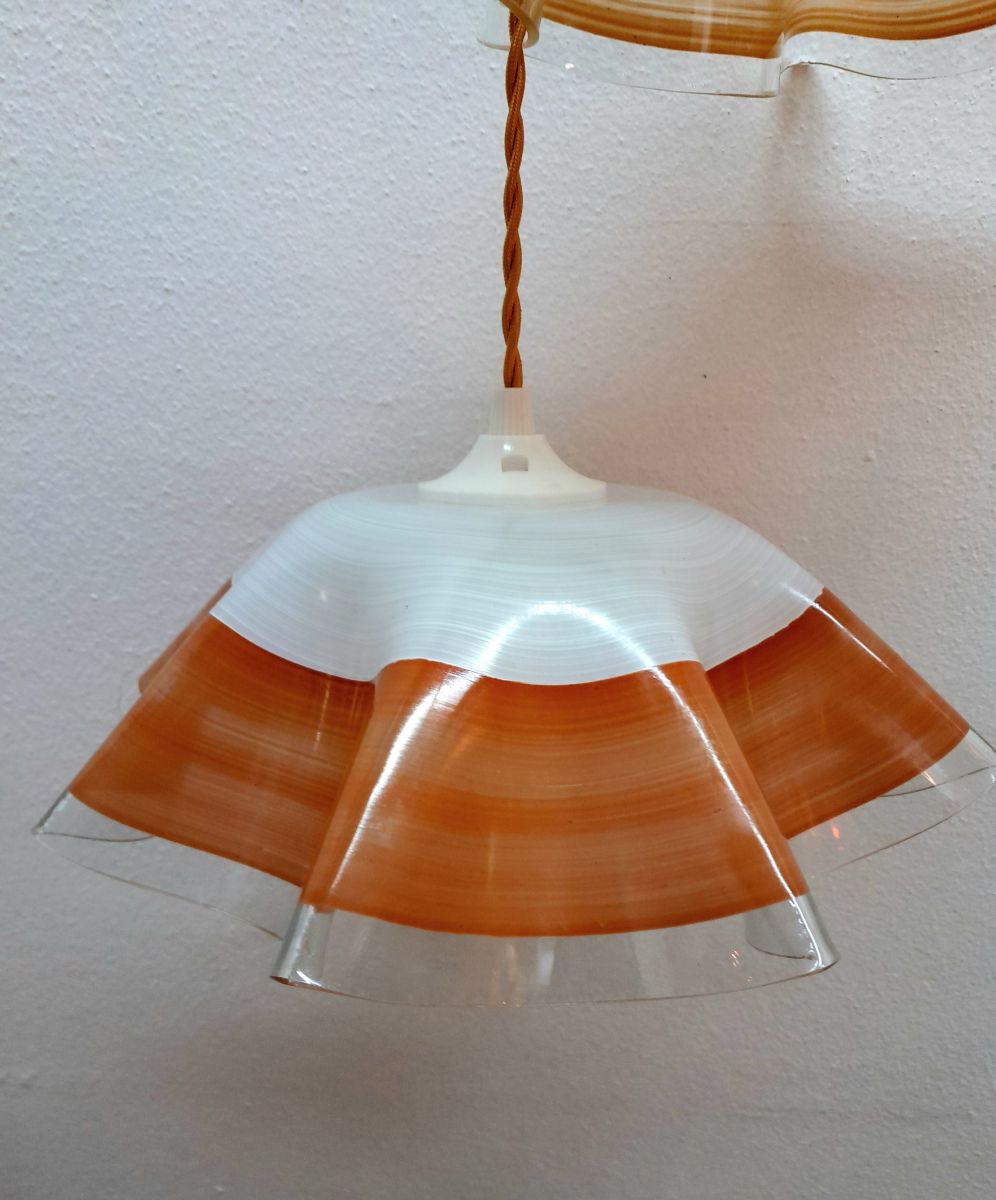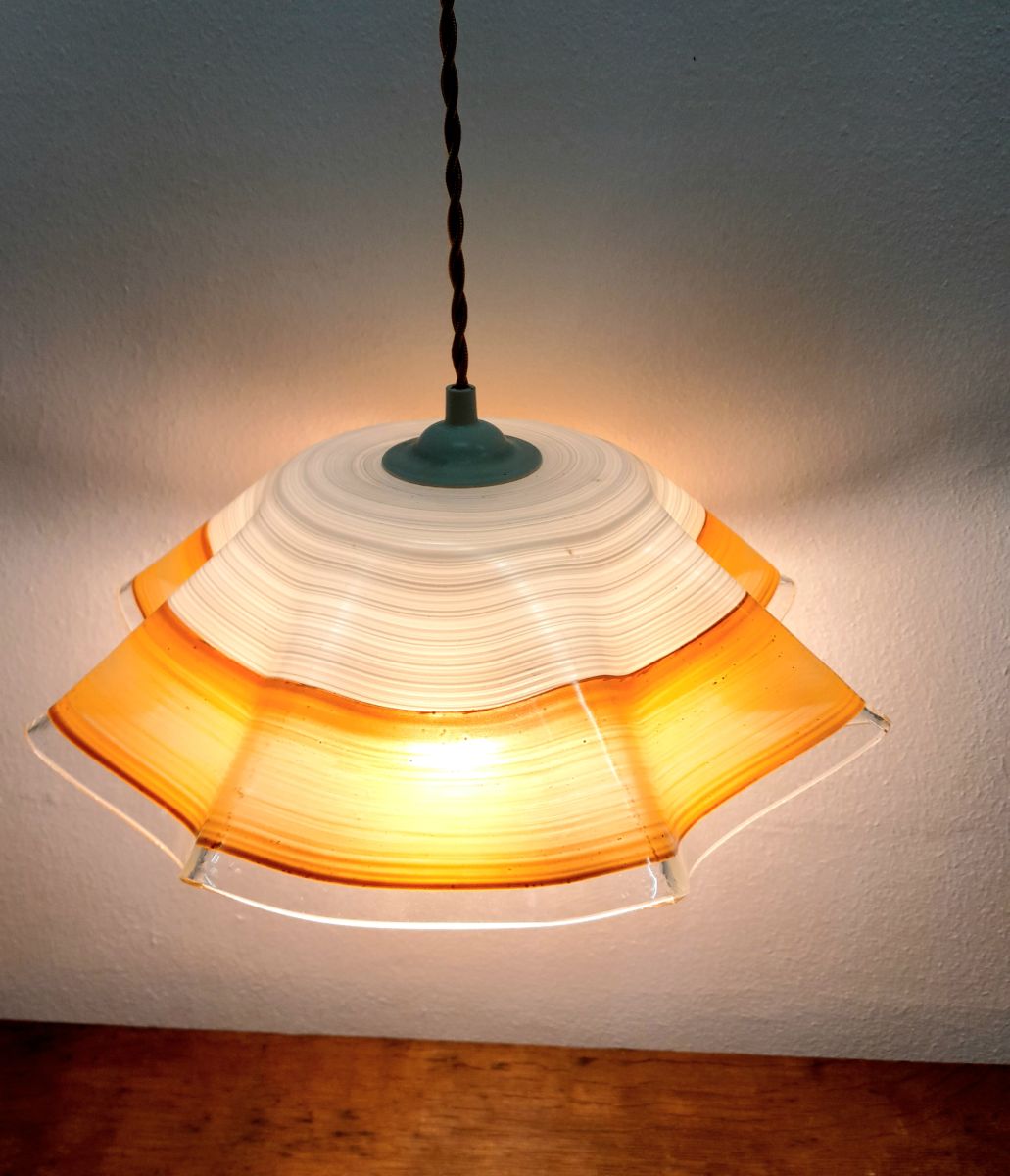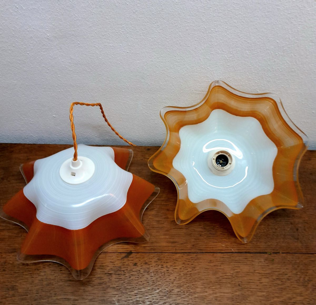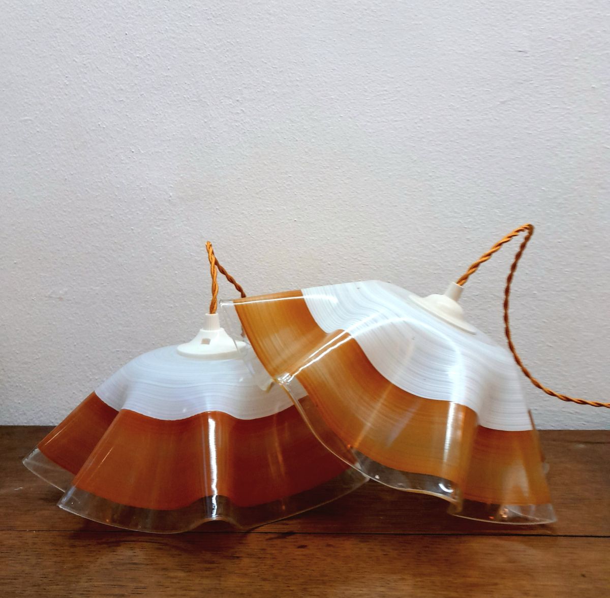 Paire de globes en verre ondulé bicolore blanc et orange à petites rayures, montée à l'électricité en suspensions.