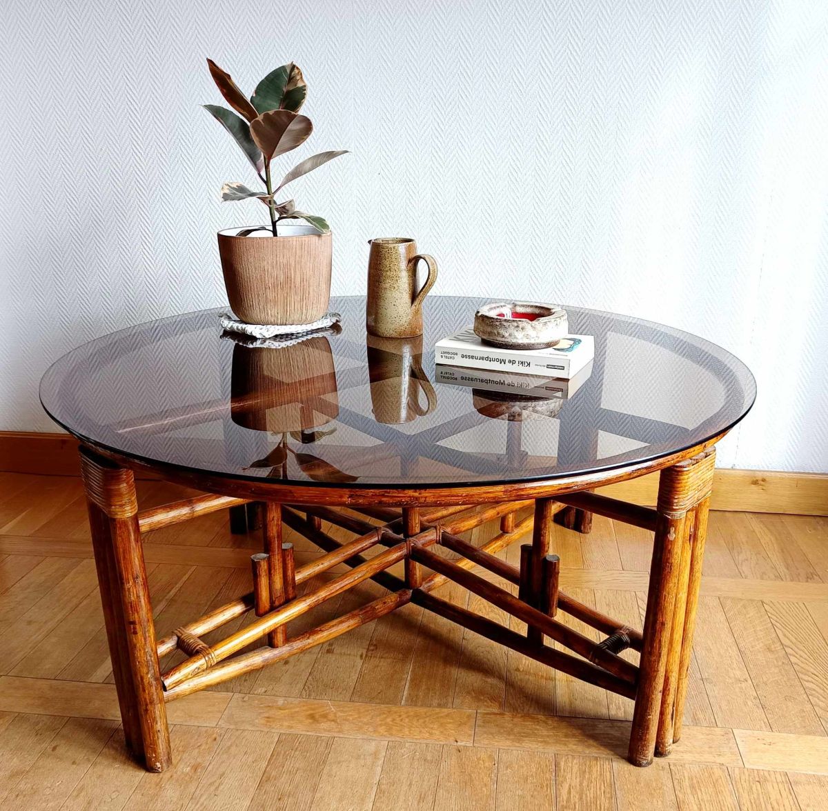 Structure en X en rotin et tressage aux jointures. Systèmes de taquets pivotants en rotin sur chacun des pieds permettant de monter la table en hauteur, faisant de la table basse, une table d'appoint. Le tout avec un grand verre fumé en parfait état de 120 cm de diamètre.