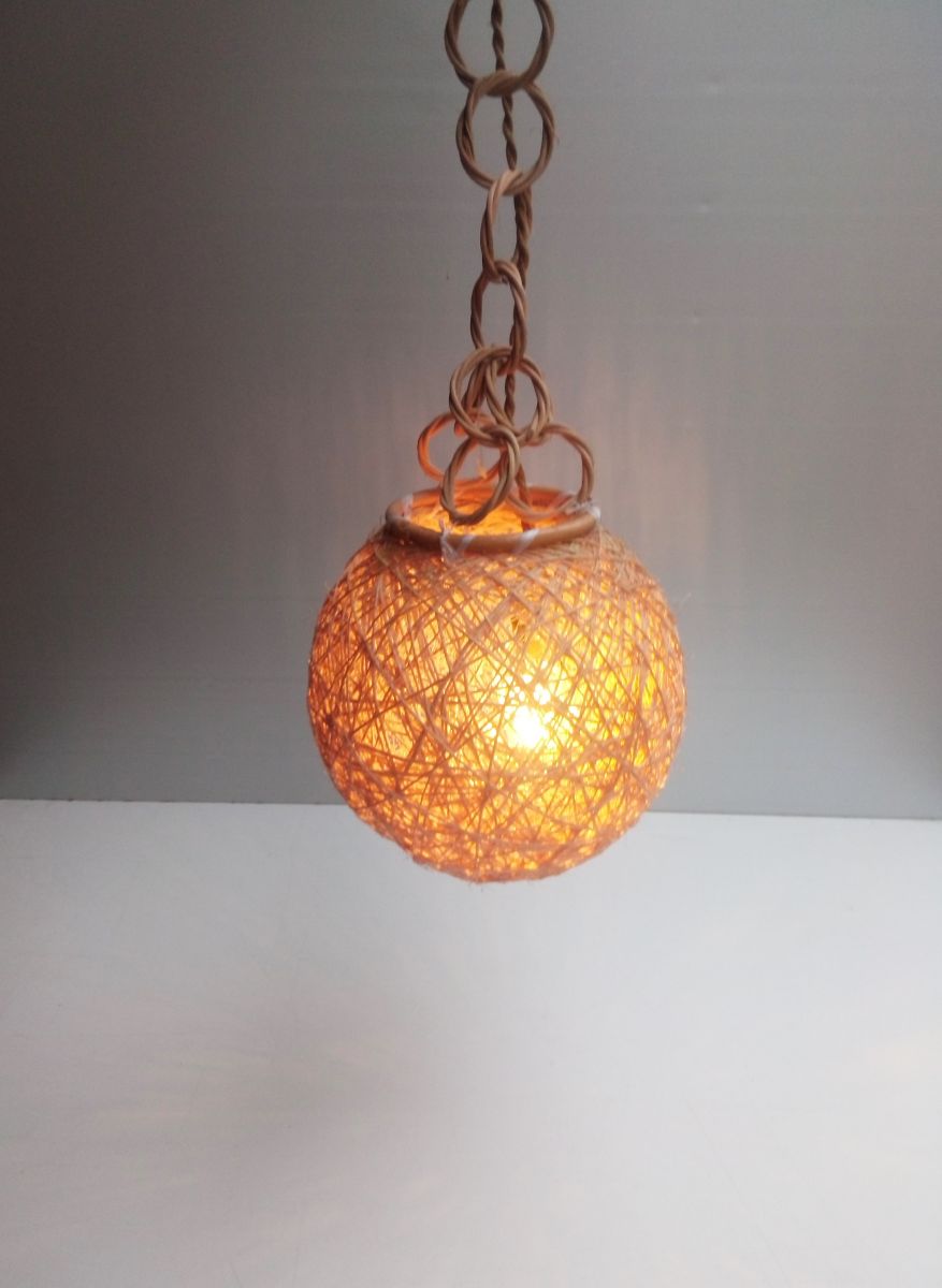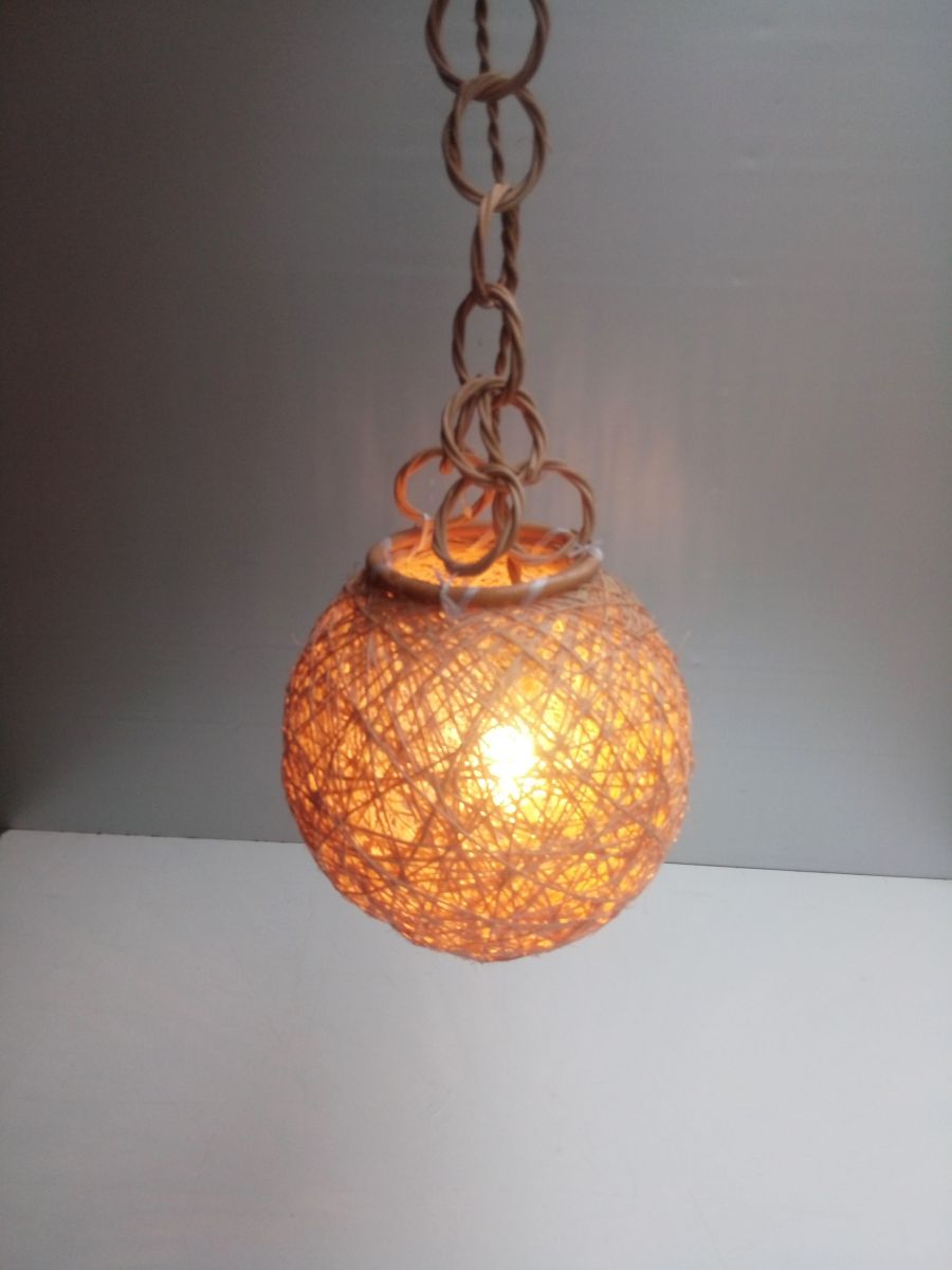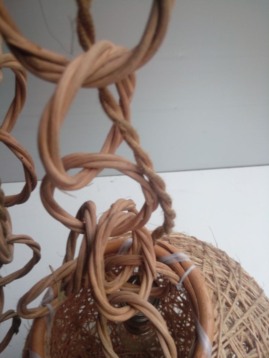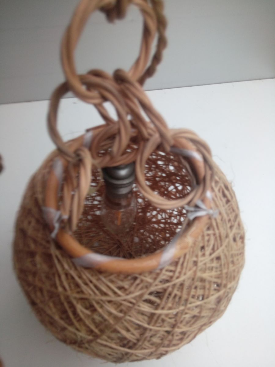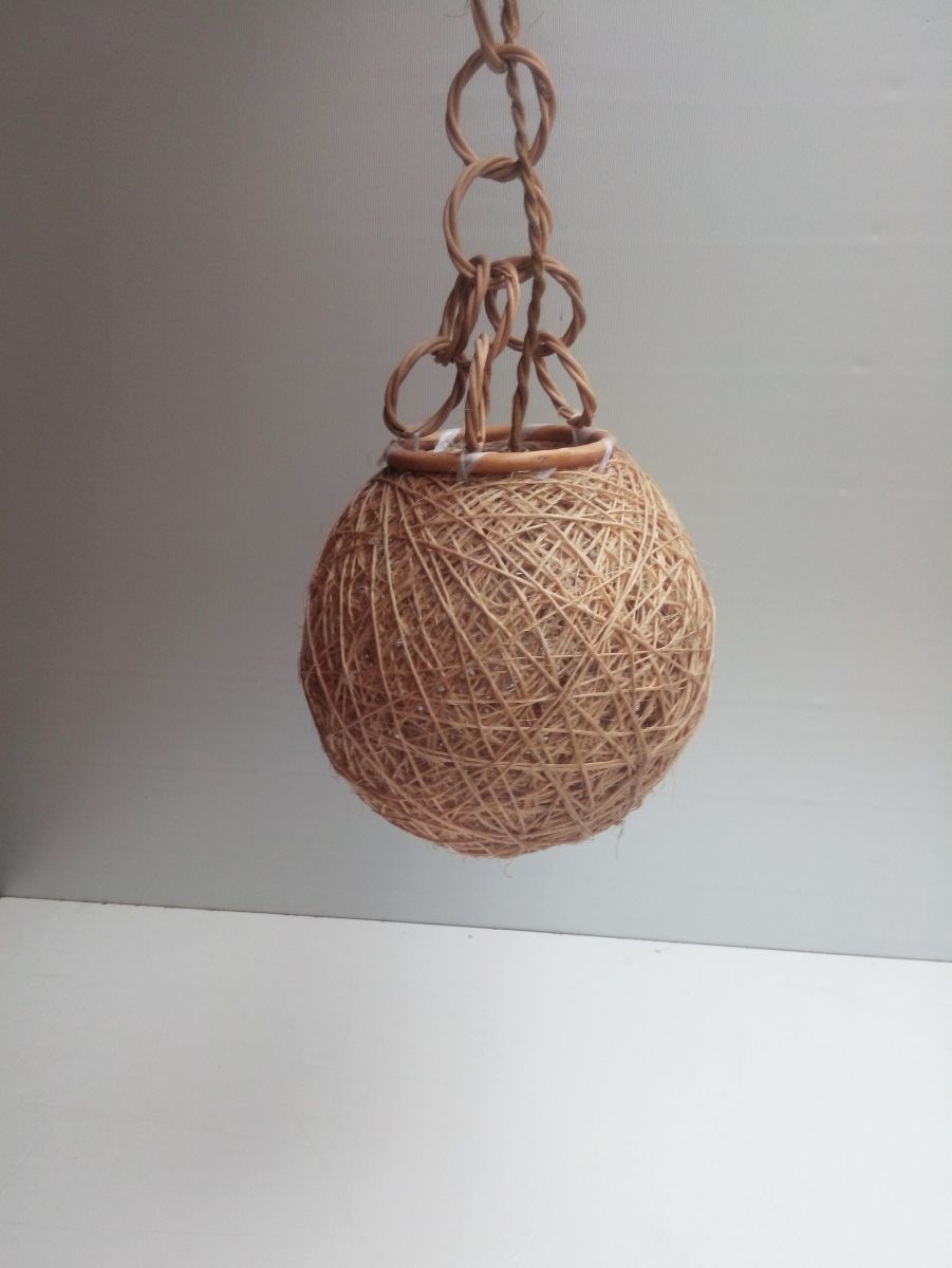 Jolie suspension vintage composé d'une boule en corde entremêlée et d'une suspension faite d’anneaux en rotin.
