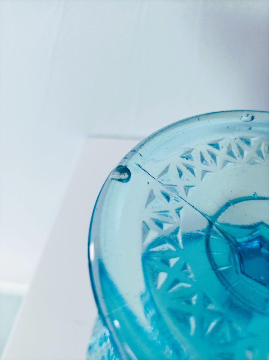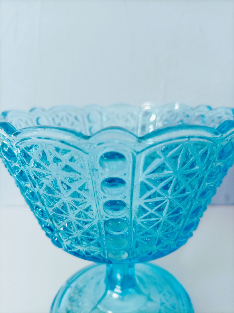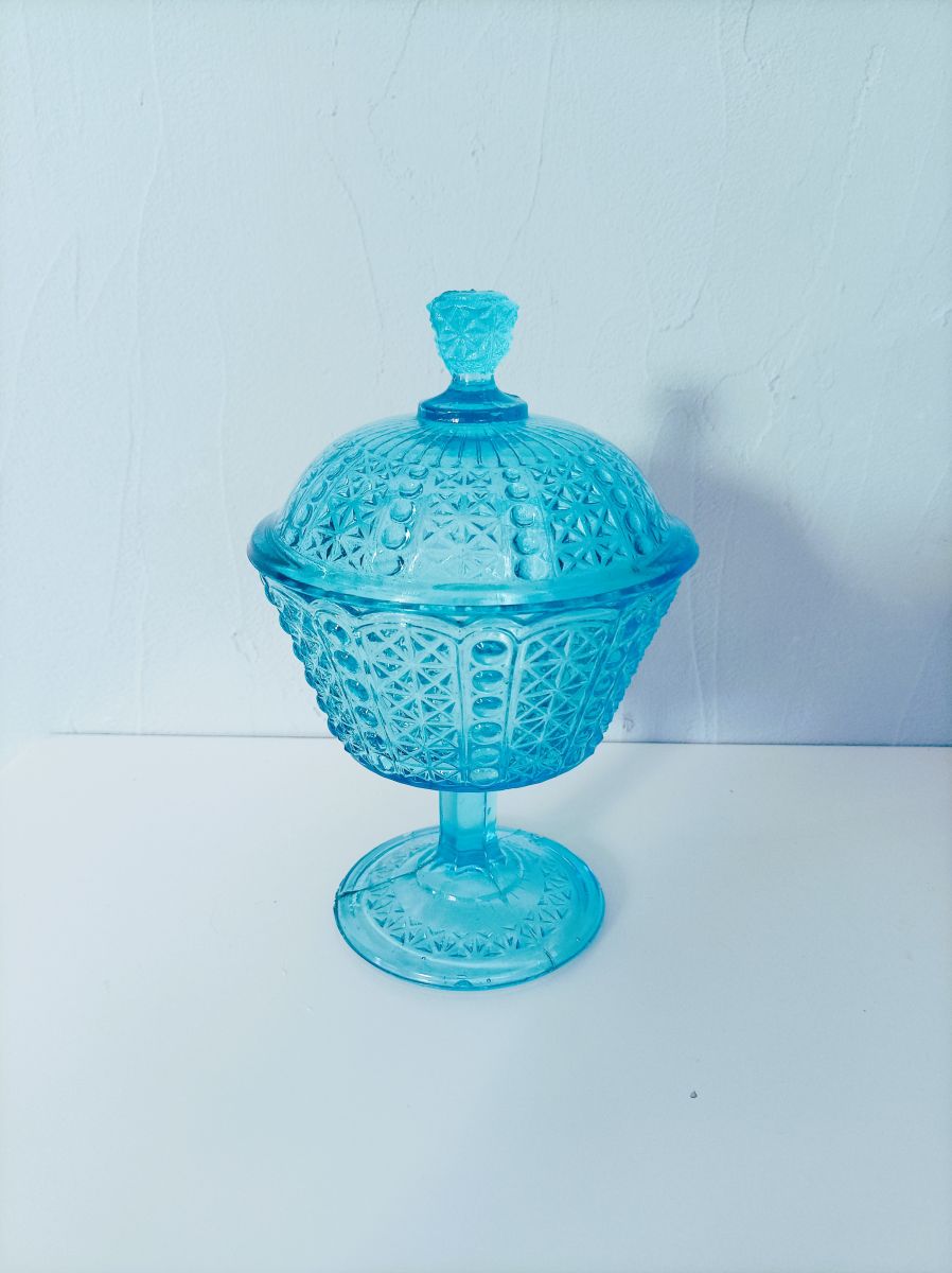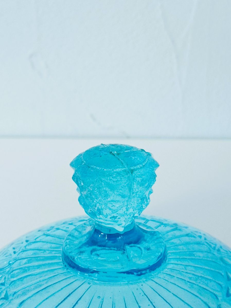 Ce drageoir ressemble à une fleur présenté sans son couvercle, avec sa couleur bleue il a beaucoup de charme et est un bel élément décoratif qui peut être utilisé aussi pour ranger des cotons ou des sels de bain dans votre salle d'eau ou comme boîte à bijoux.