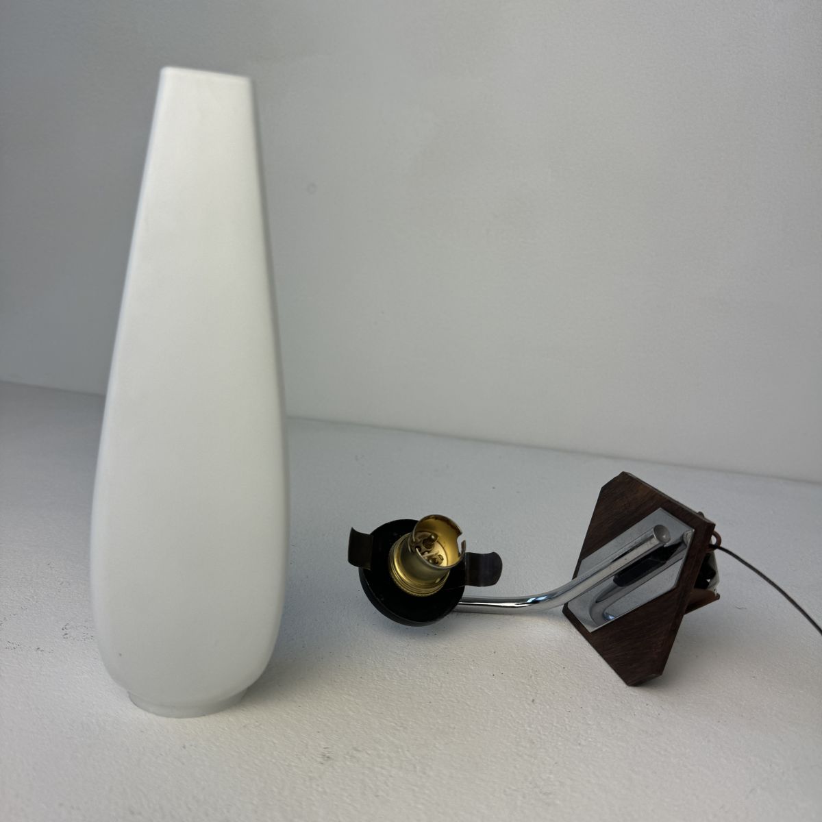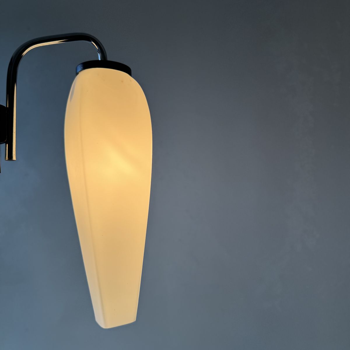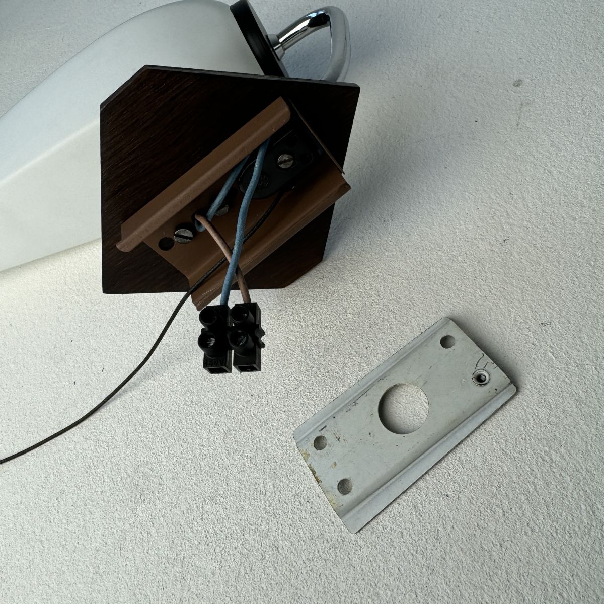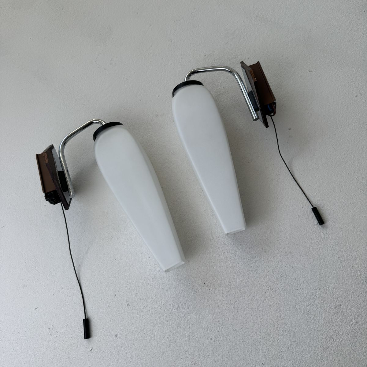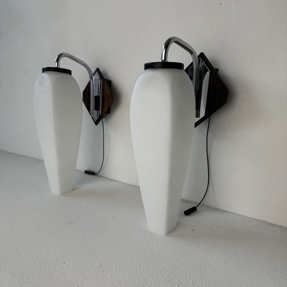 Lot de 2 belles appliques scandinaves en opaline teck et métal. Années 1960. Bon état général et belle lumière. Interrupteur à tirette.