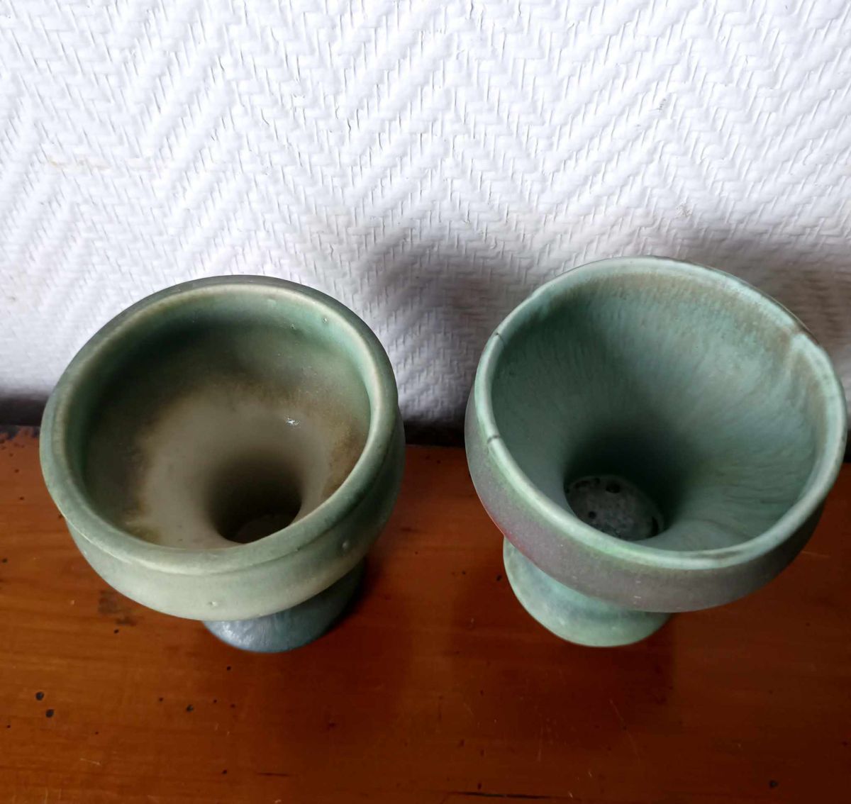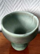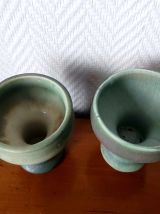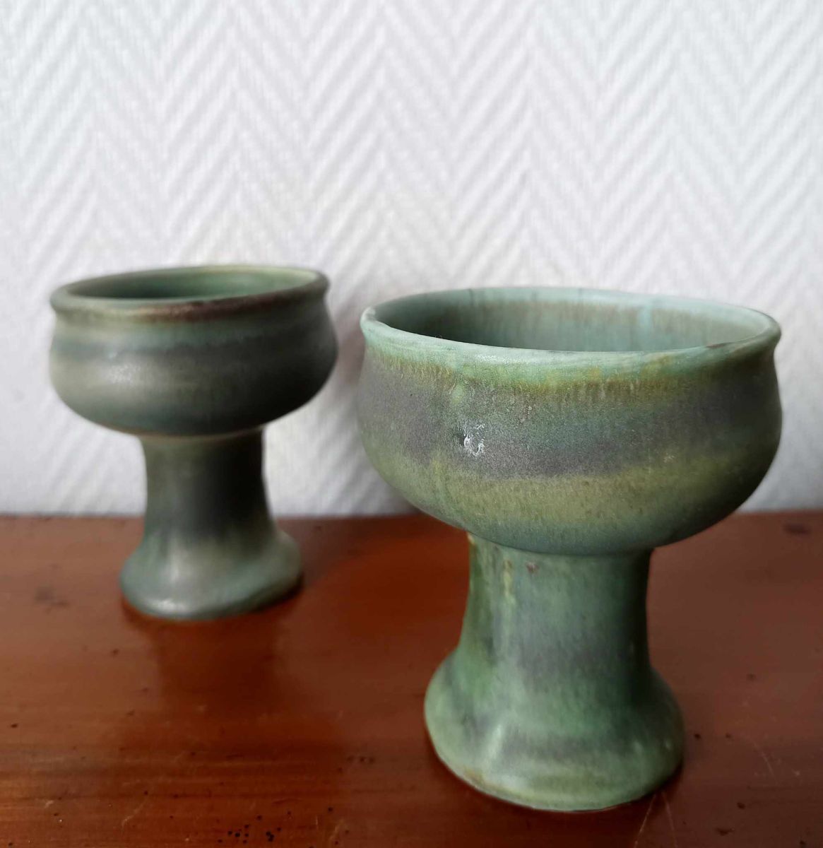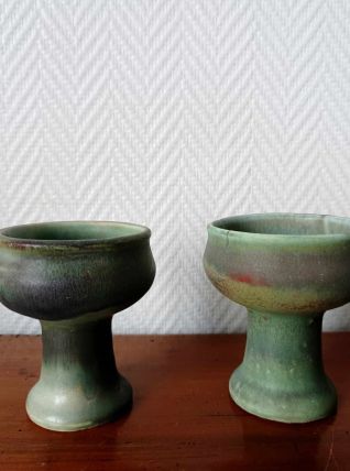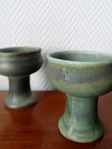 Bougeoirs sur pied à col large en céramique émaillée verte. Superbe travail dans les différentes nuances allant du vert d'eau au turquoise. L'un d'eux est marqué en creux au revers.