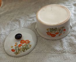 très joli visuel aux belles couleurs. hauteur avec couvercle: 9.30 cm. diamètre avec anse: 14 cm. Très bel article. Sur photo 1 ce qui peut sembler être un éclat n'en n'ai pas un, c'est une très légère boursouflure. Plein de choses en vente, Vendeur sérieux et rapide.