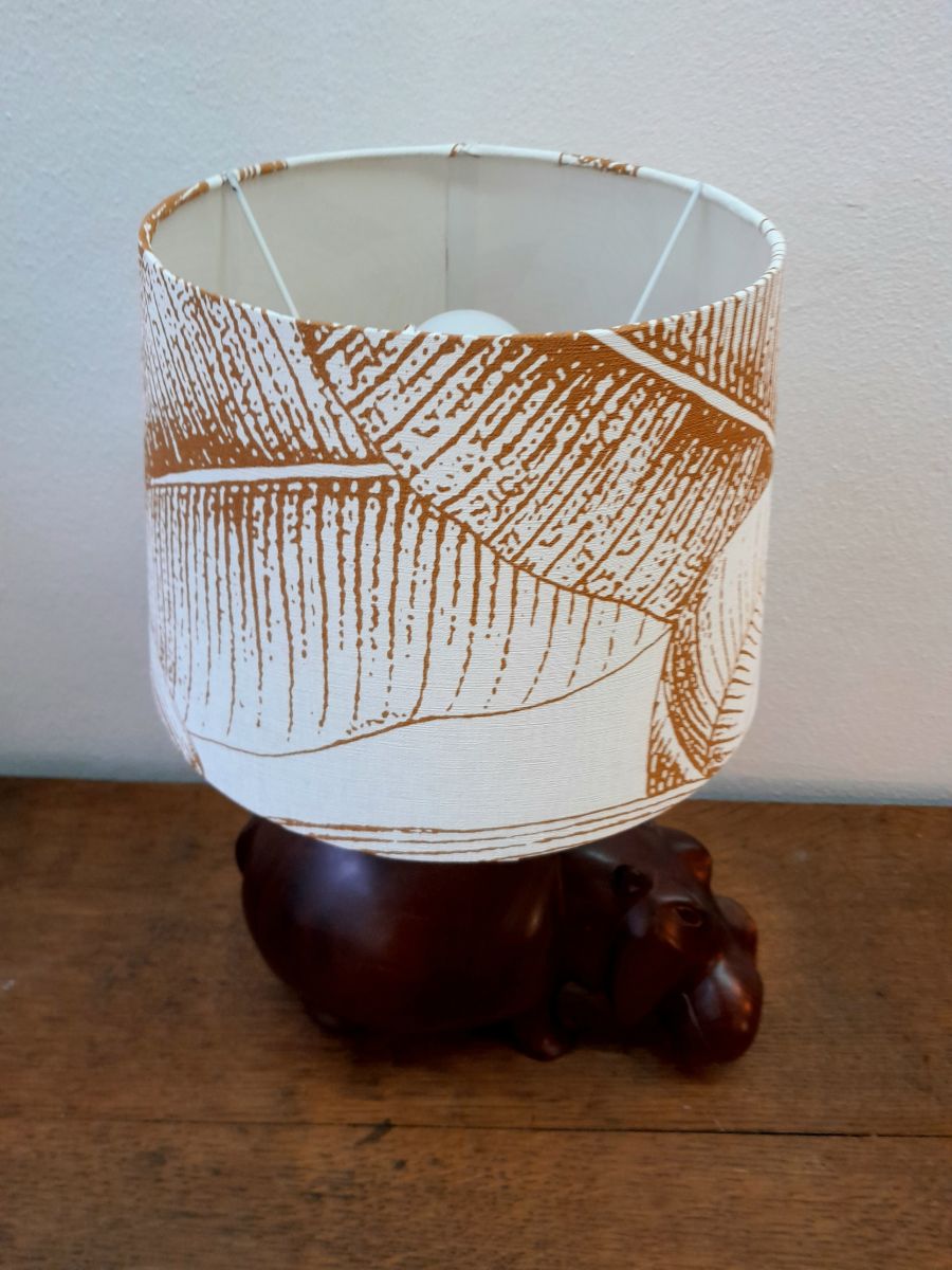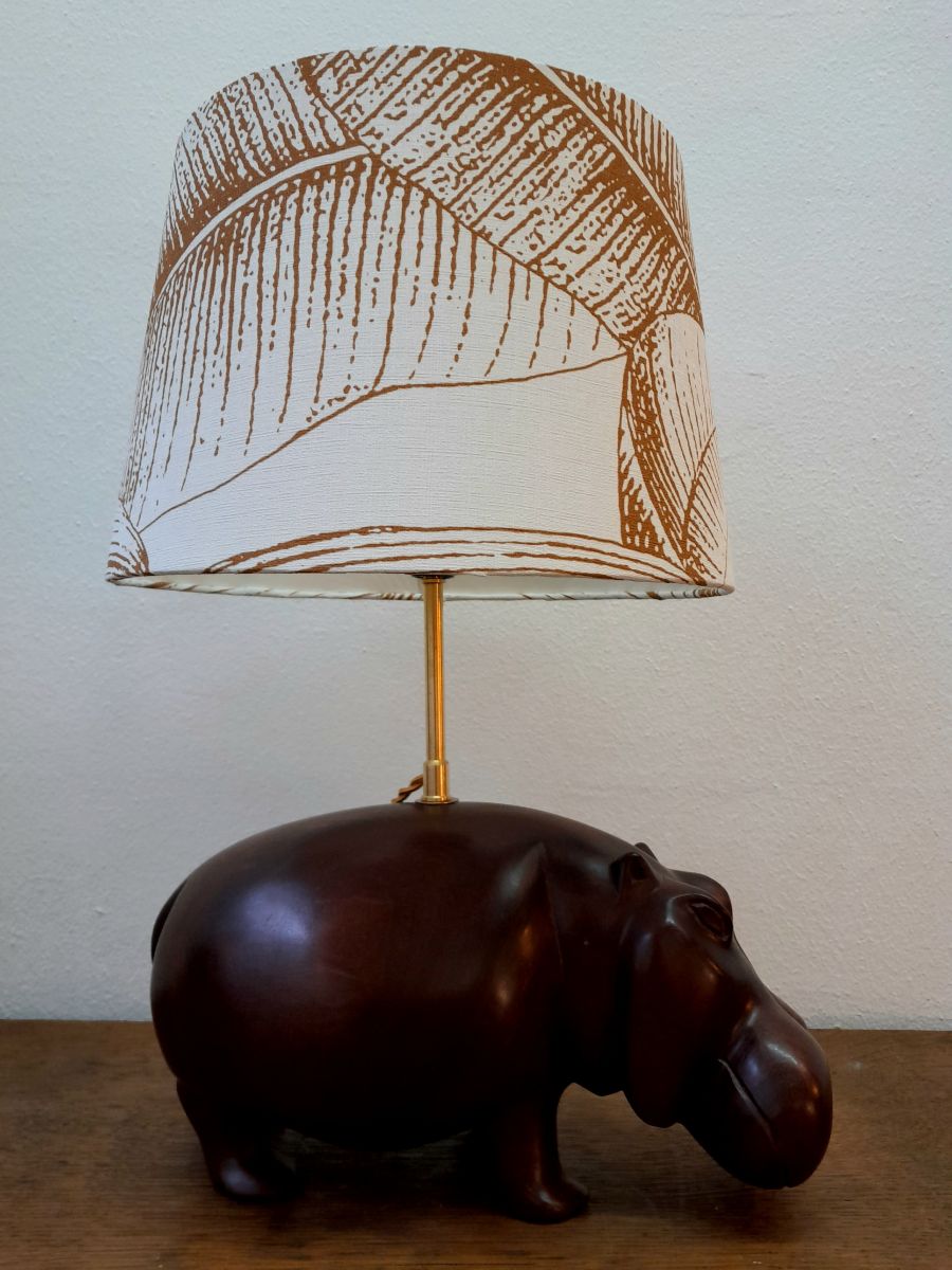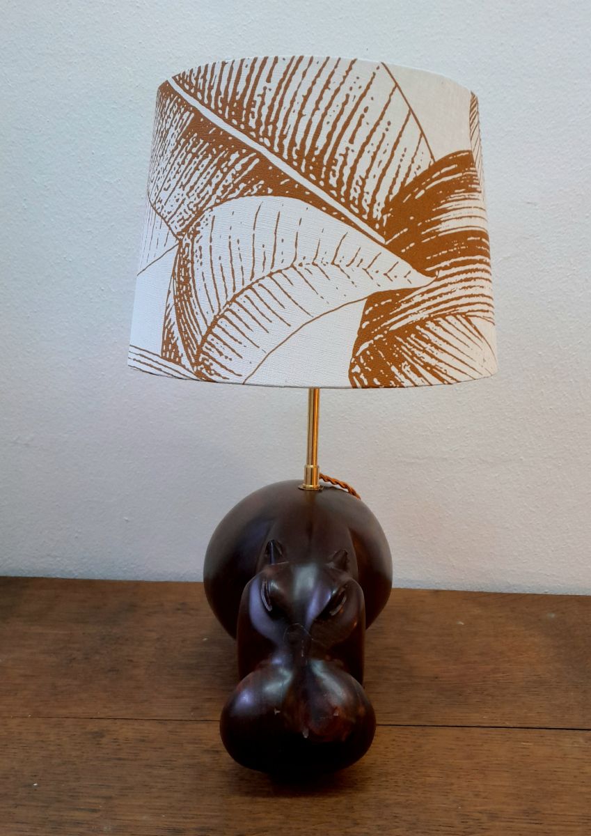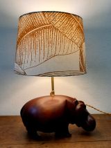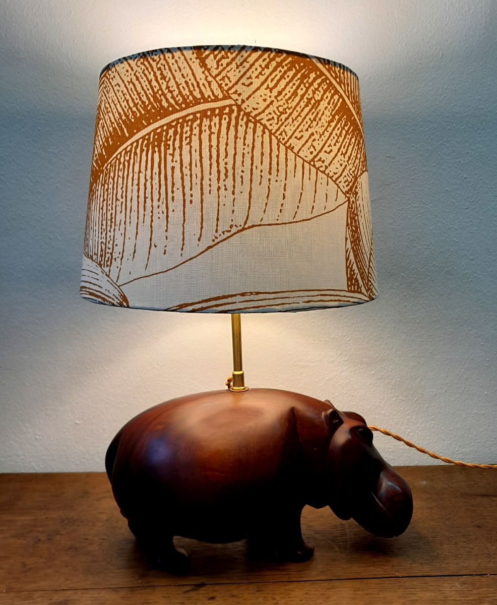 Hippopotame en bois exotique massif monté en lampe avec abat-jour à décor de feuilles de bananier. Tige en laiton doré.
