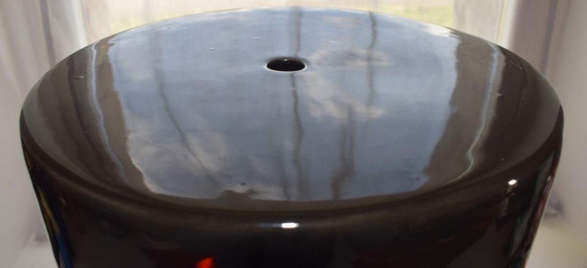 Un tabouret en céramique tricolore, noir, sable et rouge, avec 3 patins de protection sous le socle.
