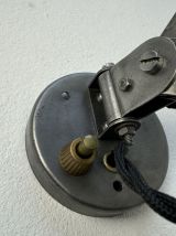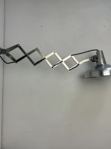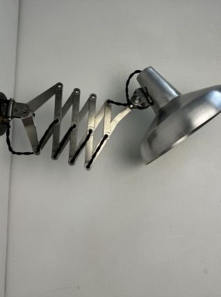 Petite lampe accordéon d’atelier. Années 1950. Déplacement de haut en bas et de gauche à droite sur l’axe de fixation mural. Articulation possible du réflecteur. Quelques traces du temps.