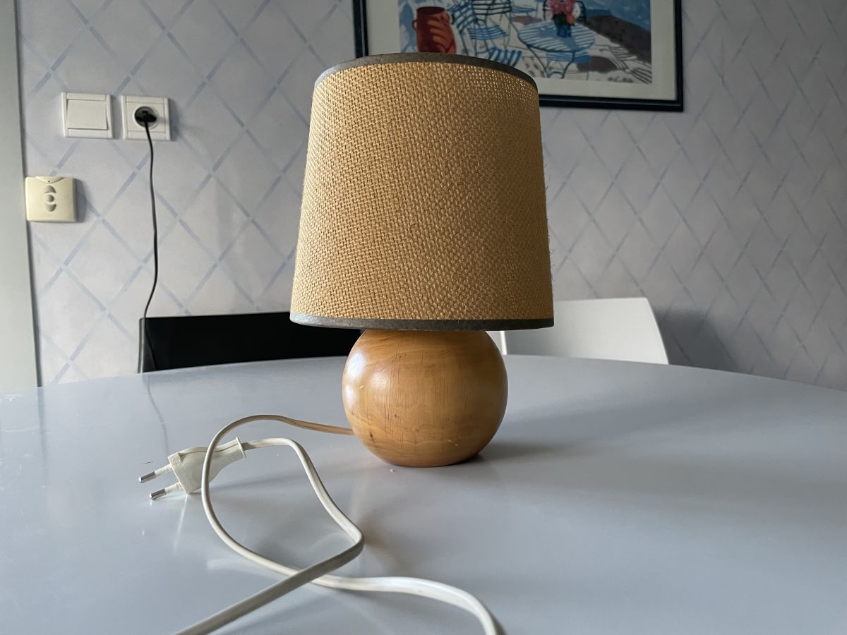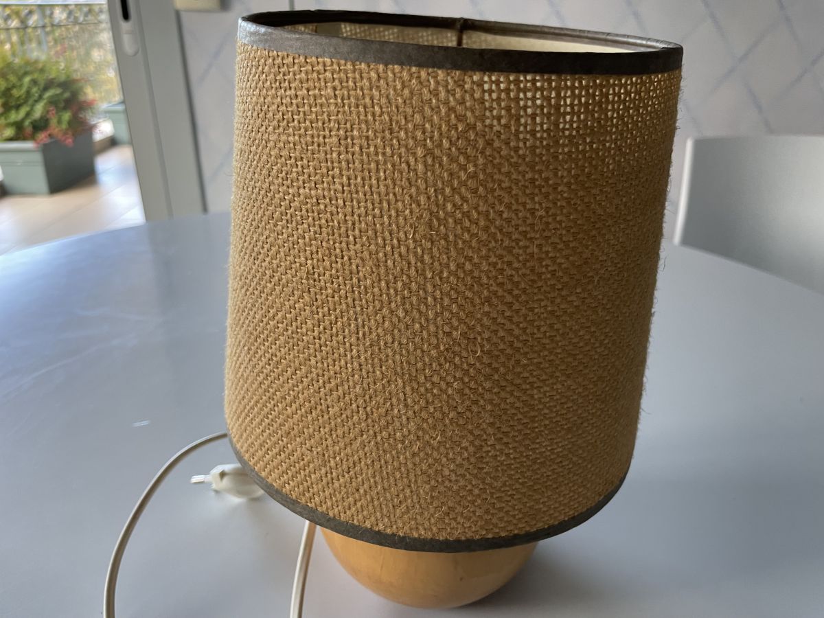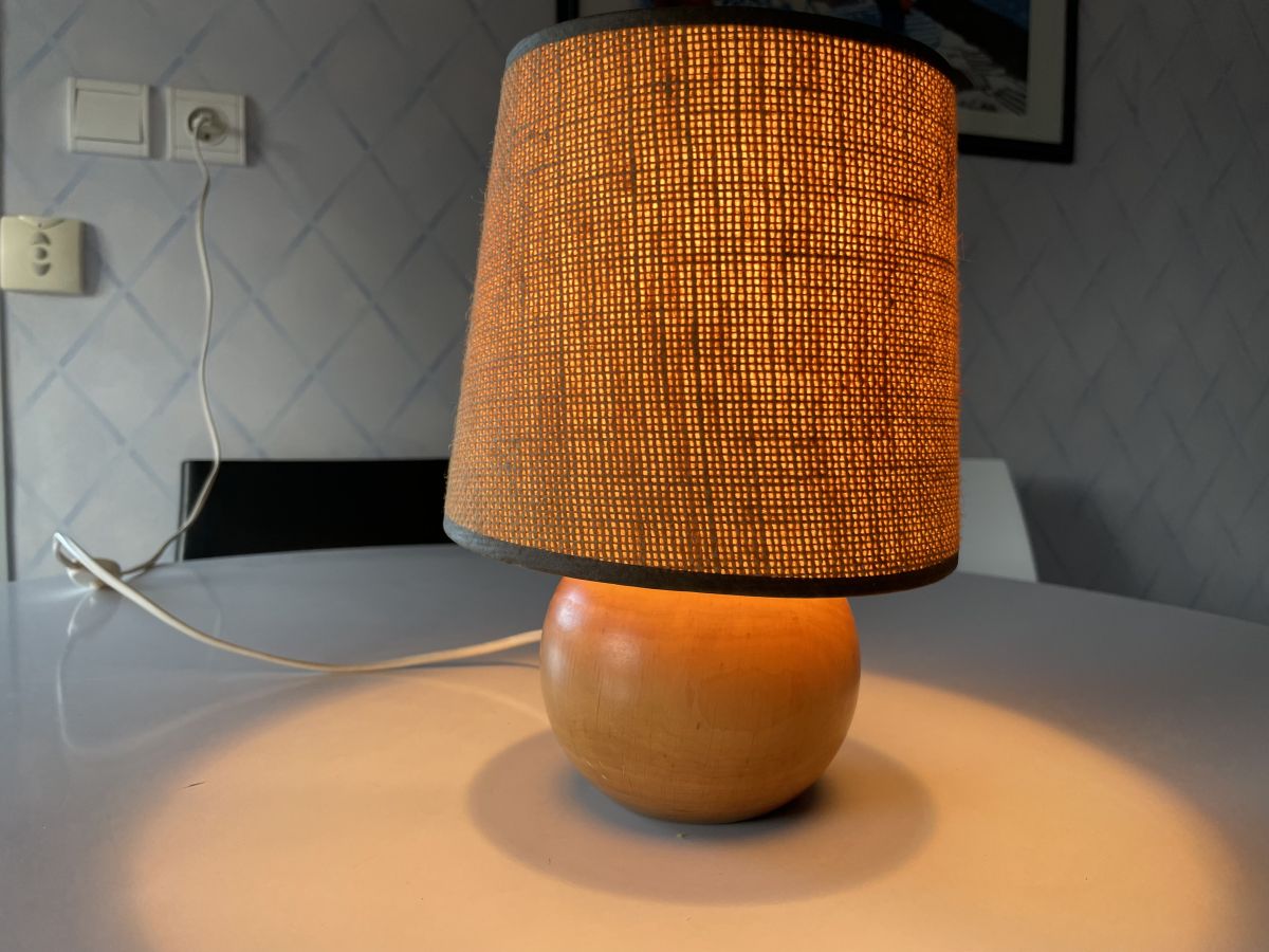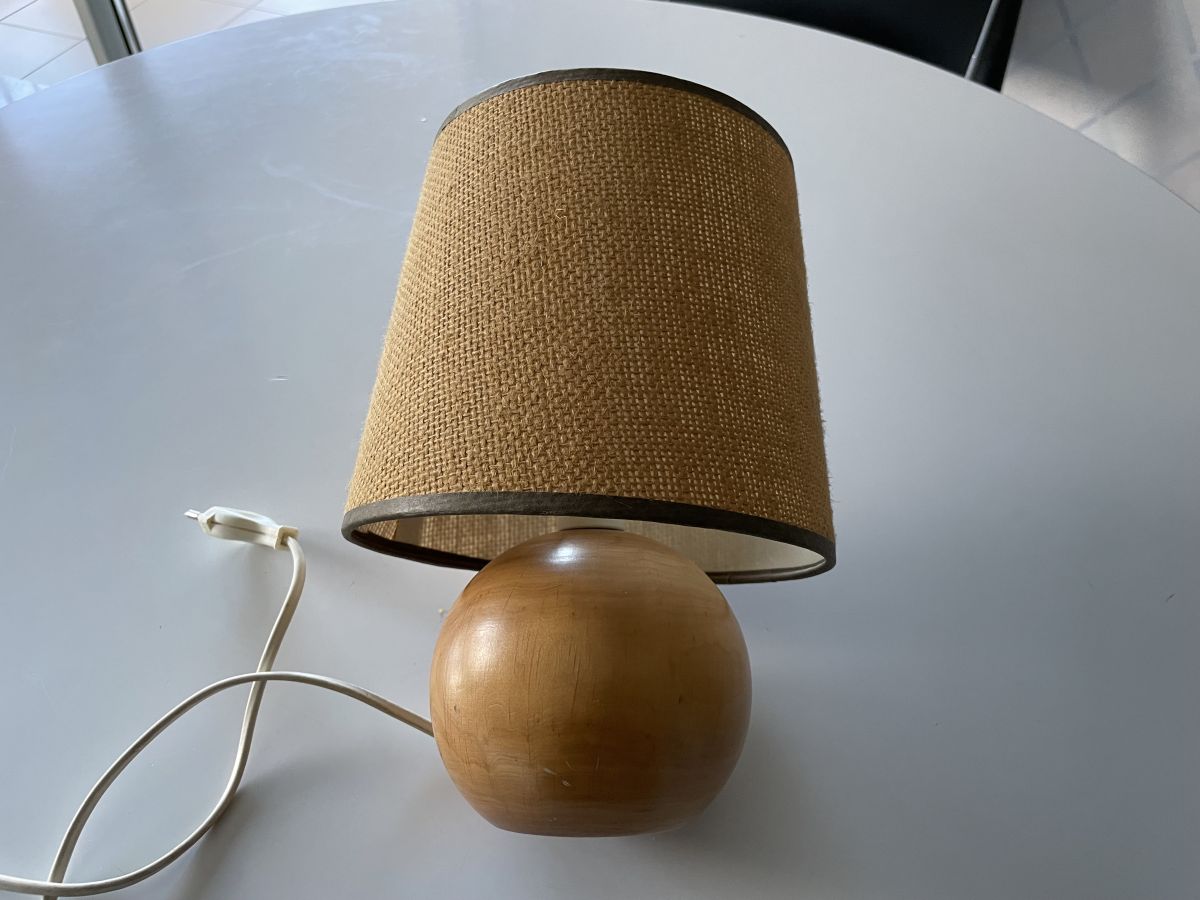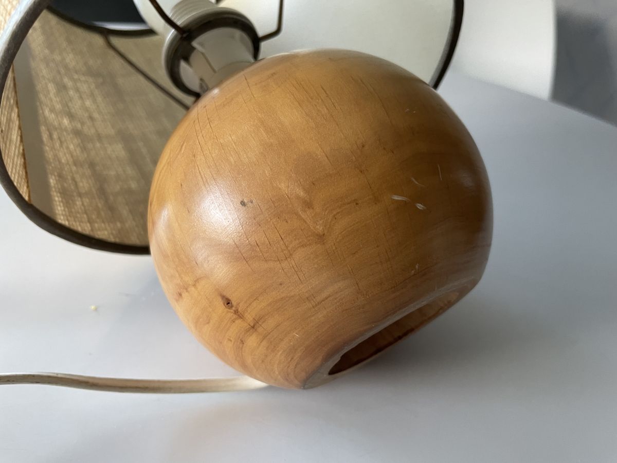 Lampe boule à poser en bois massif clair des années 70, hauteur 25cm, diamètre socle 11cm, diamètre abat-jour 16cm, bon état.