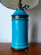 Ancienne lampe à pétrole en céramique bleu turquoise montée en lampe. Monture en étain à pieds griffes et bandeau de rinceaux sur le corps du cylindres. Le pied a été monté à l'électricité (propre et fonctionnelle) et garnit d'un abat-jour fait main (artisan certifiée) à décor végétal dans les tons bleu et doré.